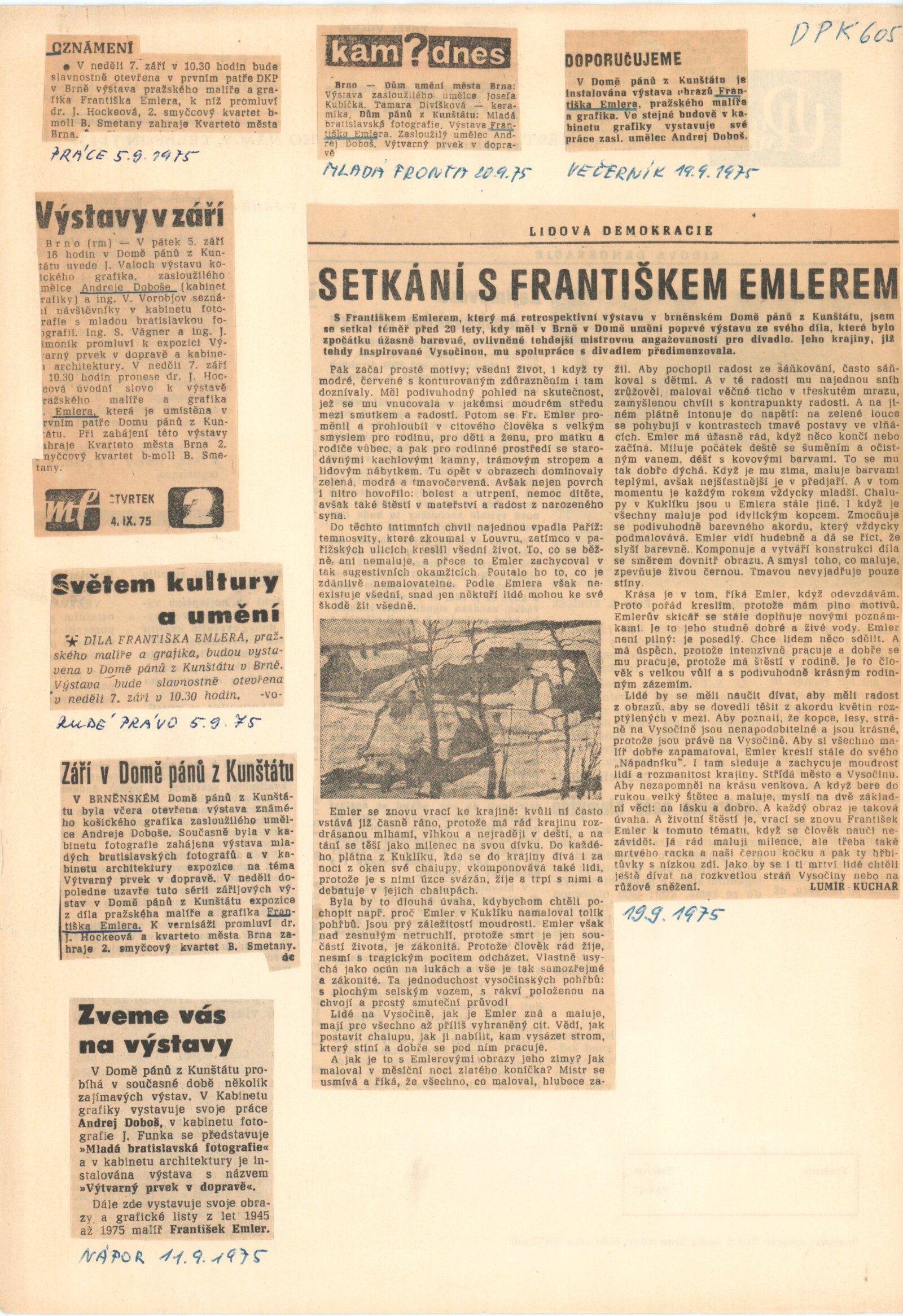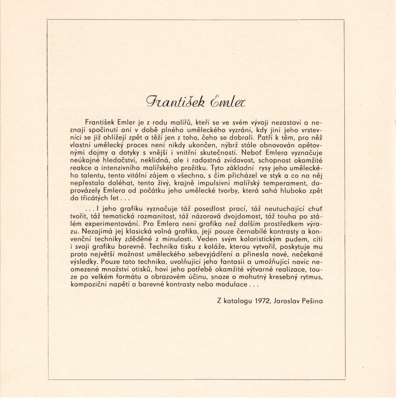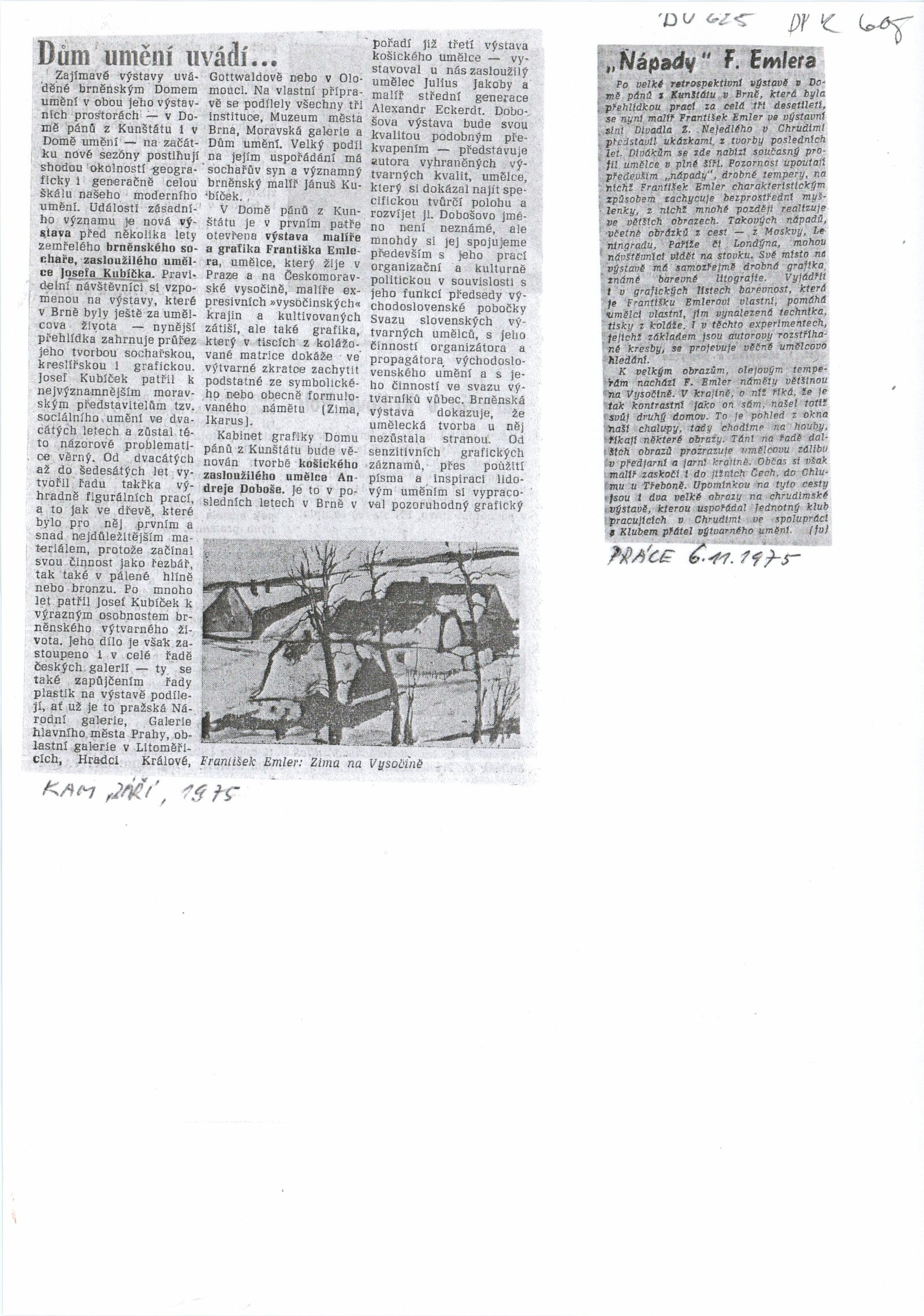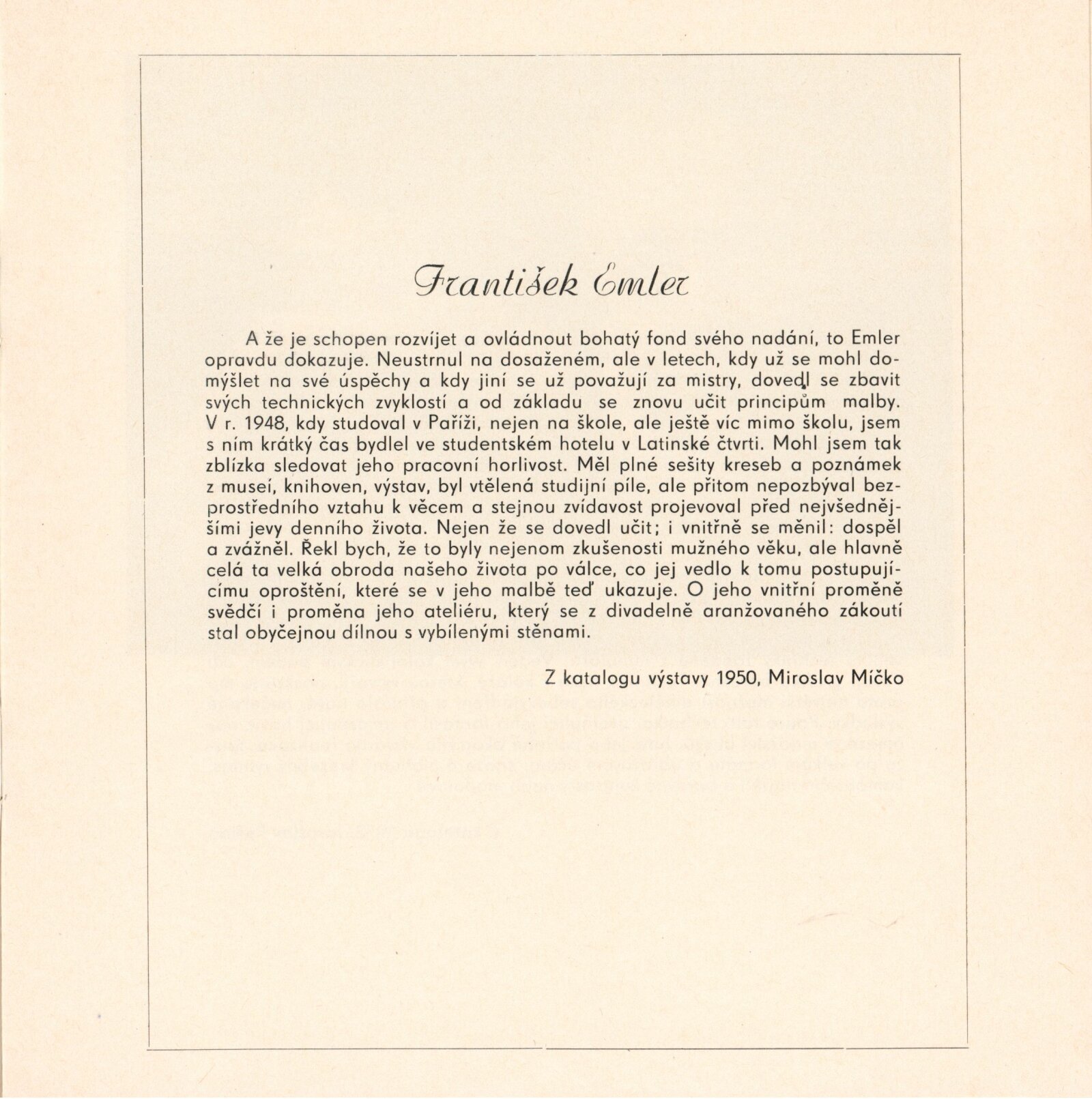 František Emler: Dům umění / Dům pánů z Kunštátu, 7. 9. – 28. 9. 1975 / Text: Olga Spalová. – Brno: DUmB, 1975. – 16 s., obr., seznam vystavených prací 2 s., portrét, životopis, DPK 605. – MMB