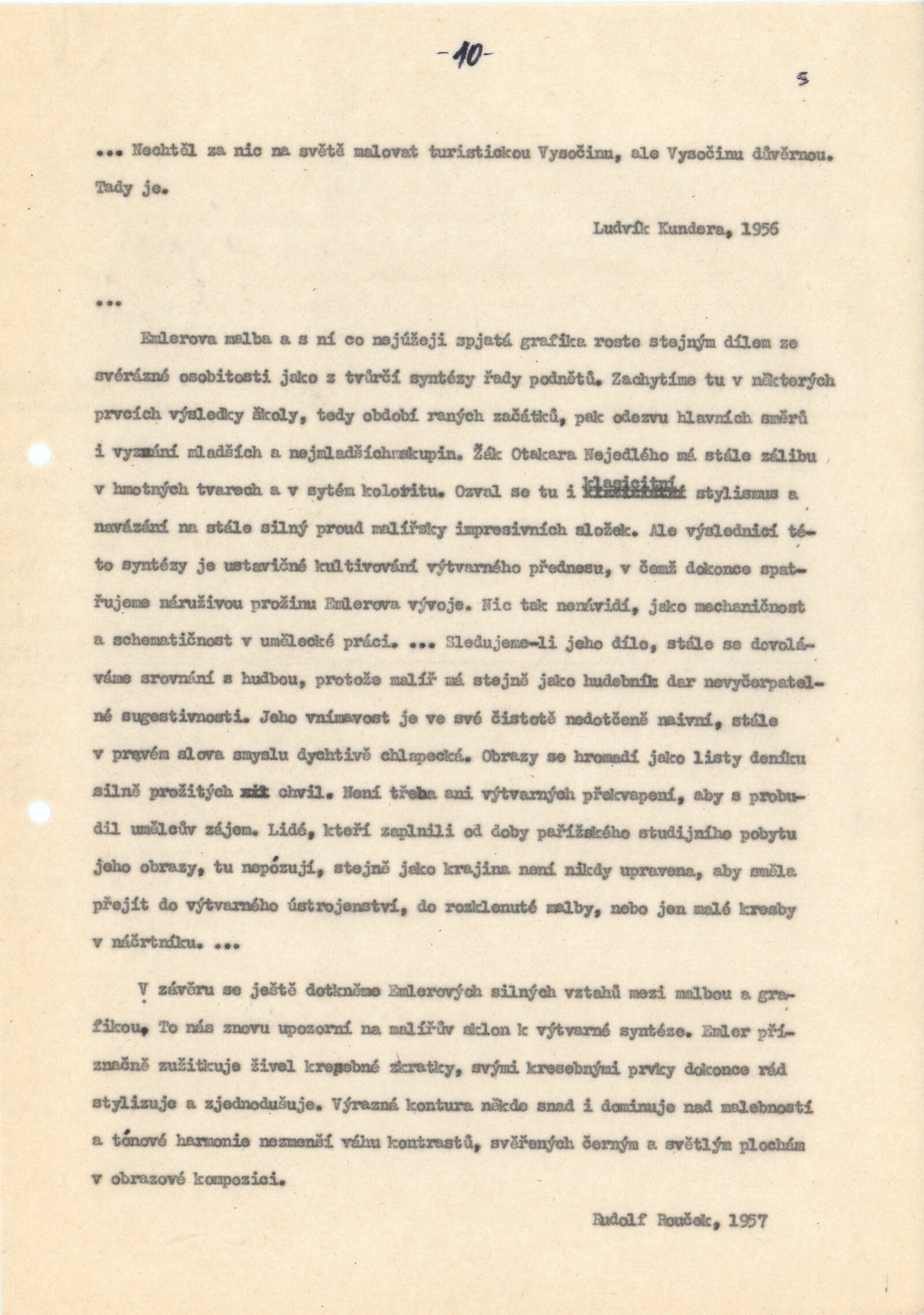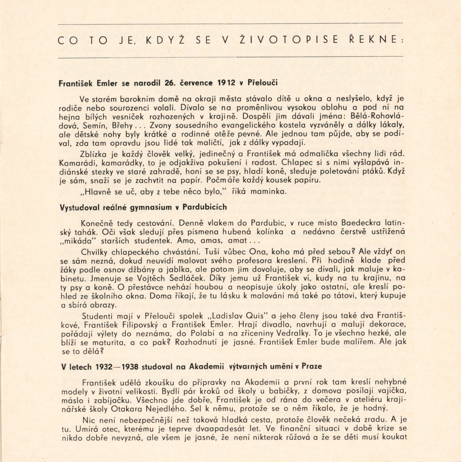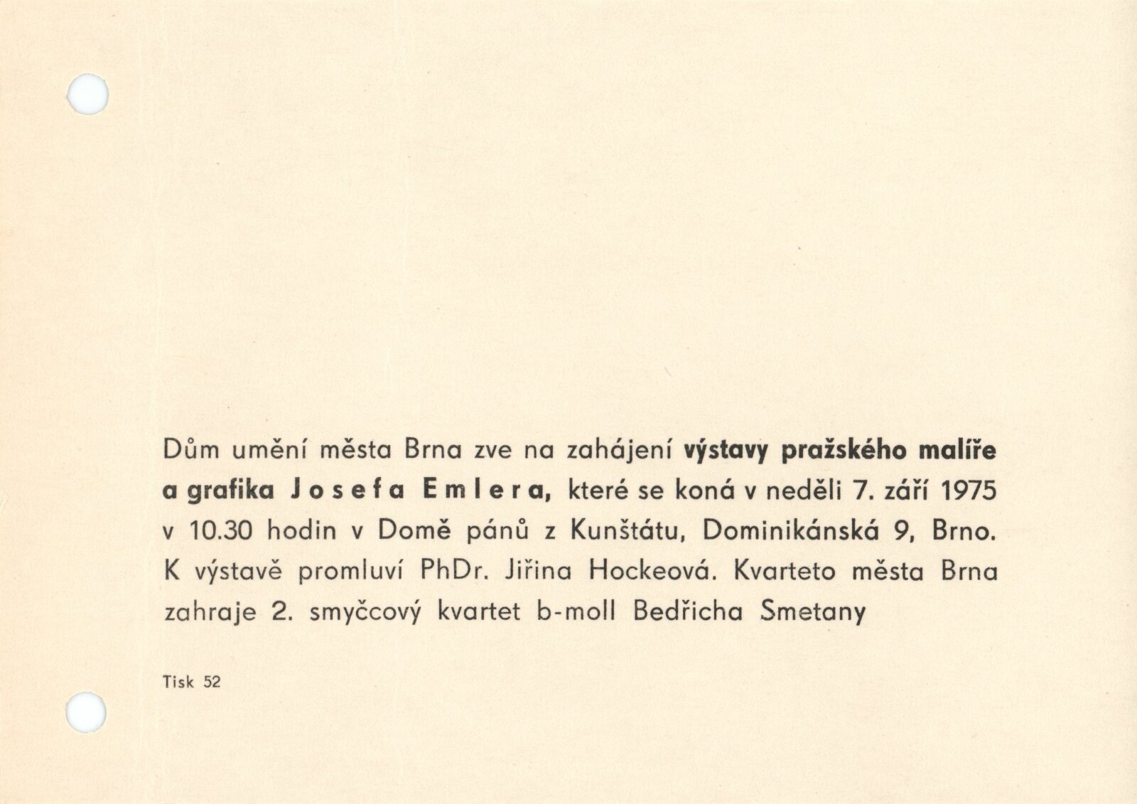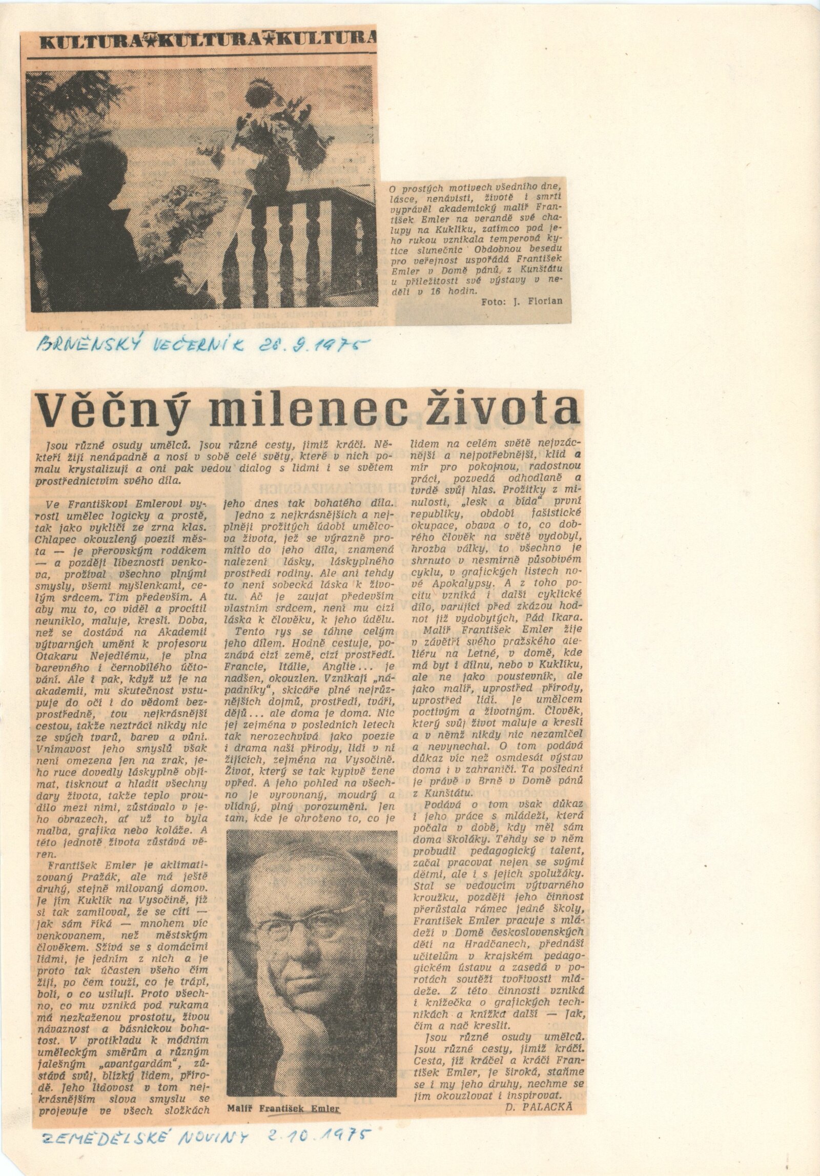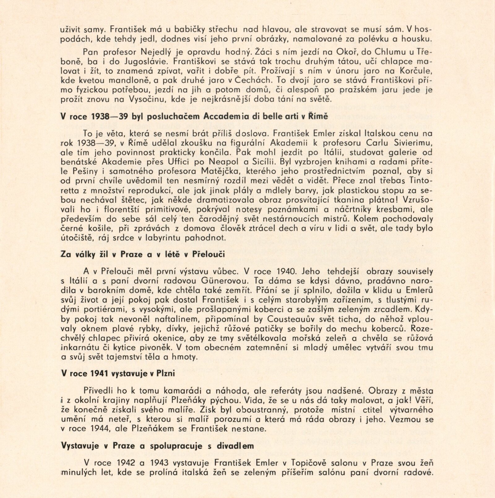 František Emler: Dům umění / Dům pánů z Kunštátu, 7. 9. – 28. 9. 1975 / Text: Olga Spalová. – Brno: DUmB, 1975. – 16 s., obr., seznam vystavených prací 2 s., portrét, životopis, DPK 605. – MMB