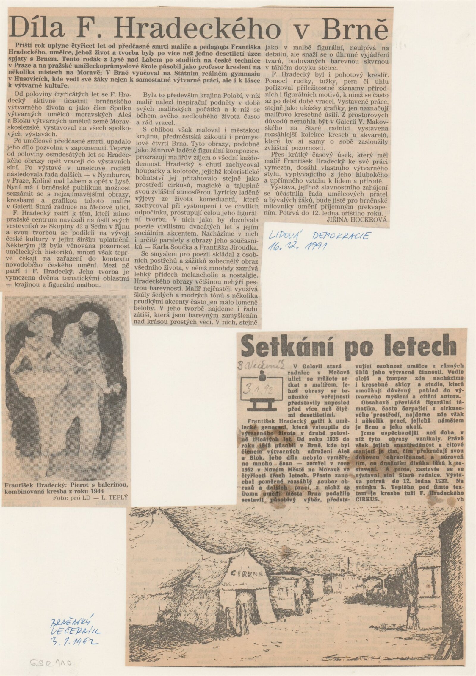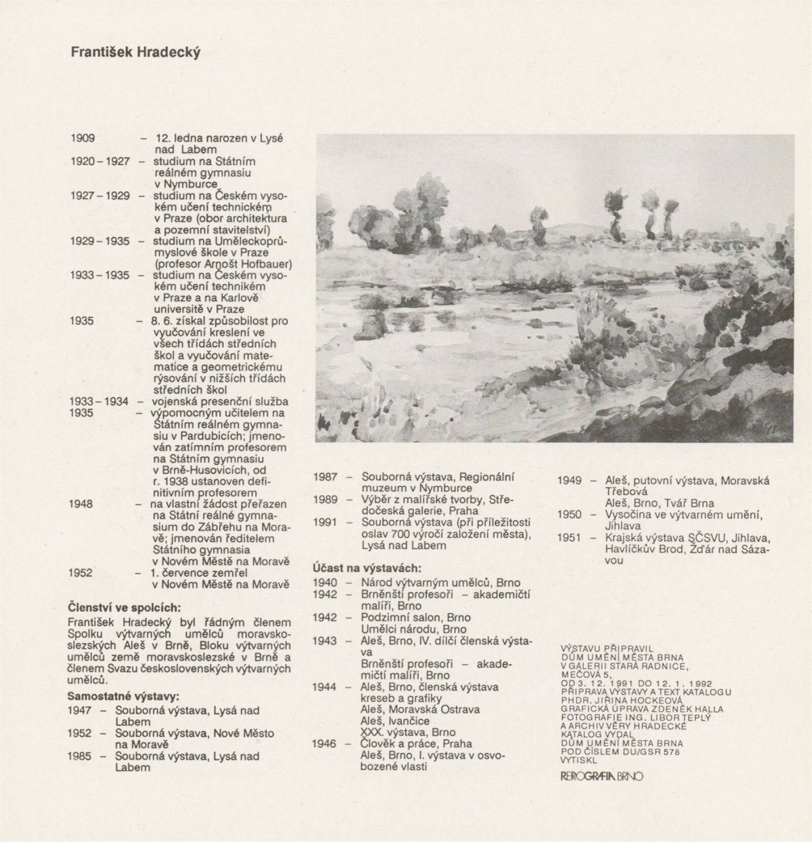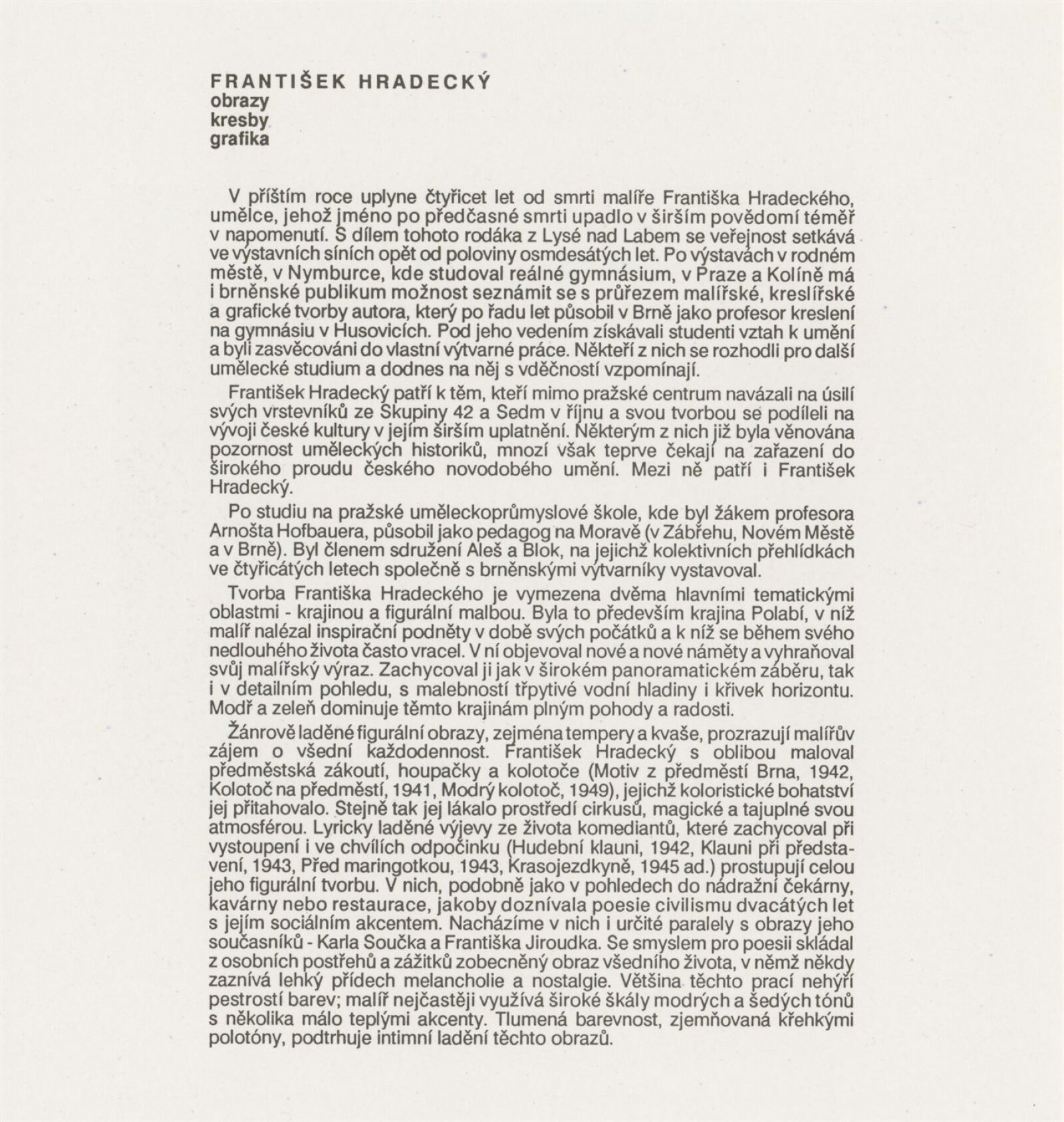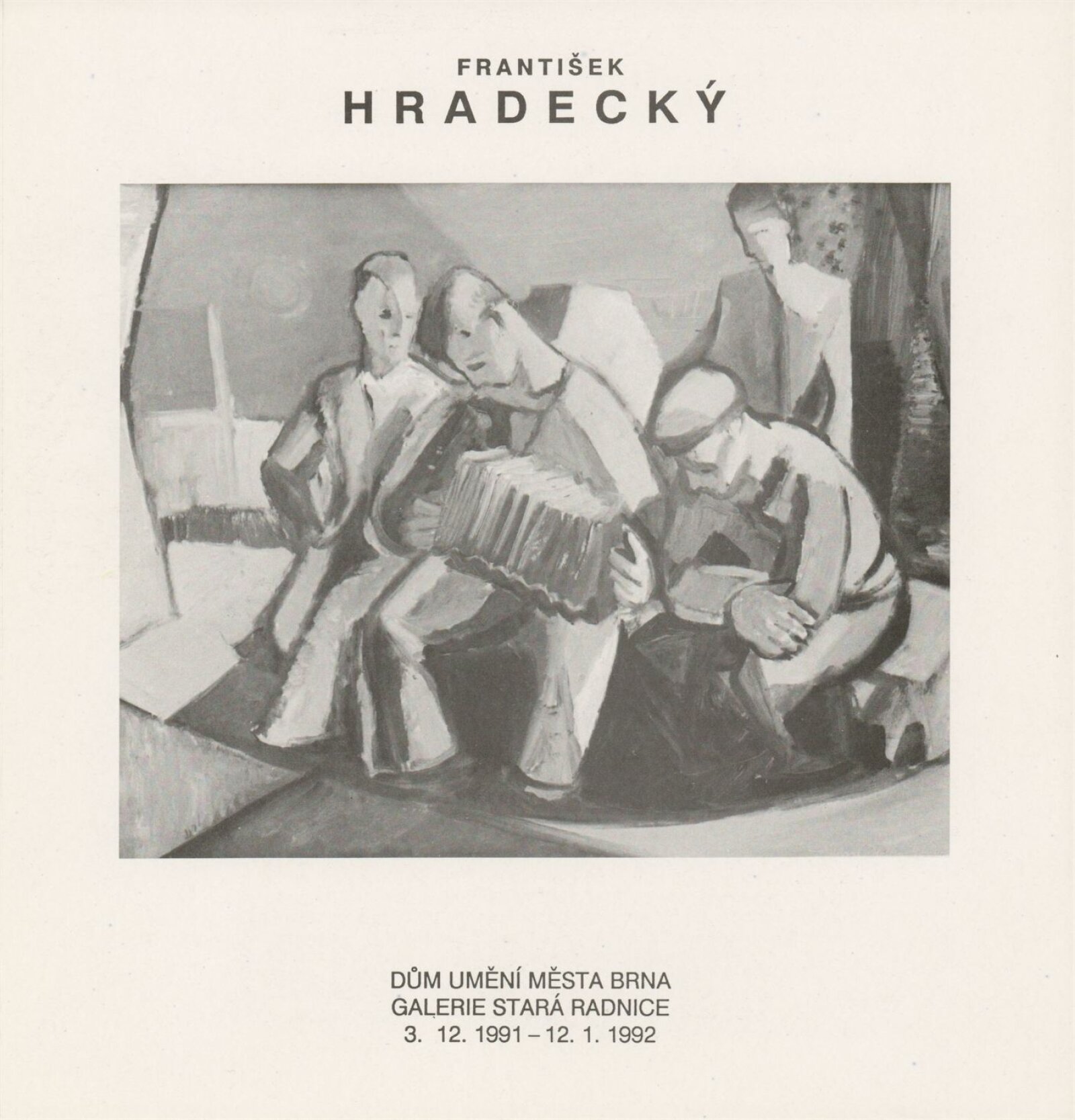 František Hradecký. Obrazy, kresby, grafika: Galerie Stará radnice, Síň Vincence Makovského, přízemí, 3. 12. 1991 – 12. 1. 1992 / Text: Jiřina Hockeová. – Brno: DUmB, 1991. – skládačka (6 s., obr.), životní data, výstavy, GSR 110