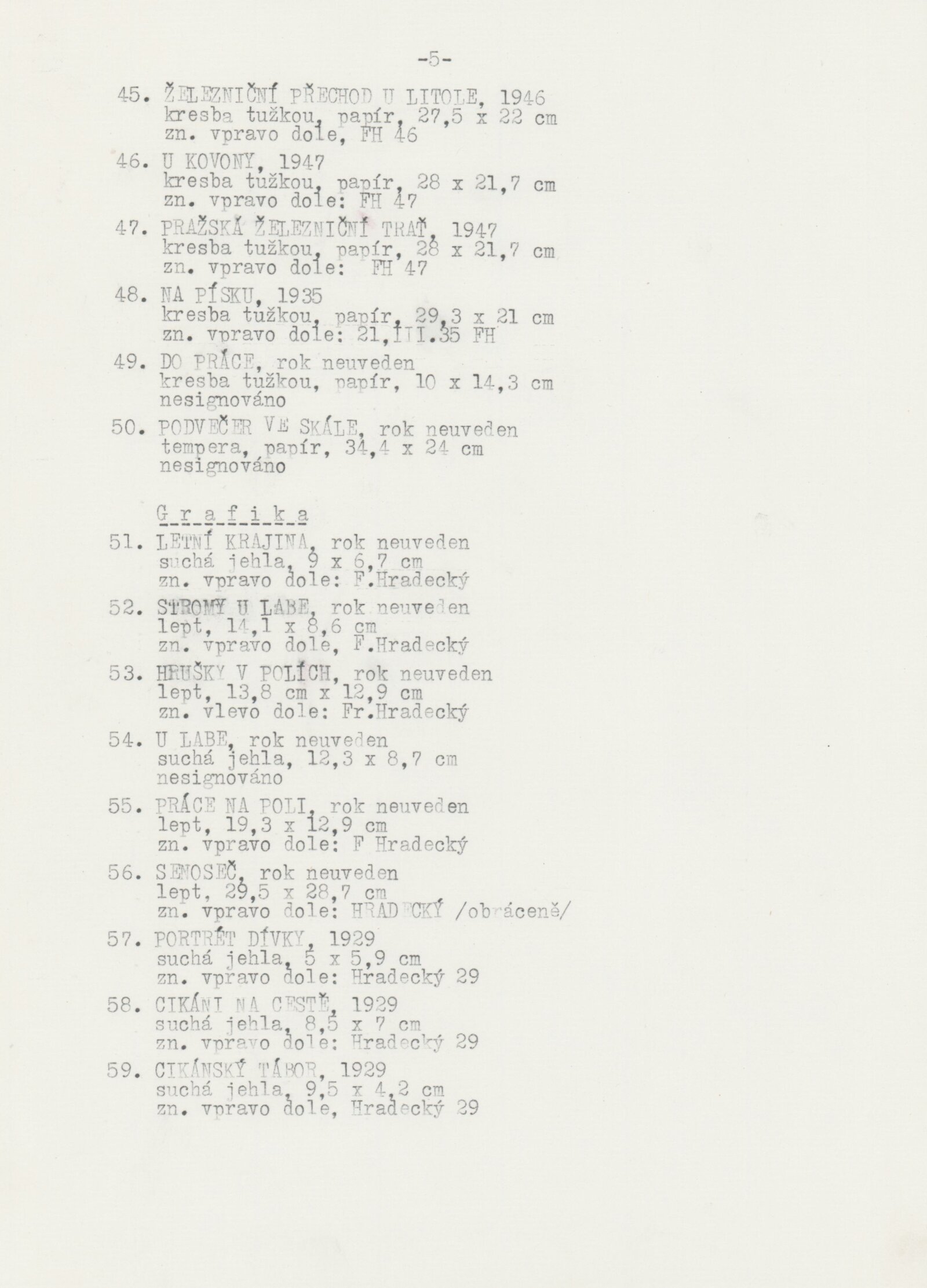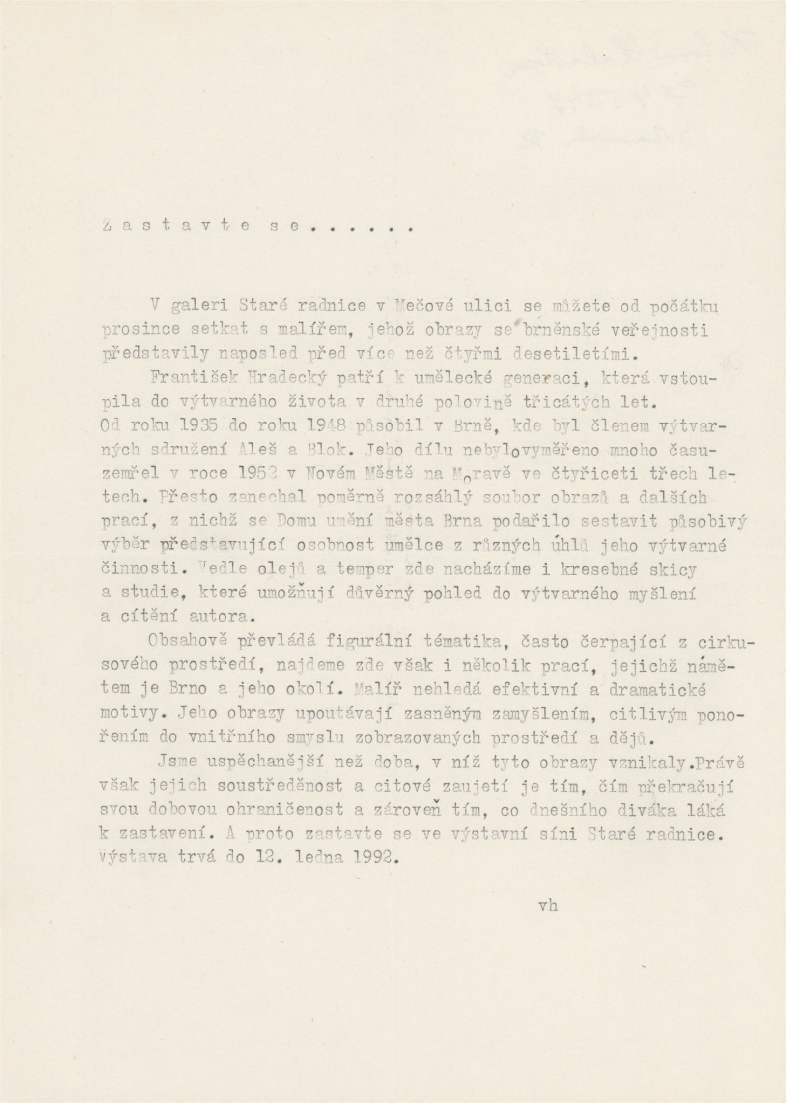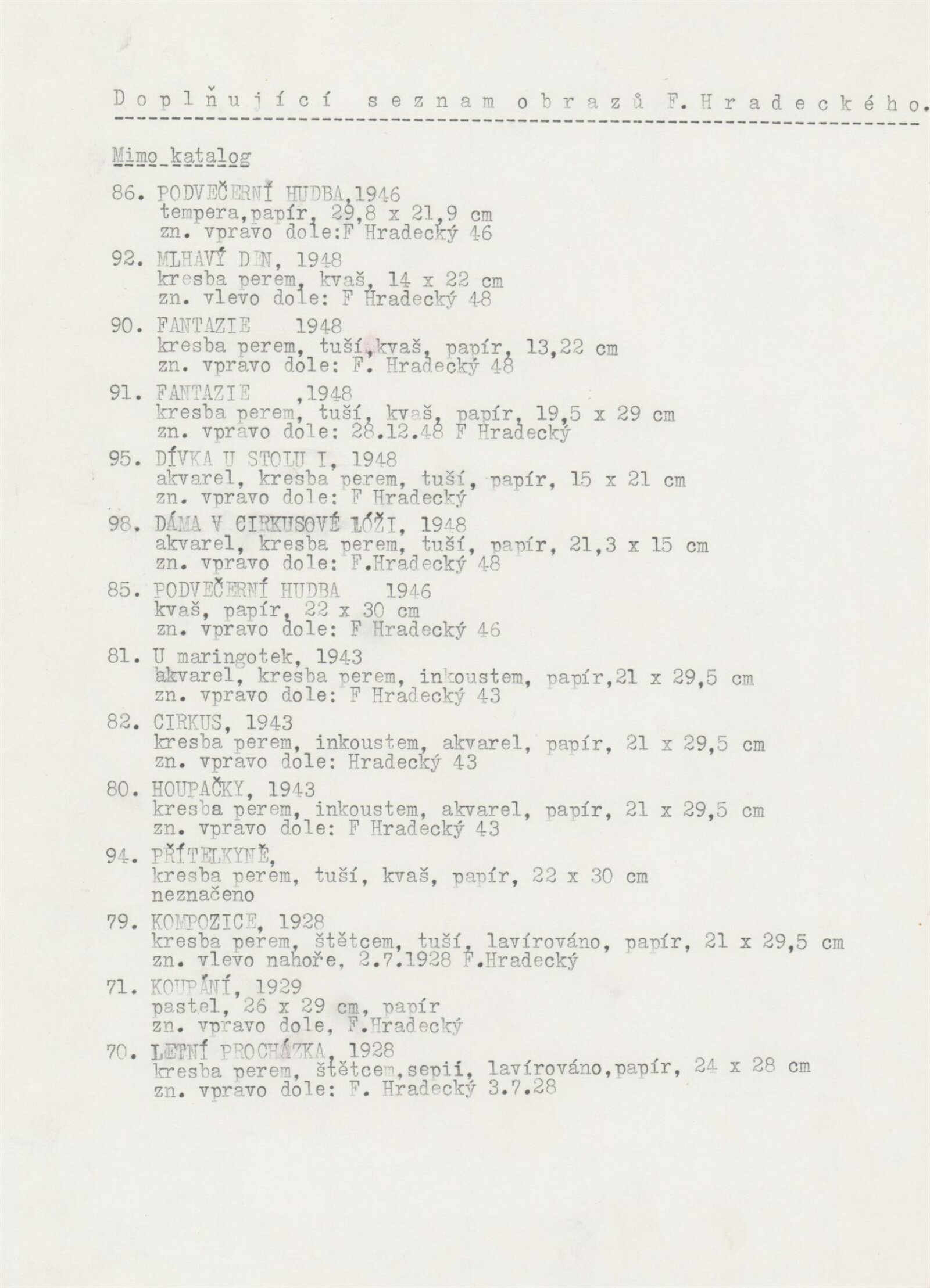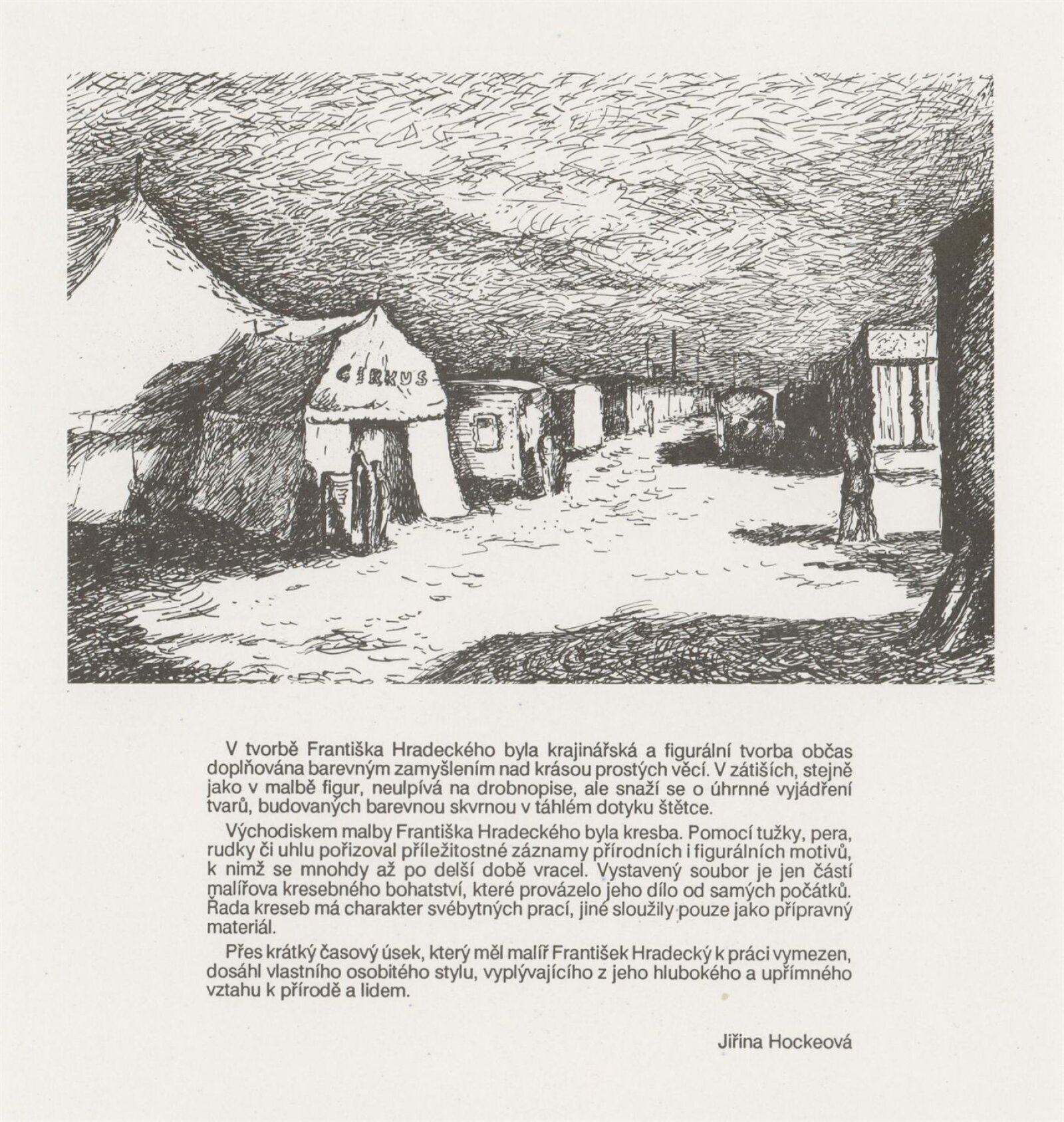 František Hradecký. Obrazy, kresby, grafika: Galerie Stará radnice, Síň Vincence Makovského, přízemí, 3. 12. 1991 – 12. 1. 1992 / Text: Jiřina Hockeová. – Brno: DUmB, 1991. – skládačka (6 s., obr.), životní data, výstavy, GSR 110