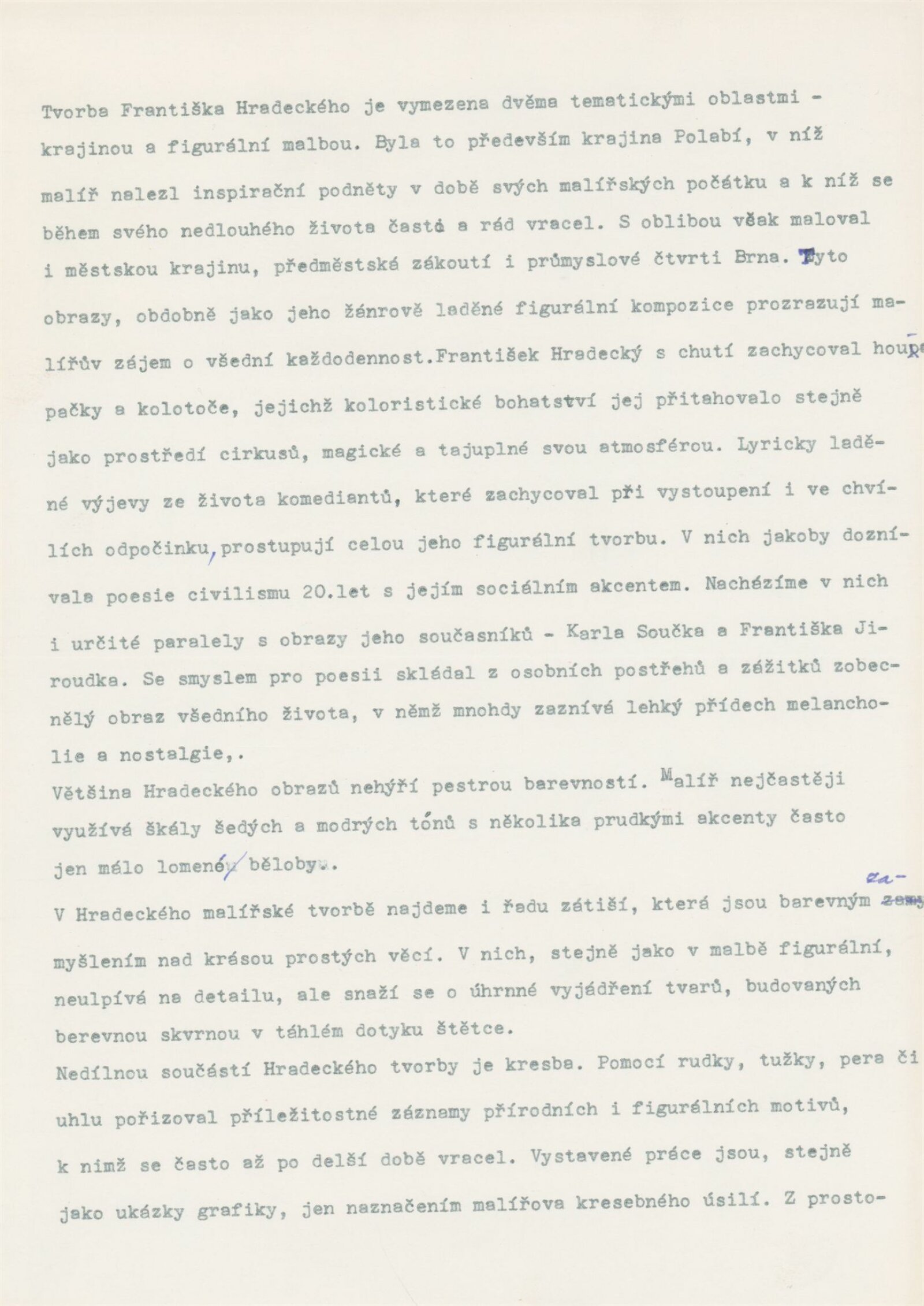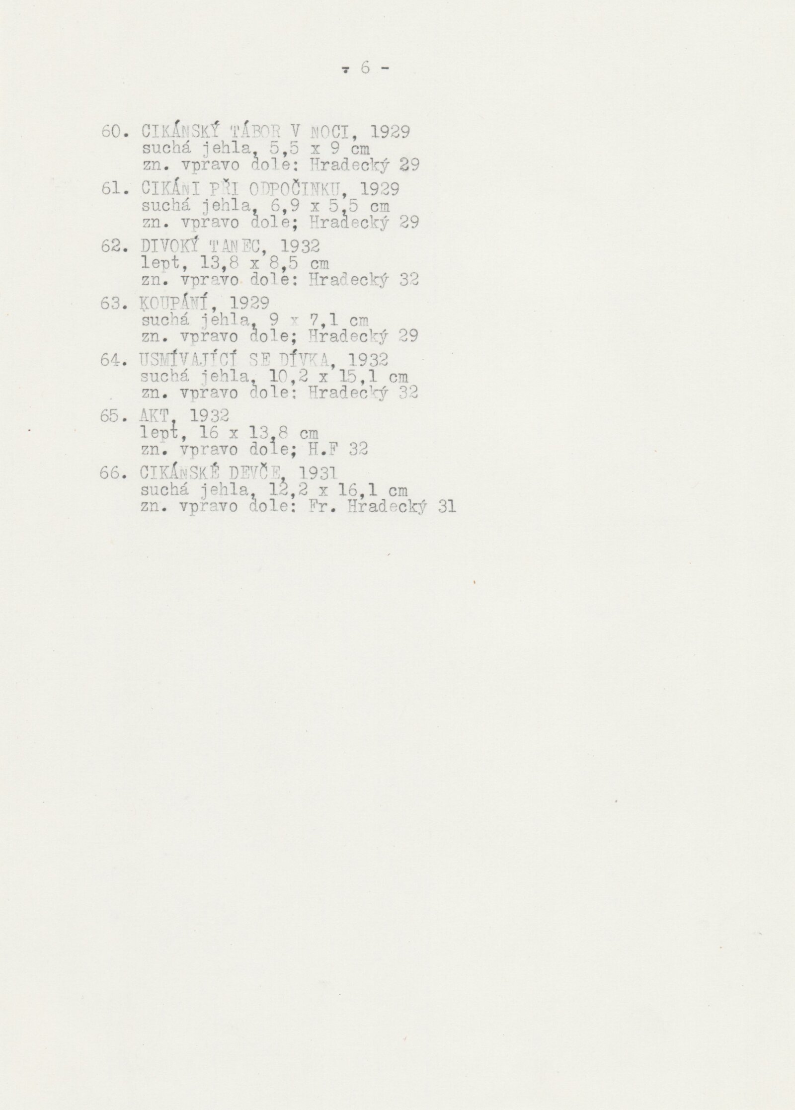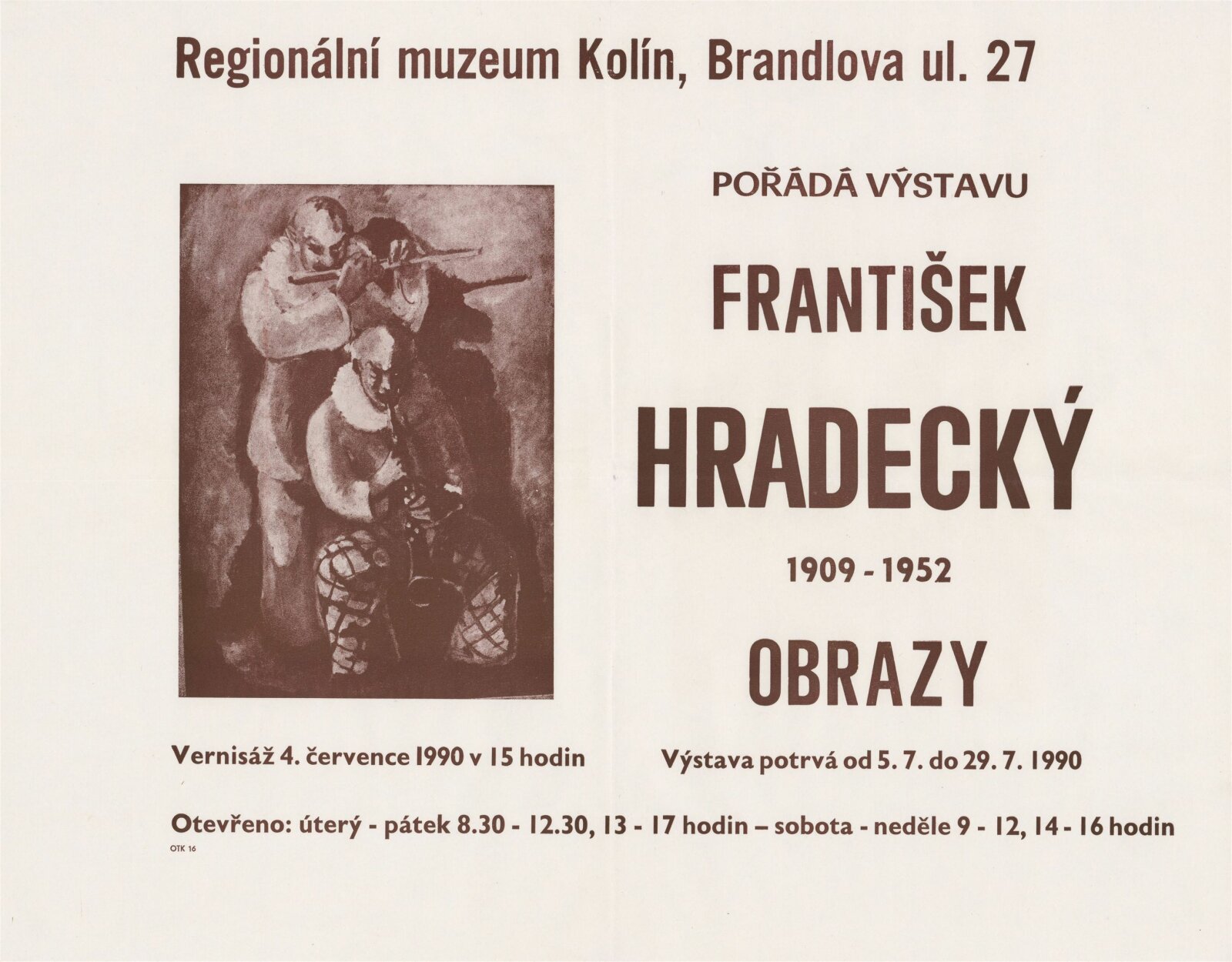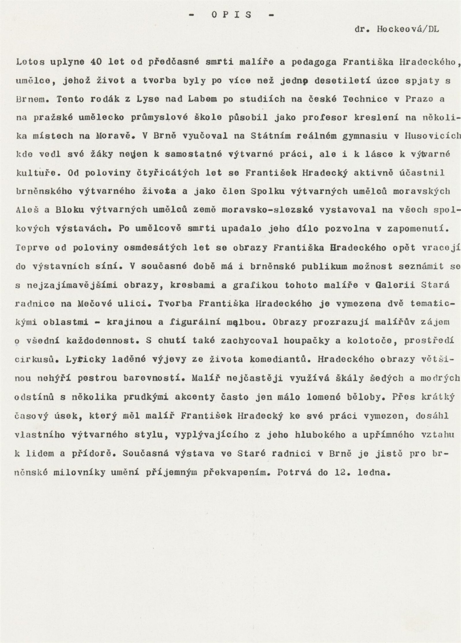 František Hradecký. Obrazy, kresby, grafika: Galerie Stará radnice, Síň Vincence Makovského, přízemí, 3. 12. 1991 – 12. 1. 1992 / Text: Jiřina Hockeová. – Brno: DUmB, 1991. – skládačka (6 s., obr.), životní data, výstavy, GSR 110