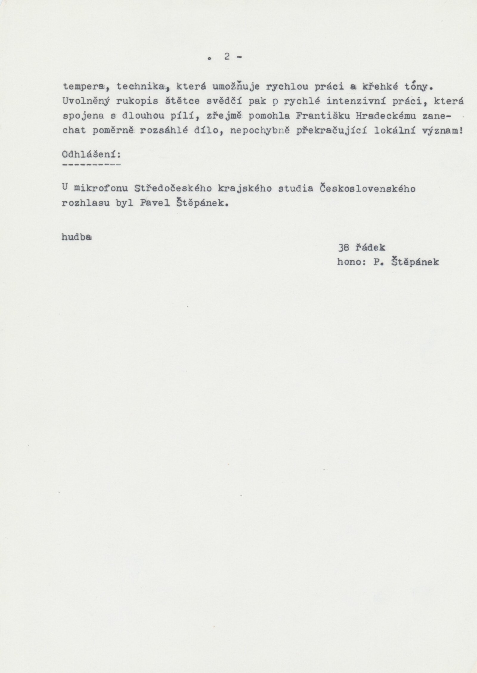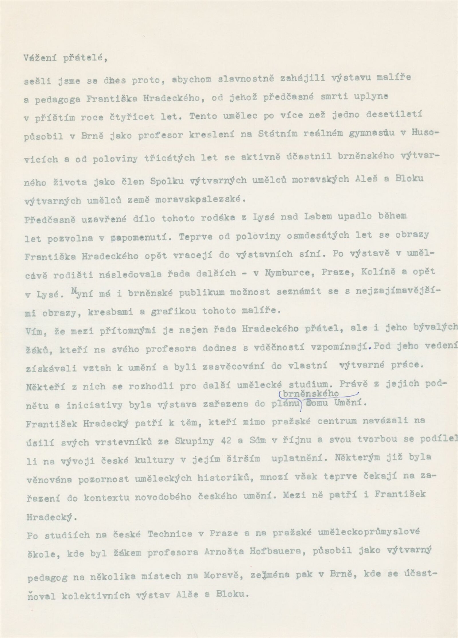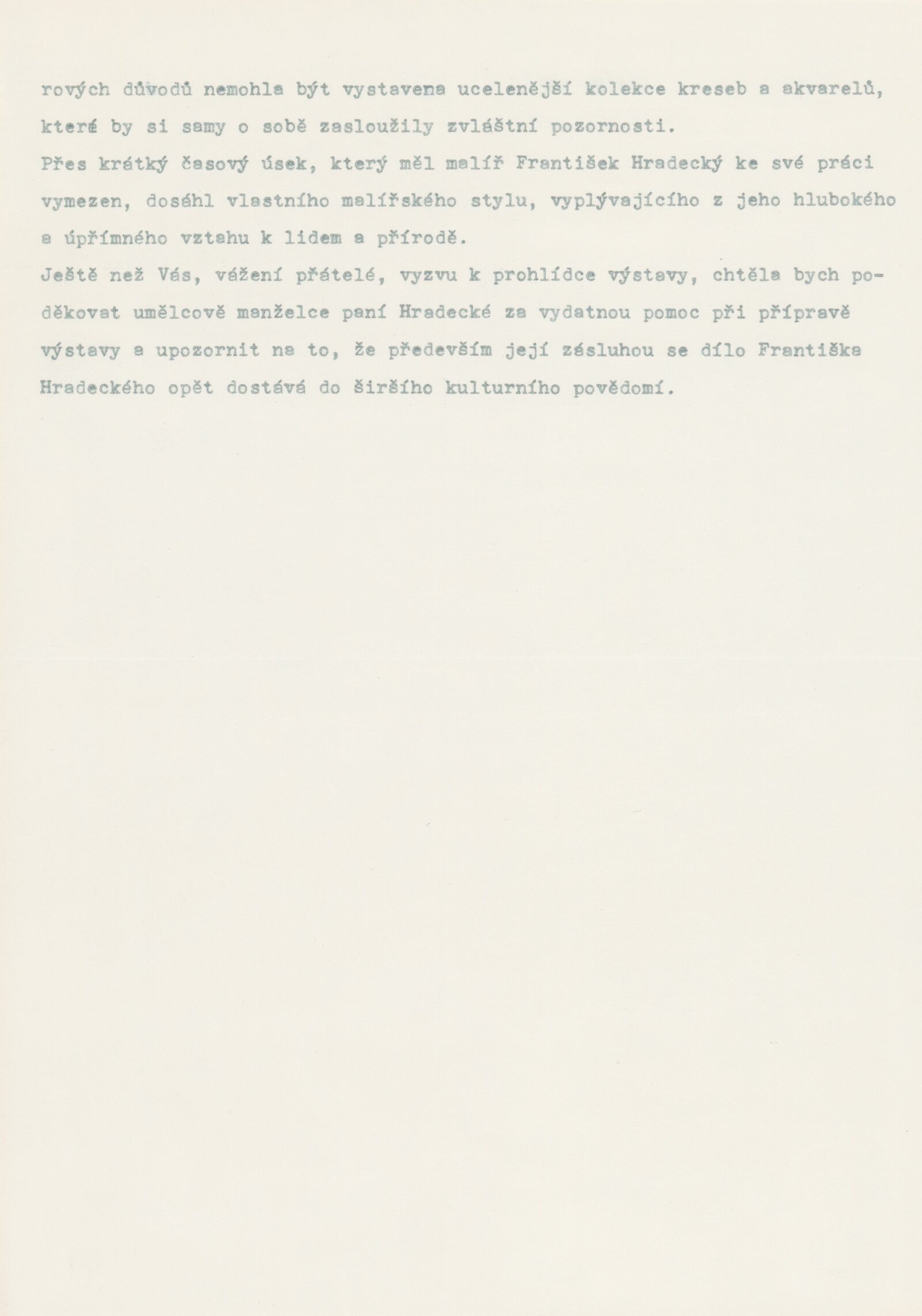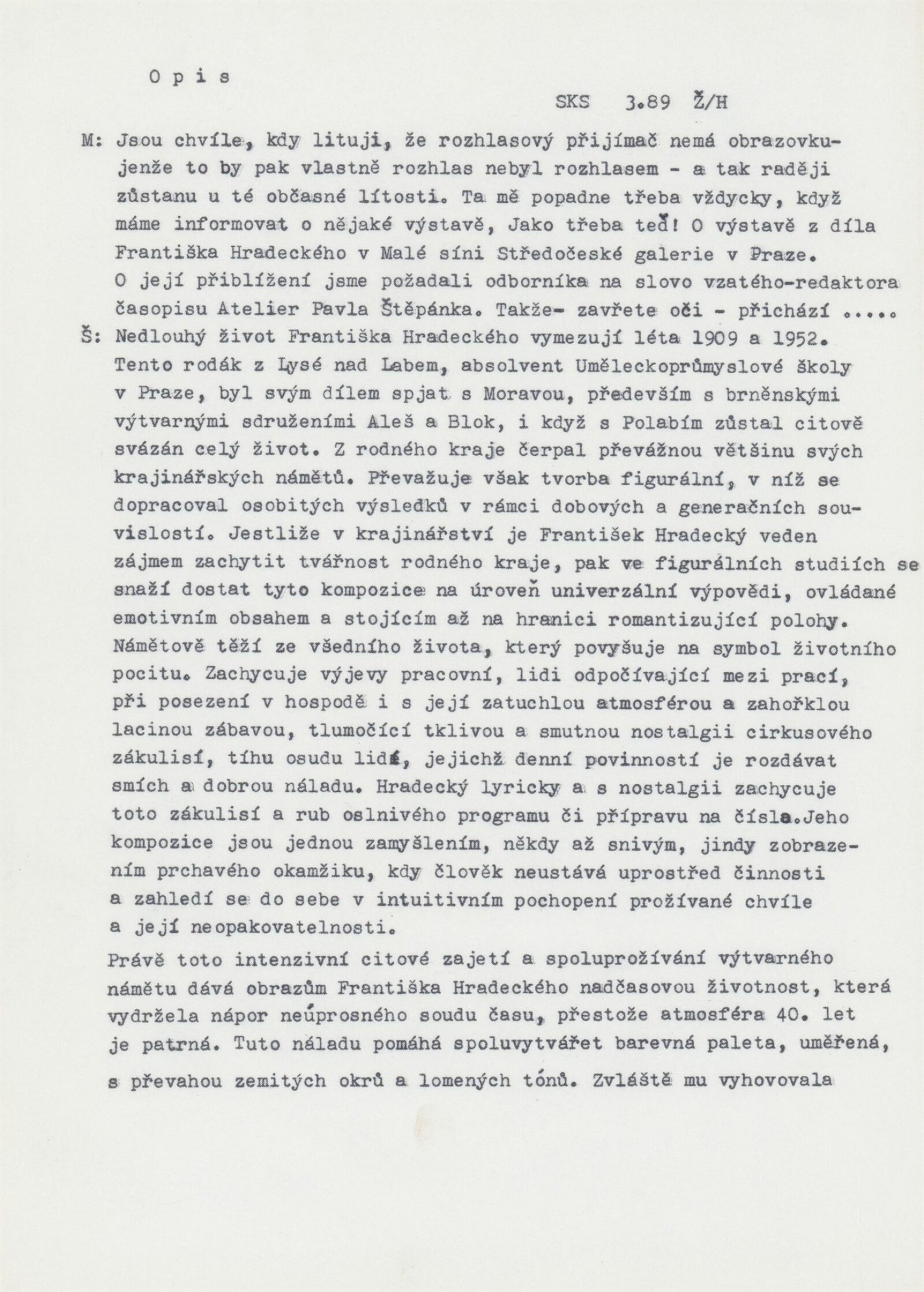 František Hradecký. Obrazy, kresby, grafika: Galerie Stará radnice, Síň Vincence Makovského, přízemí, 3. 12. 1991 – 12. 1. 1992 / Text: Jiřina Hockeová. – Brno: DUmB, 1991. – skládačka (6 s., obr.), životní data, výstavy, GSR 110