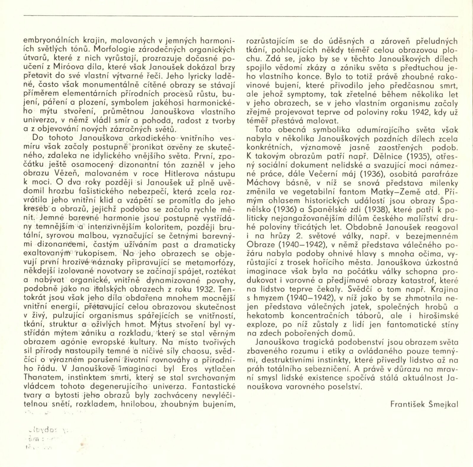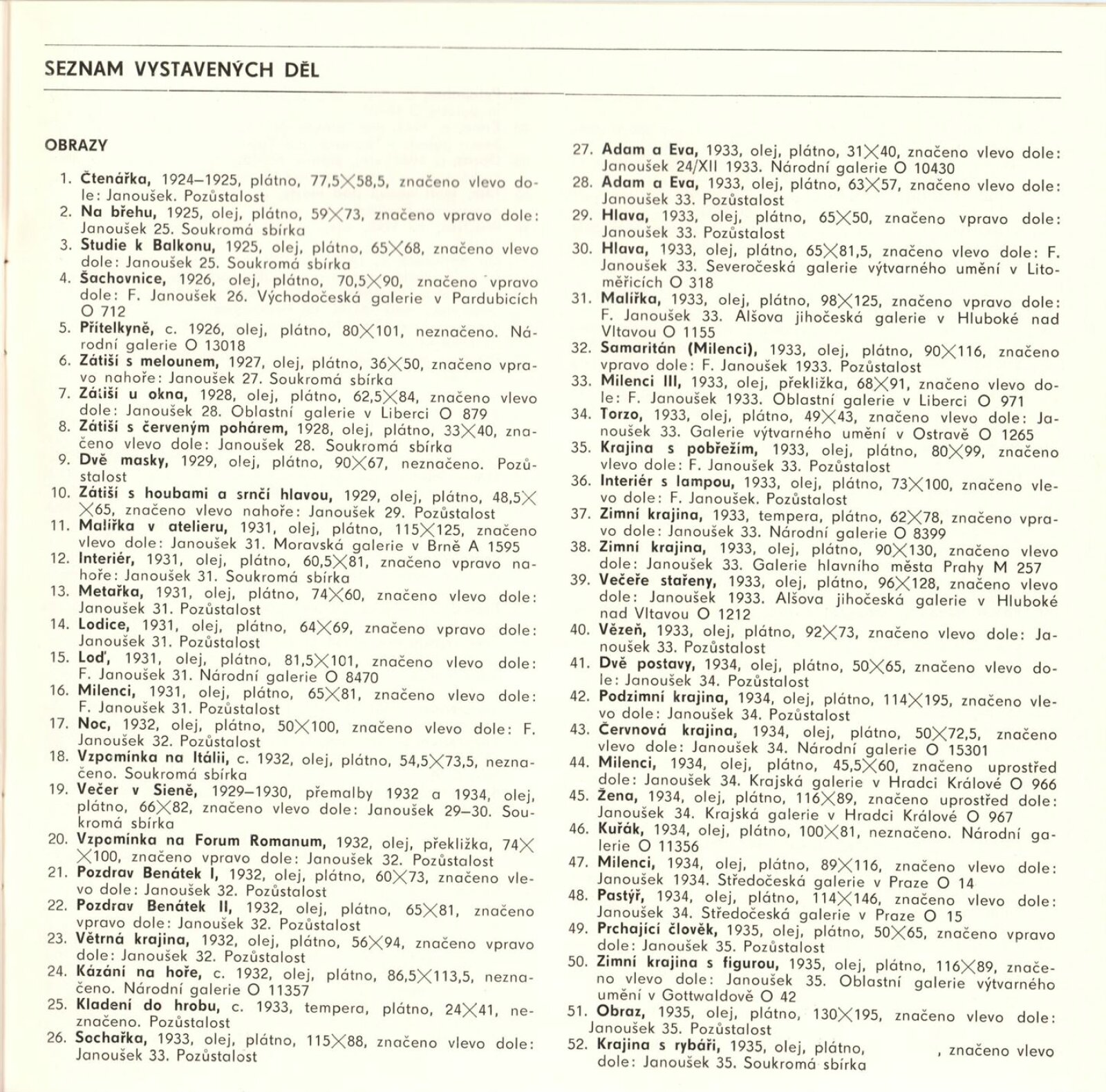 František Janoušek. Obrazy a kresby 1929–1942: Dům umění města Brna, 1. patro, 21. 5. – 30. 6. 1985 / Text: František Šmejkal. – Brno: DUmB, 1985. – 28 s., obr., životní data, výstavy, bibliografie, DU 795. – MZK; MG; MMB
