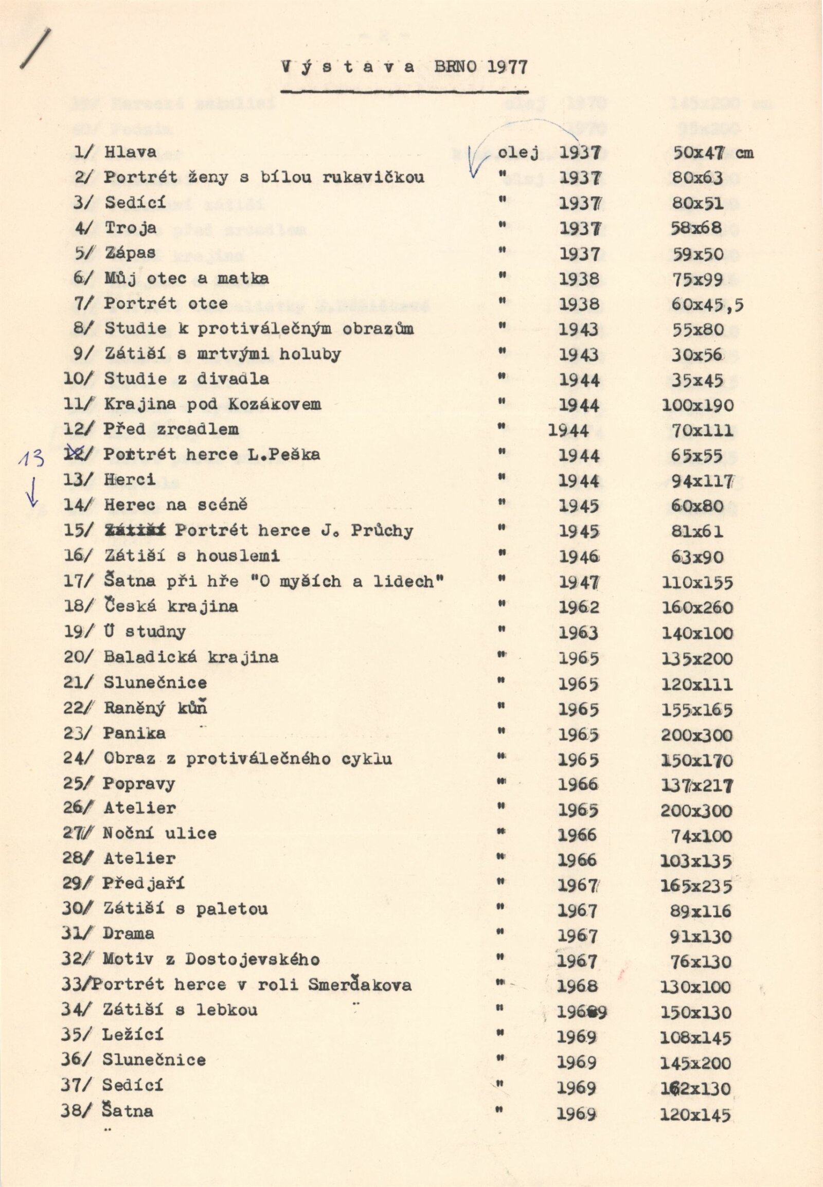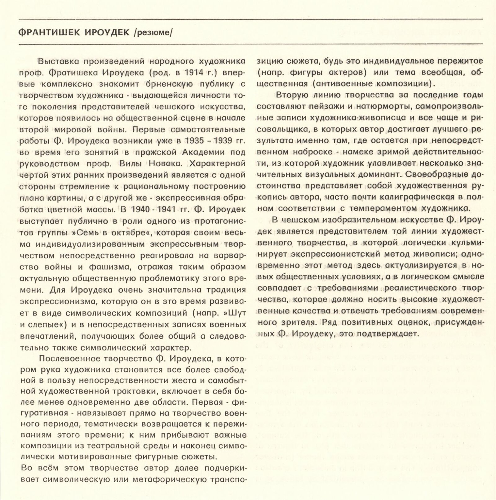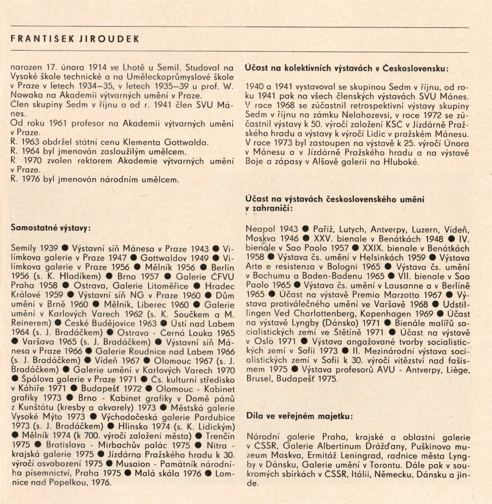 František Jiroudek. Obrazy a kresby: Dům umění města Brna, 4. 6. – 10. 7. 1977 / Text: Čestmír Berka. – Brno: DUmB, 1977. – 24 s., obr., list překladů, životní data, výstavy, díla ve veřejném majetku, DU 658. – MZK; MG; MMB
