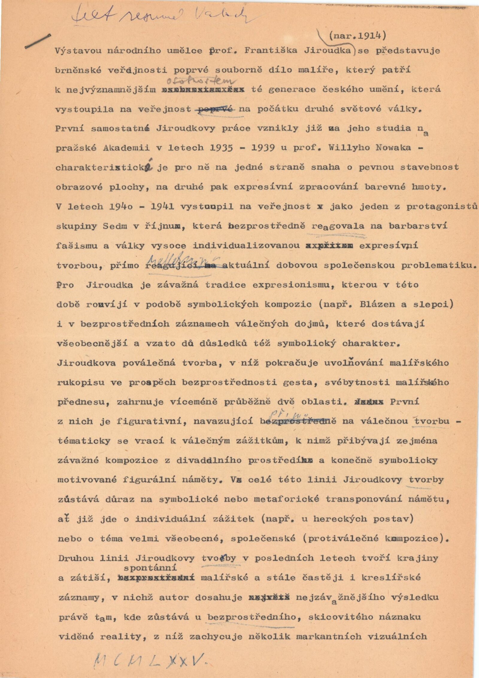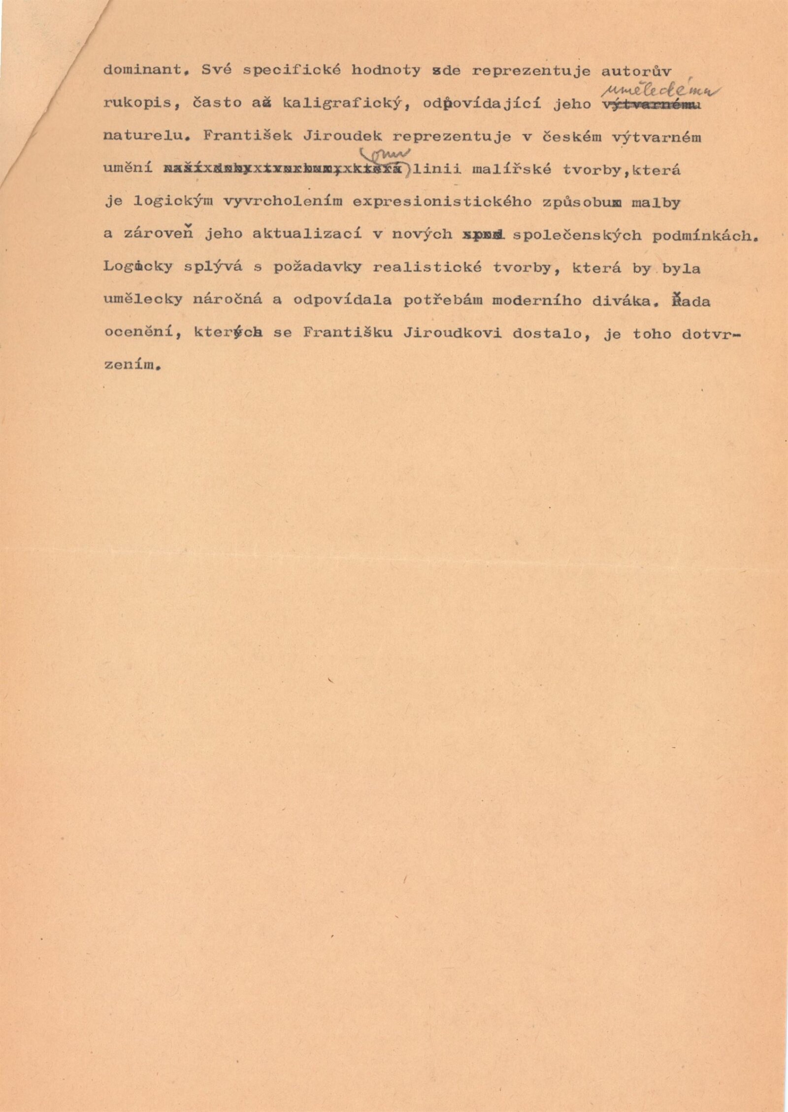 pozvánka, katalog, seznamy vystavených děl a pojistné seznamy, text resumé z katalogu, korespondence (František Jiroudek – rukopis, instituce), reversy, recenze v tisku, pozvánka, plakát a katalog výstavy Františka Jiroudka v Galerii VU v Chebu (1977), katalog výstavy Františka Jiroudka ve Výstavní síni Památníku národního písemnictví (1975)