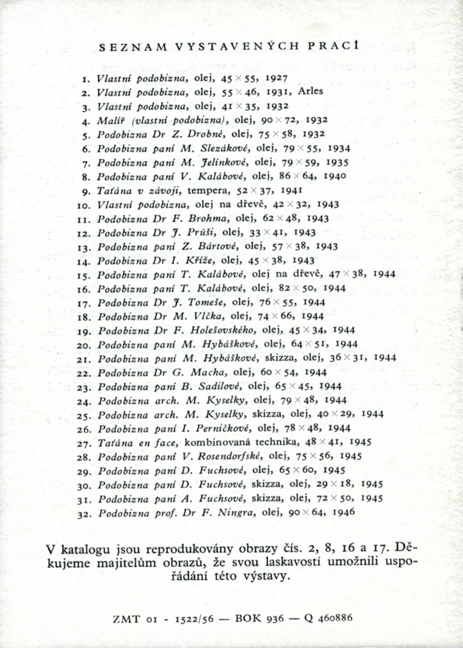 František Kaláb. Podobizny: Dům umění města Brna, Procházkova síň, 27. 5. – 15. 7. 1956 / Text: Albert Kutal. – Brno: DUmB, 1956. – 10 s., obr., DU 254. – MG