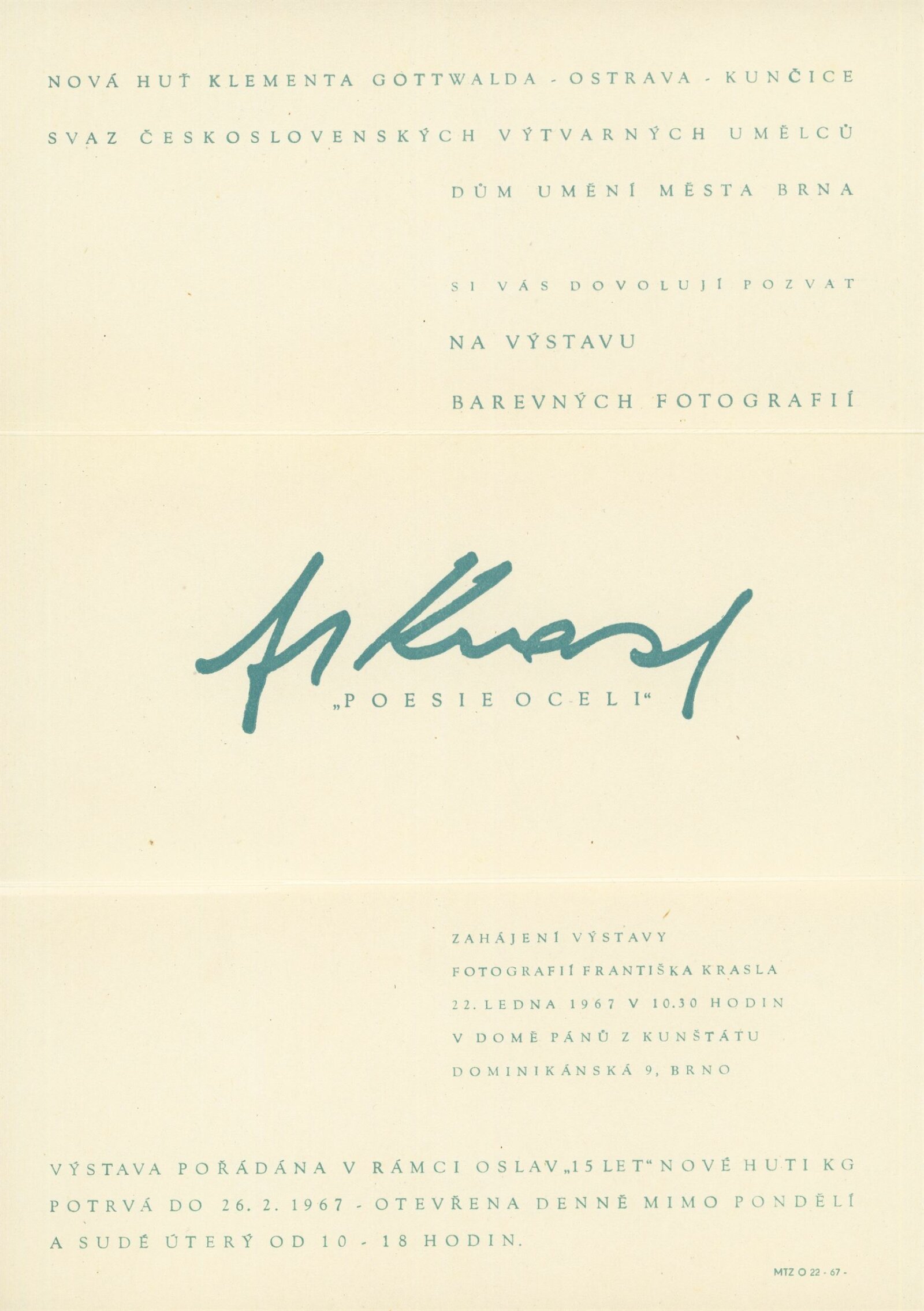 pozvánky, fotografie z vernisáže, recenze (dopis o potvrzení pořádání výstavy), smlouva k výstavě, recenze v tisku, plakát (DU v Ostravě)