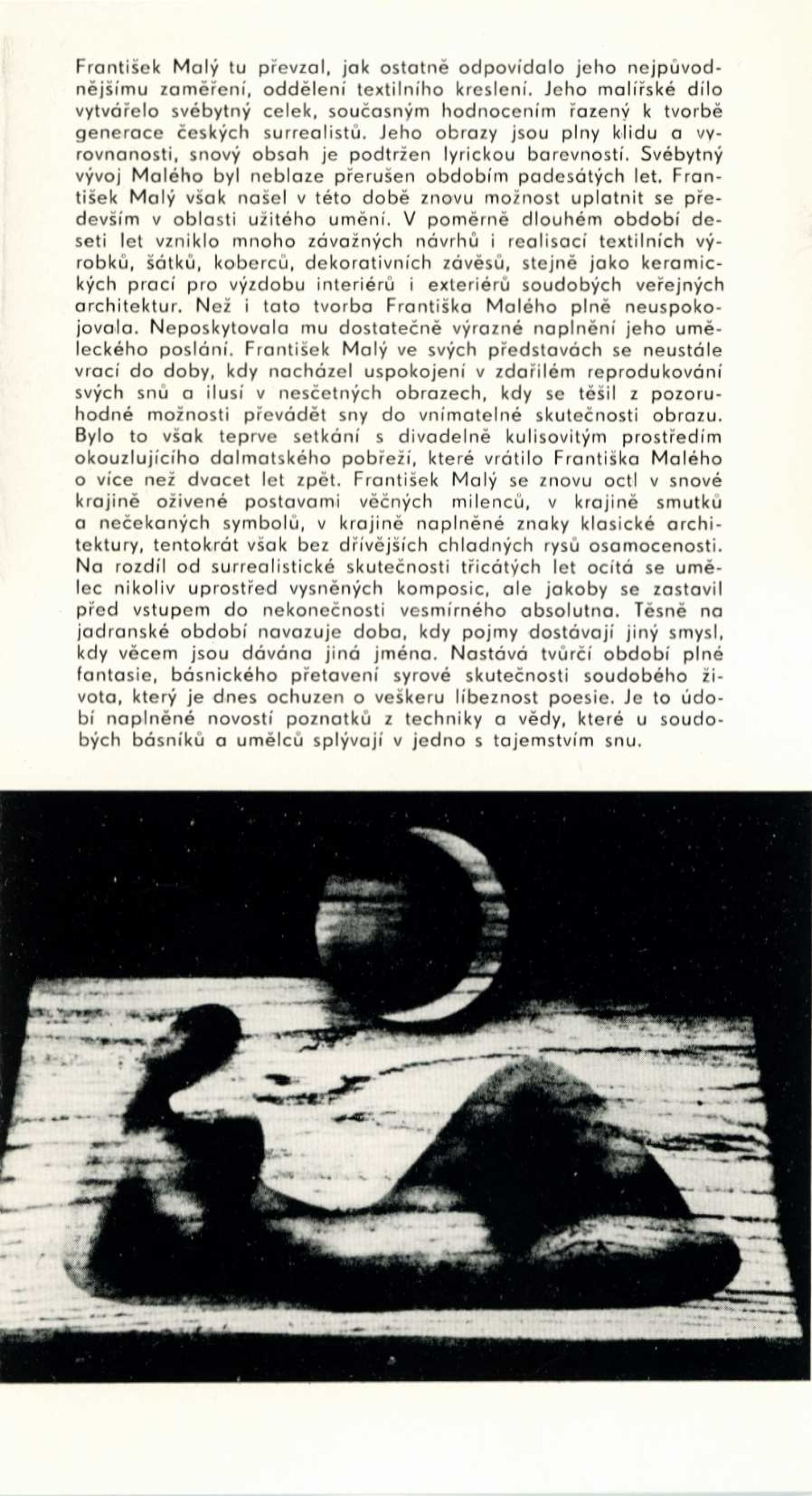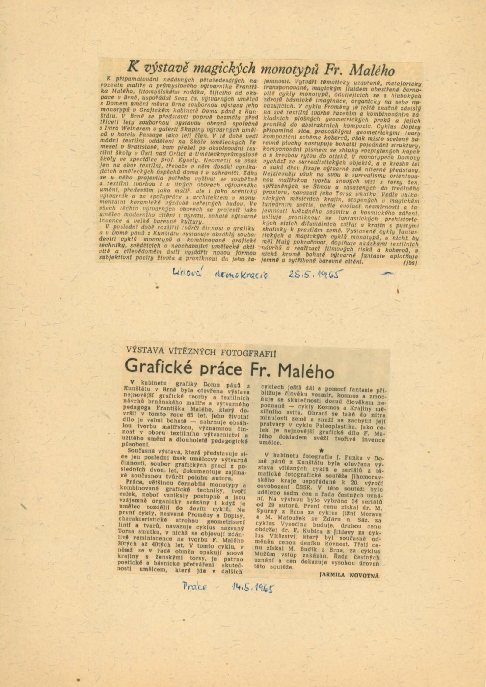 František Malý. Monotypy, kombinované grafické techniky, textil, 1963–1965: Dům umění města Brna / Dům pánů z Kunštátu, 66. výstava Kabinetu grafiky, 7. 5. – 30. 5. 1965 / Text: Helena Kusáková-Knozová. – Brno: DUmB, 1965. – skládačka, 6 s., obr., DPK 269. – MZK; MG; MMB
