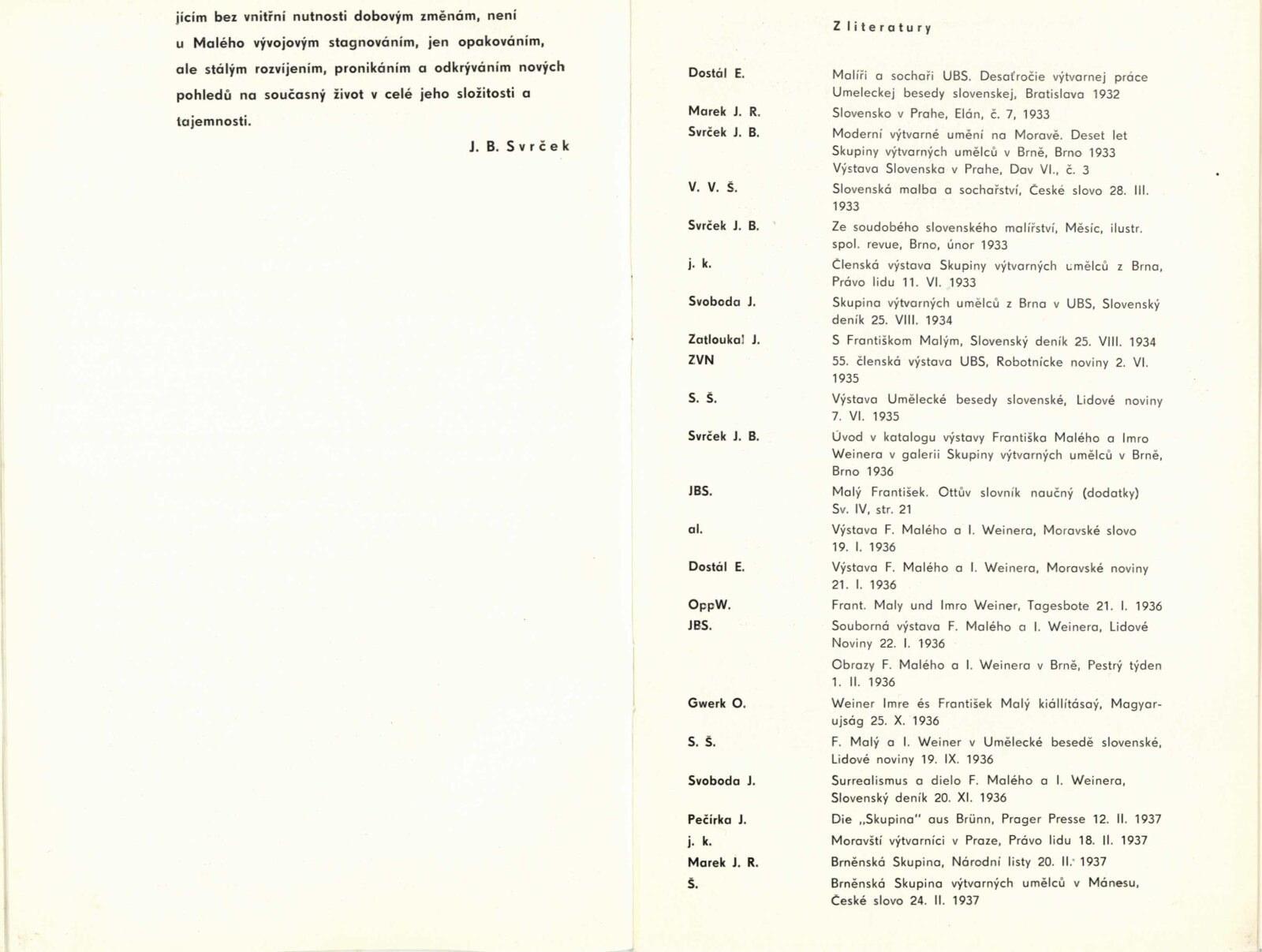 František Malý. Obrazy a kresby 19330–1936, 1966–1967: Dům umění, 18. výstava v Galerii Jaroslava Krále, 6. 4. – 18. 5. 1968 / Text: Jaroslav B. Svrček. – Brno: ČFVU, 1968. – 22 s., obr., portrét, životní data, bibliografie, DU 501. – MG; MMB