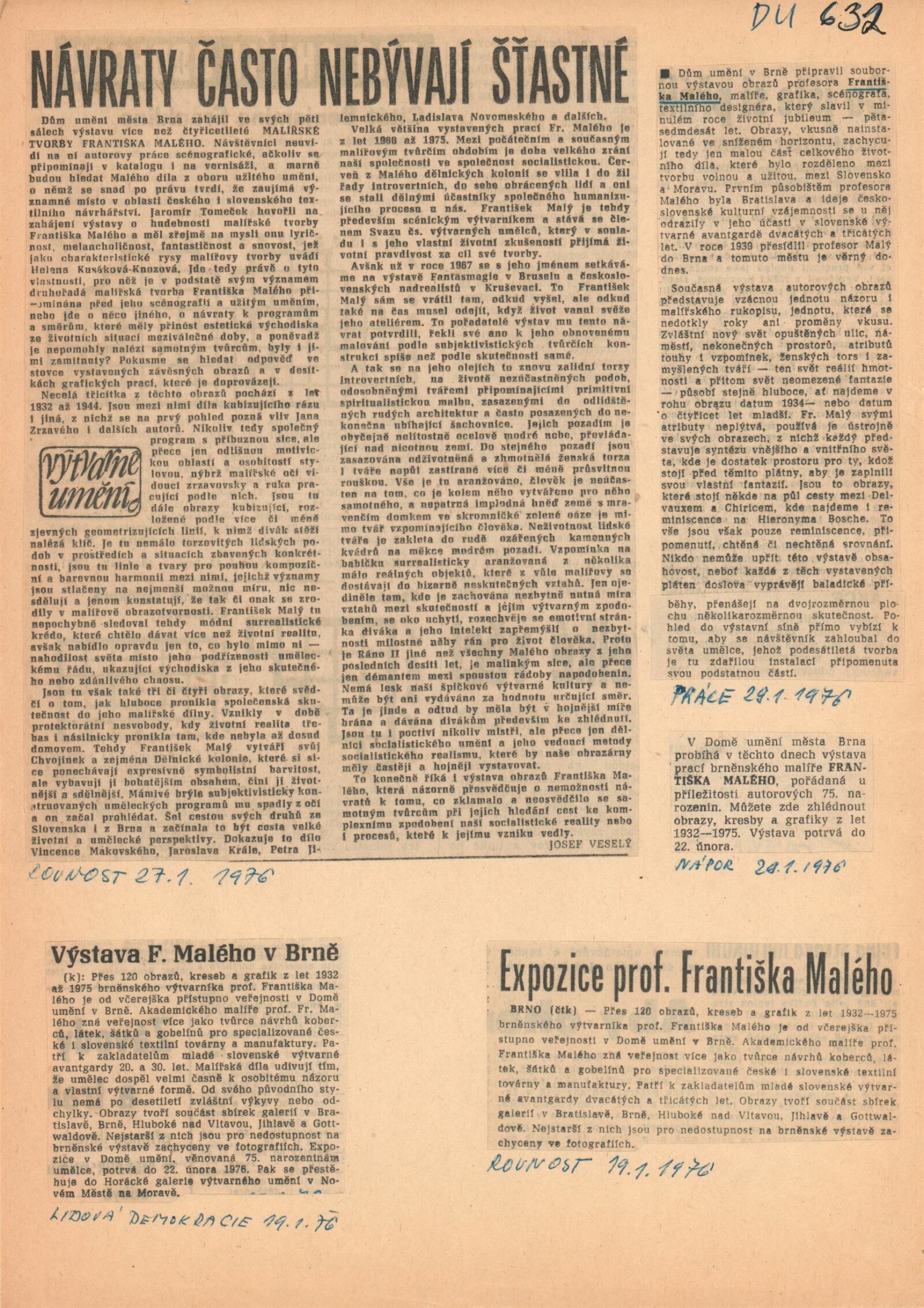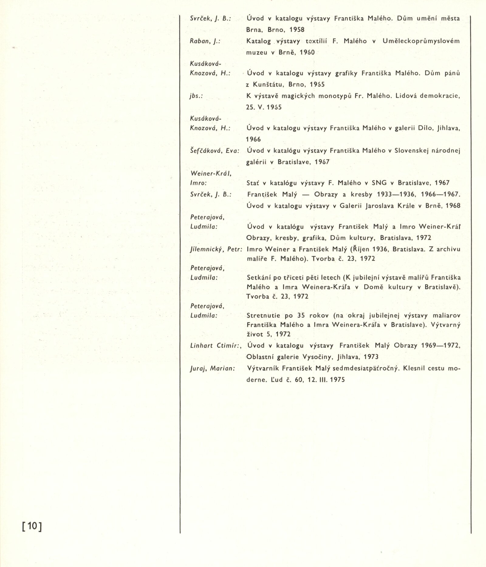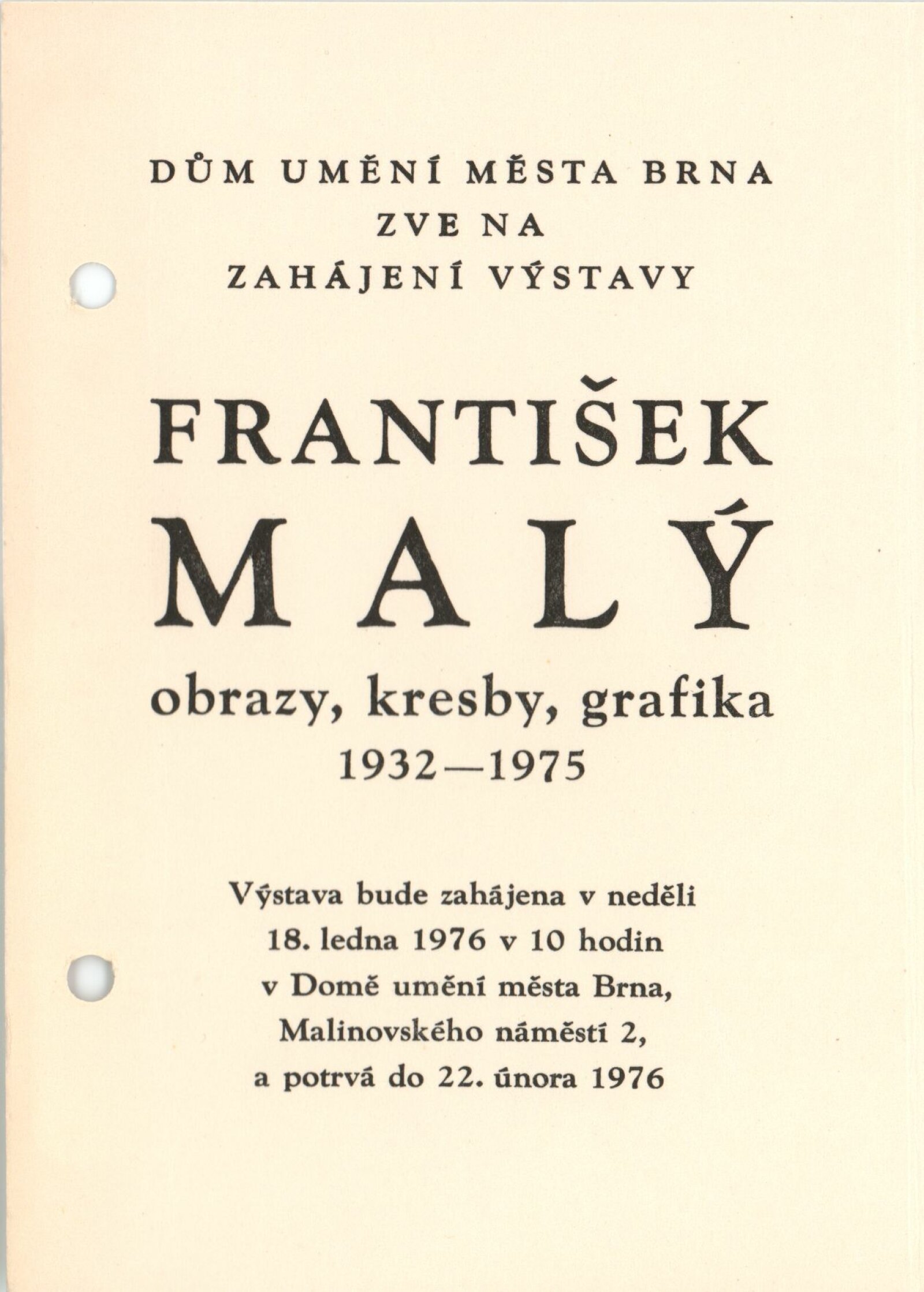 František Malý. Obrazy. Kresby. Grafika. 1932–1975: Dům umění města Brna, 18. 1. – 22. 2. 1976 / Text: Helena Kusáková-Knozová. – Brno: DUmB, 1976. – 35 s., obr., portrét, životní data, bibliografie, DU 632. – MZK; MG; MMB