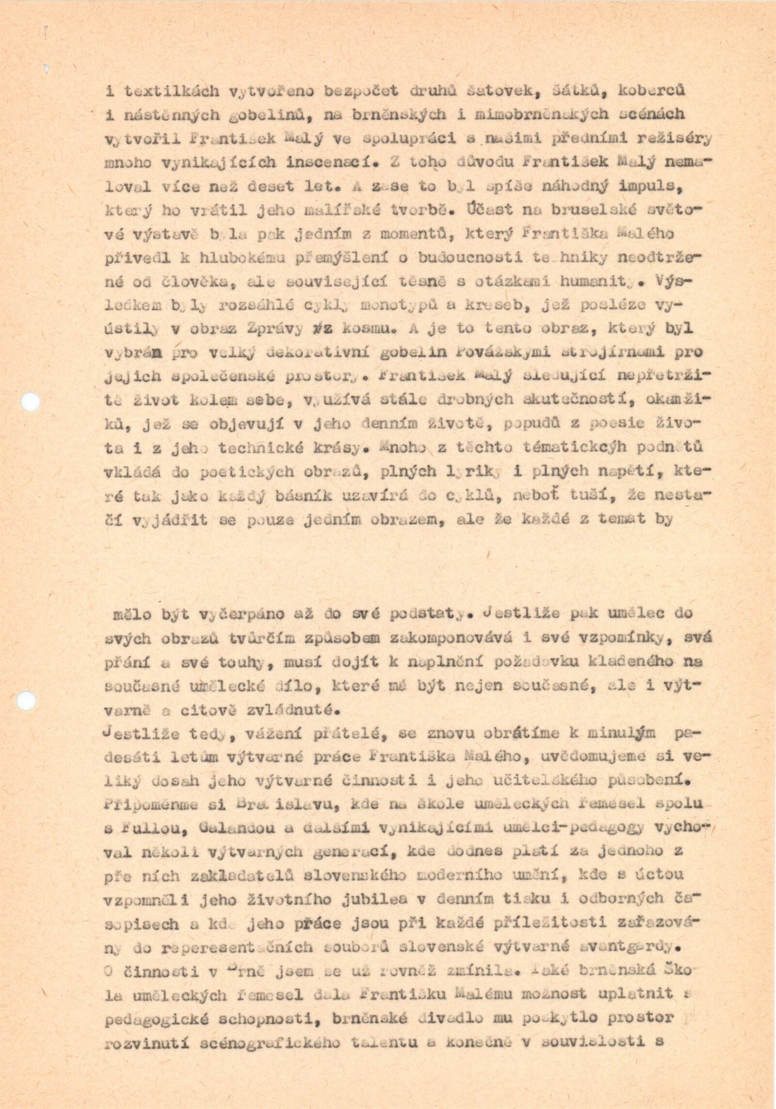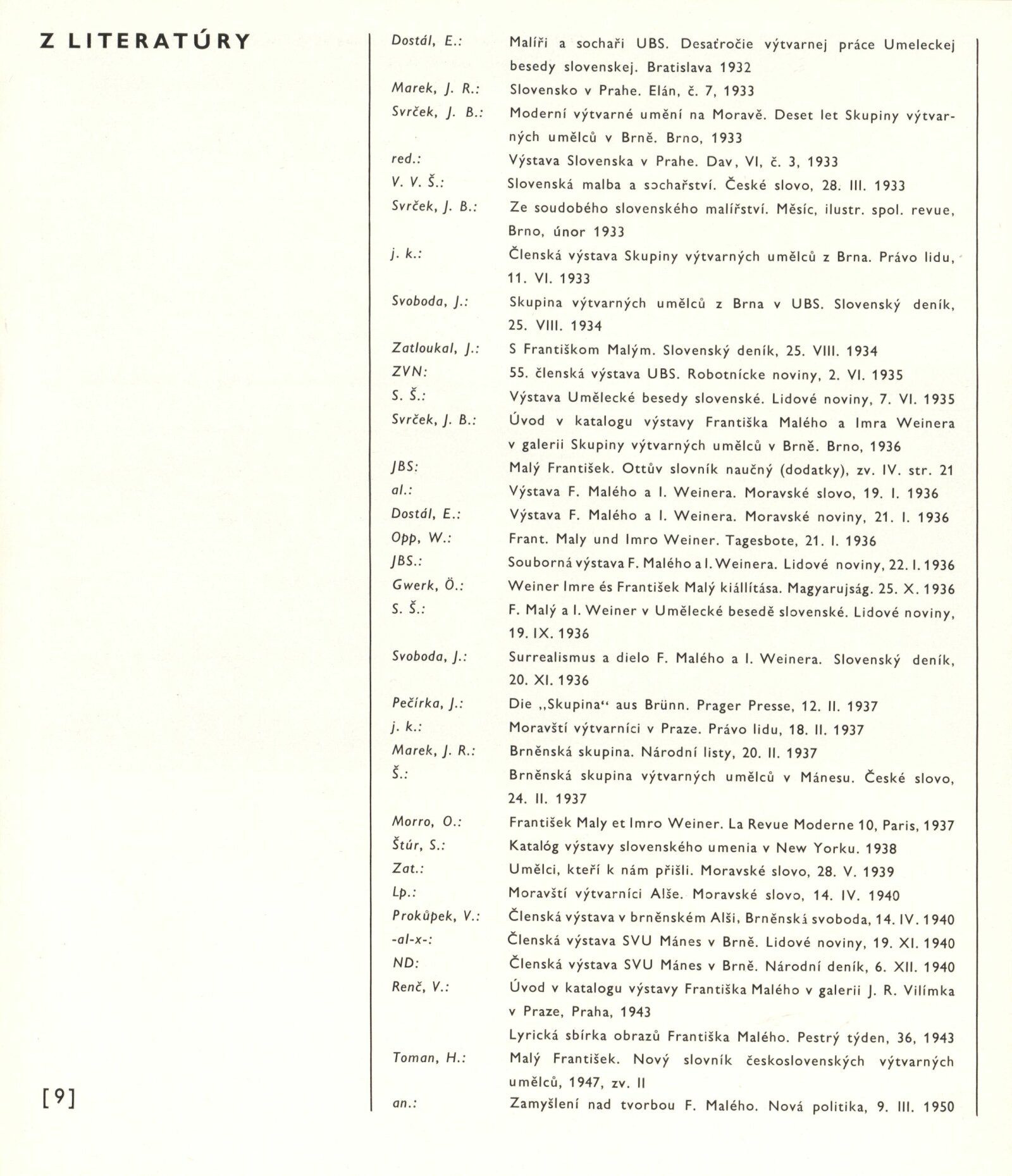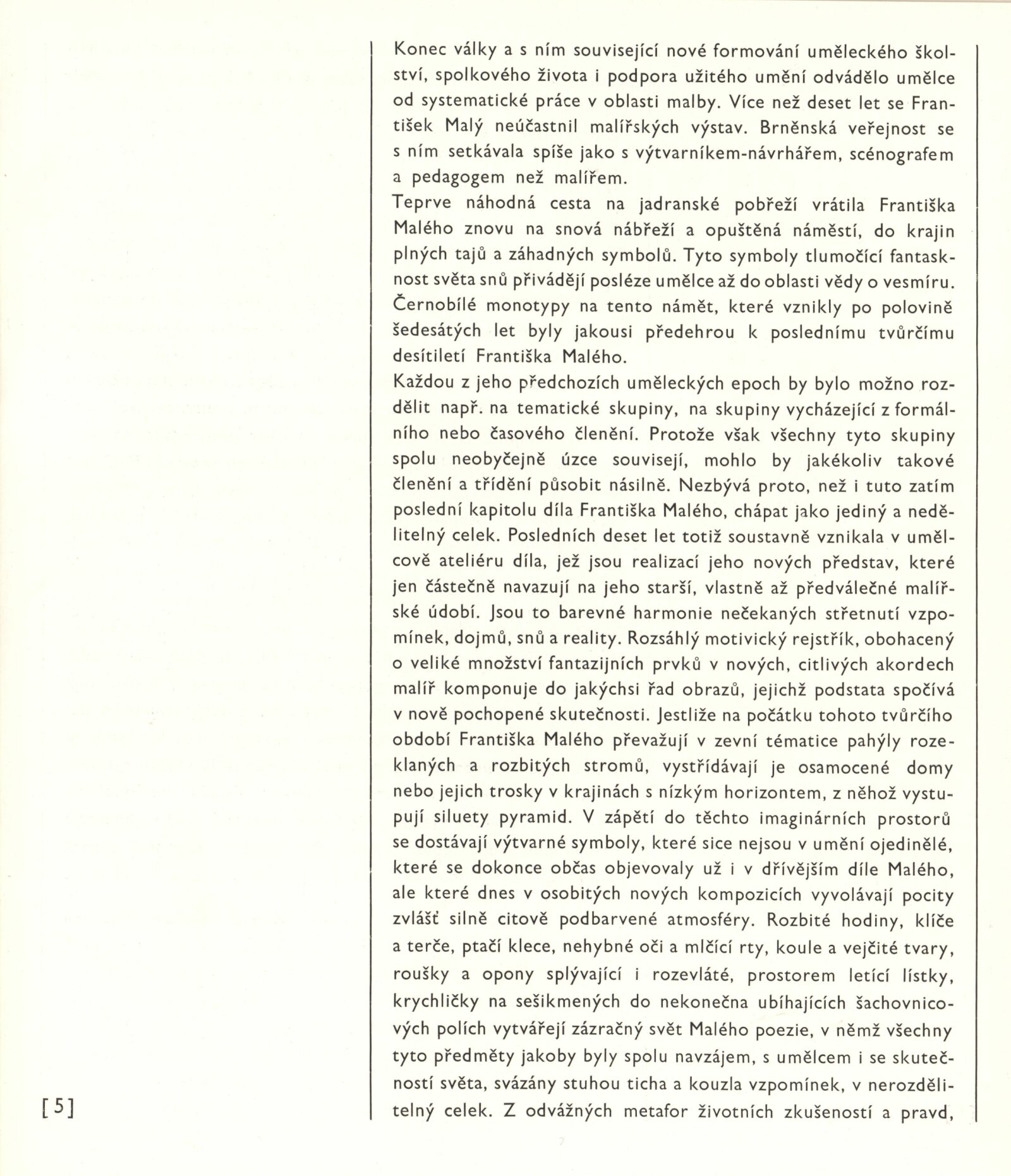 František Malý. Obrazy. Kresby. Grafika. 1932–1975: Dům umění města Brna, 18. 1. – 22. 2. 1976 / Text: Helena Kusáková-Knozová. – Brno: DUmB, 1976. – 35 s., obr., portrét, životní data, bibliografie, DU 632. – MZK; MG; MMB