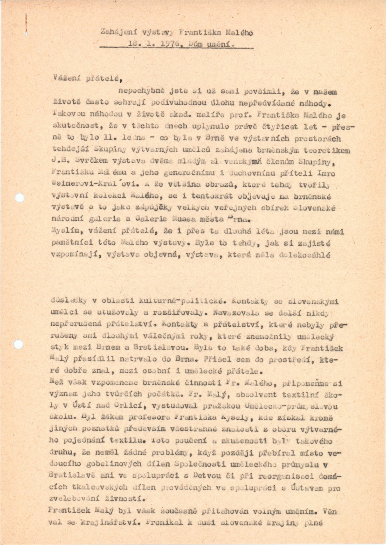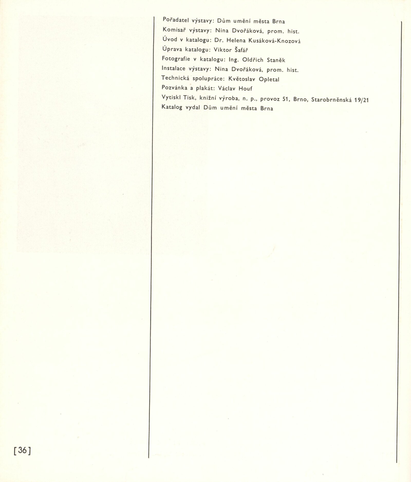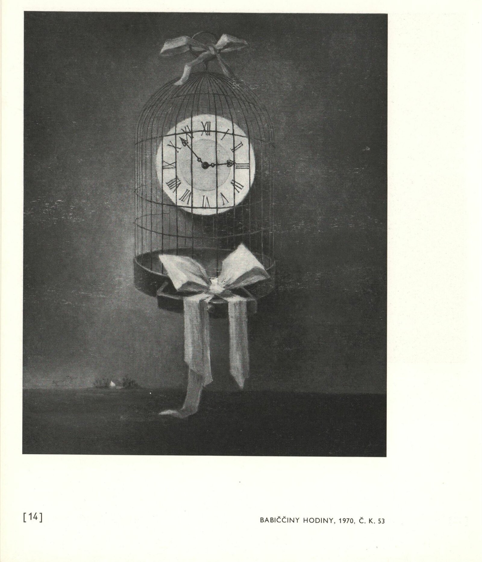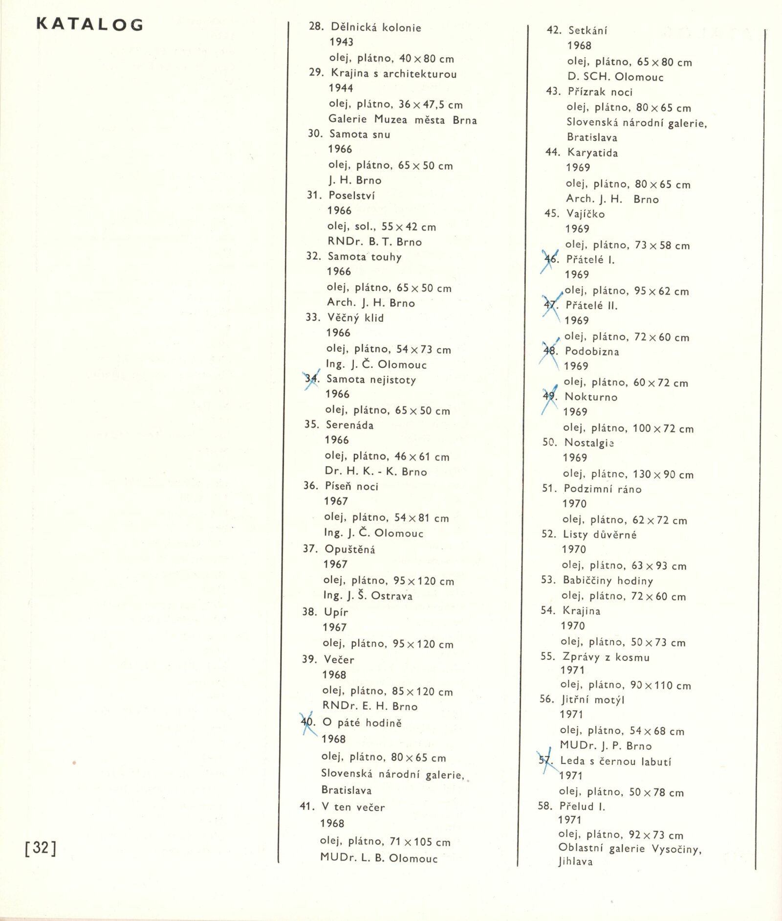 pozvánka, katalog, seznam vystavených děl, fotografie z vernisáže a výstavy, strojopis textu pro katalog, úvodní slovo vernisáže, strojopis básně Jacquese Préverta, provozní korespondence (instituce, žádosti o výpůjčku děl), zápis o nepovolené výstavě v Novém Města na Moravě, reverzy, prezenční listina tiskové konference DU, hlášení o vernisáži, žádost o schválení tisku katalogu, žádost o výstavu v DU – autor, žádost o povolení výstavy, souhlas KO SČVU s realizací výstavy, recenze v tisku