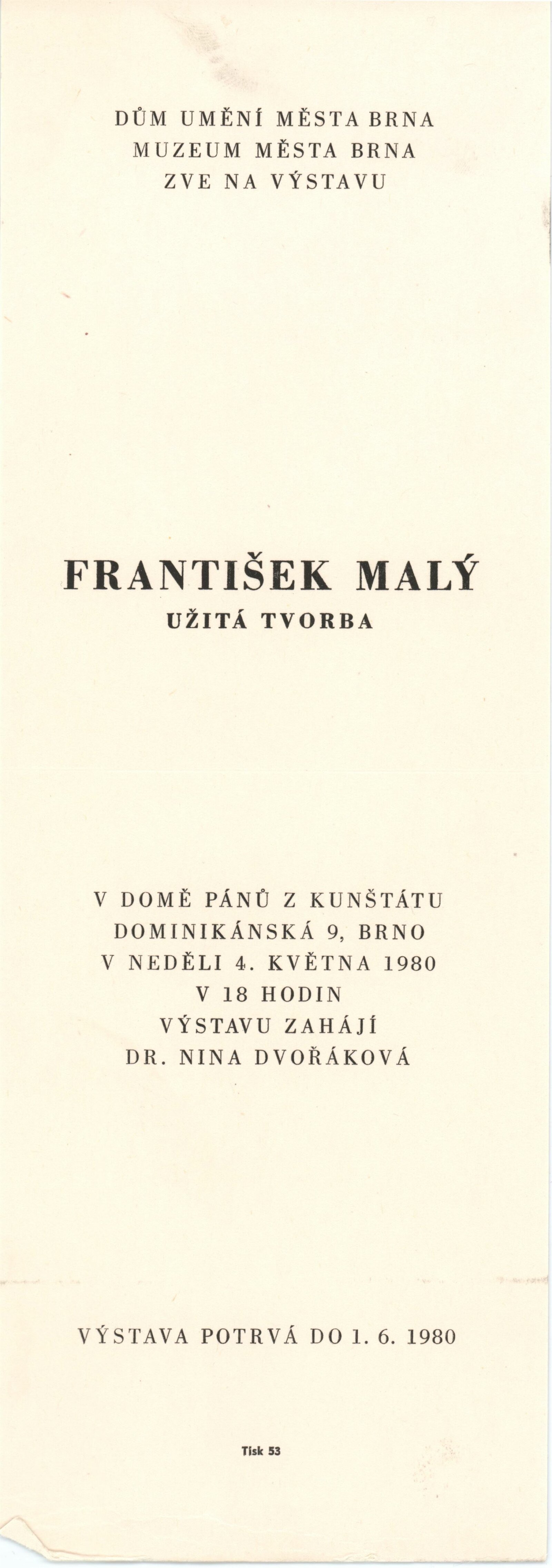 František Malý. Užitá tvorba: Dům umění / Dům pánů z Kunštátu, 1. patro, 4. 5. – 1. 6. 1980 / Texty: Eliška Lysková, Zuzana Ledererová. – Brno: DUmB, 1980. – 13 s., obr., životopis, DPK 736. – MZK; MG; MMB
