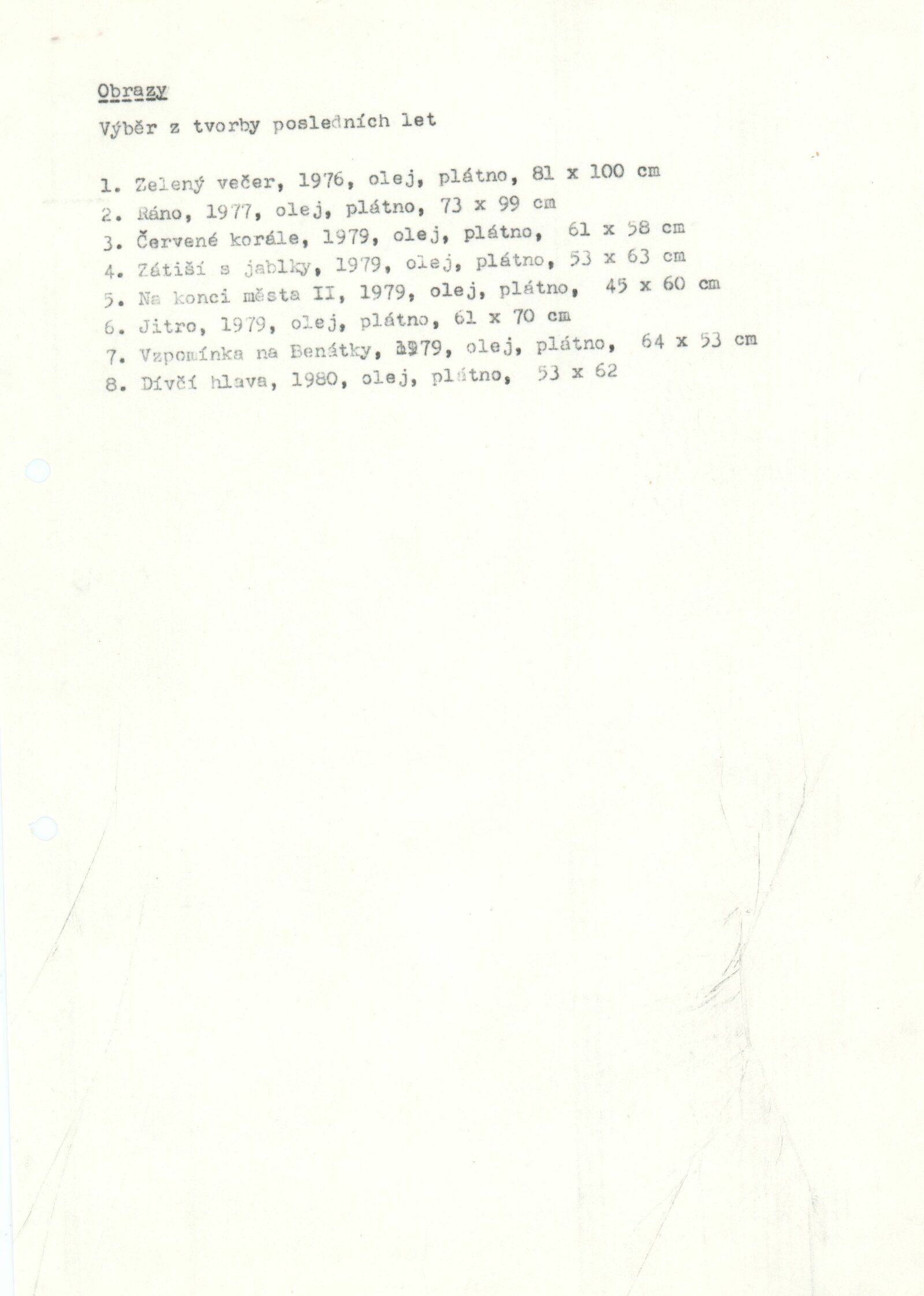 pozvánka, katalog, fotografie instalace, fotografie děl, seznamy vystavených děl a texty popisků, strojopis textu katalogu, provozní korespondence (instituce - žádosti u výpůjčky, dopis autorovi o zařazení výstavy, žádost o povolení výstavy), reversy, recenze v tisku