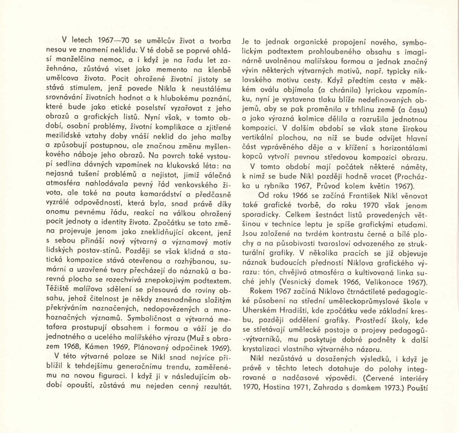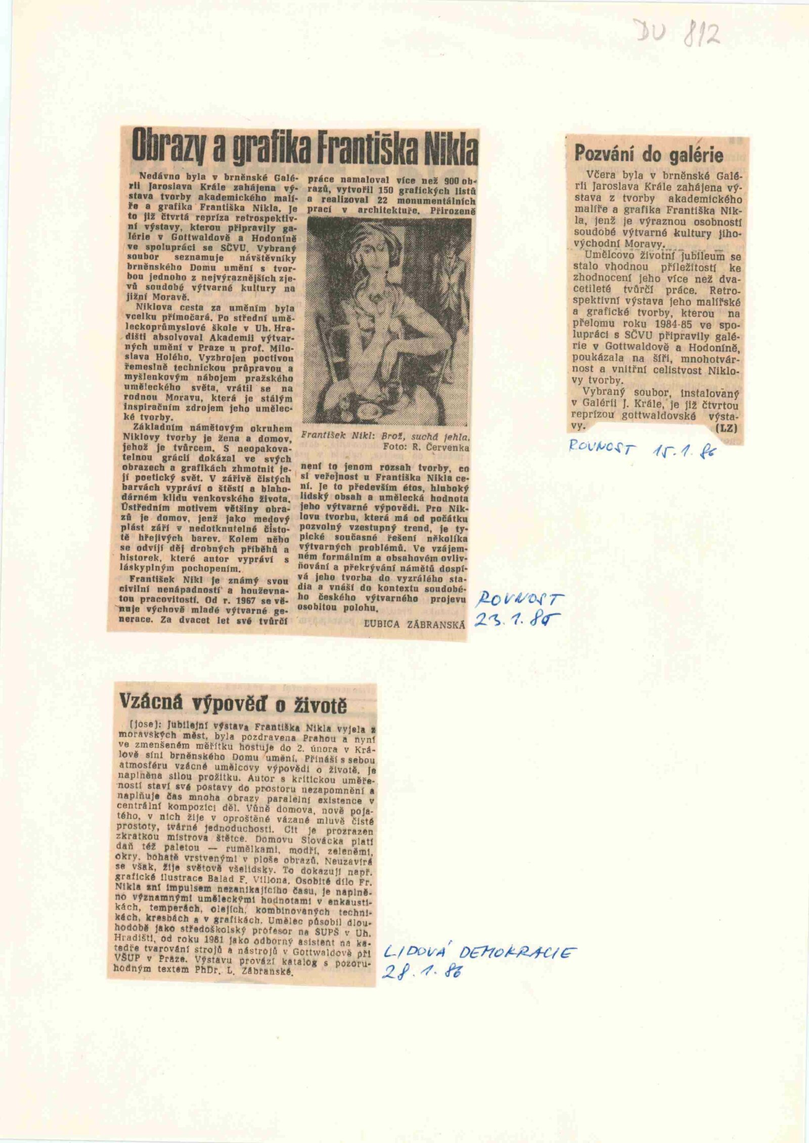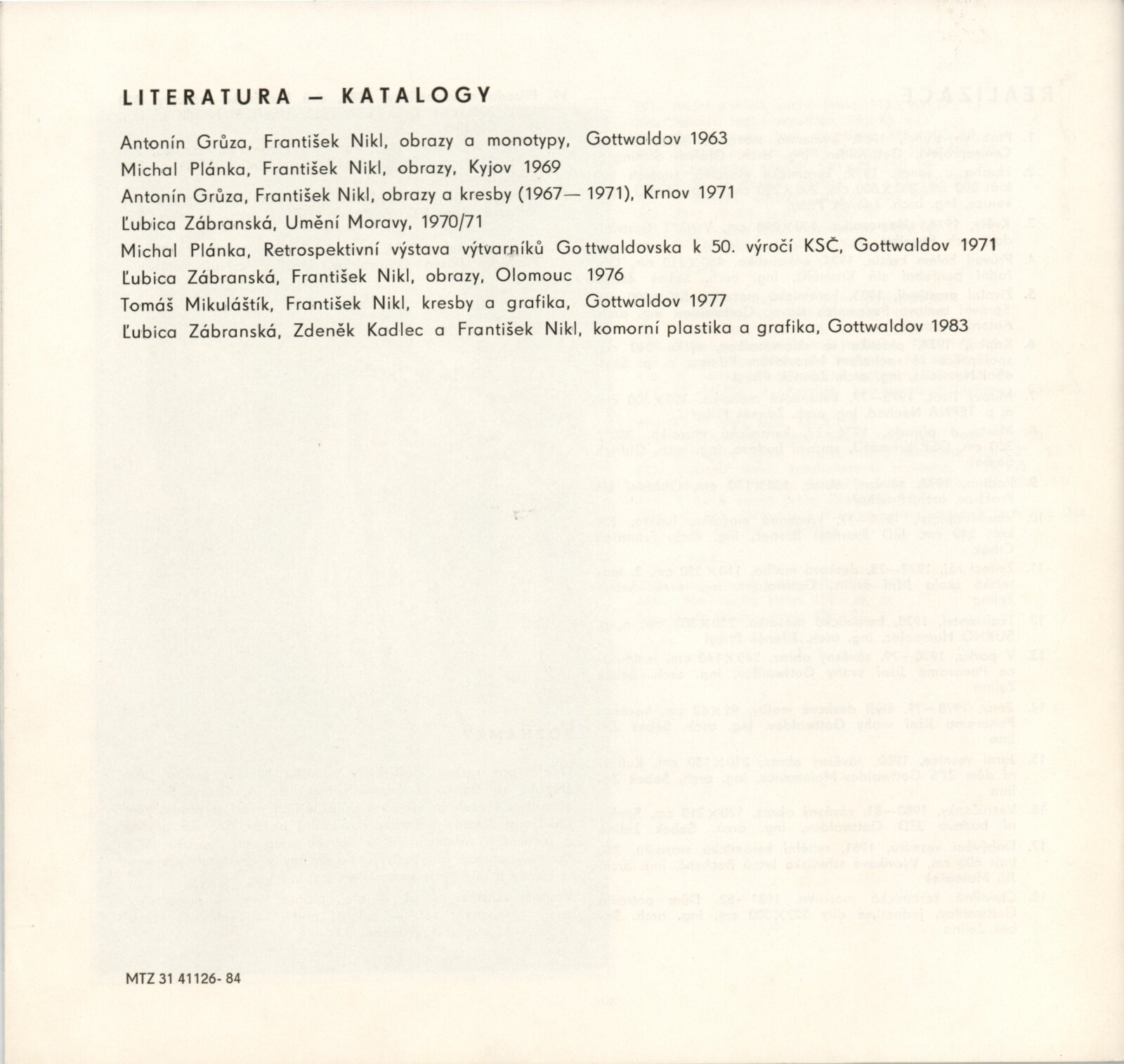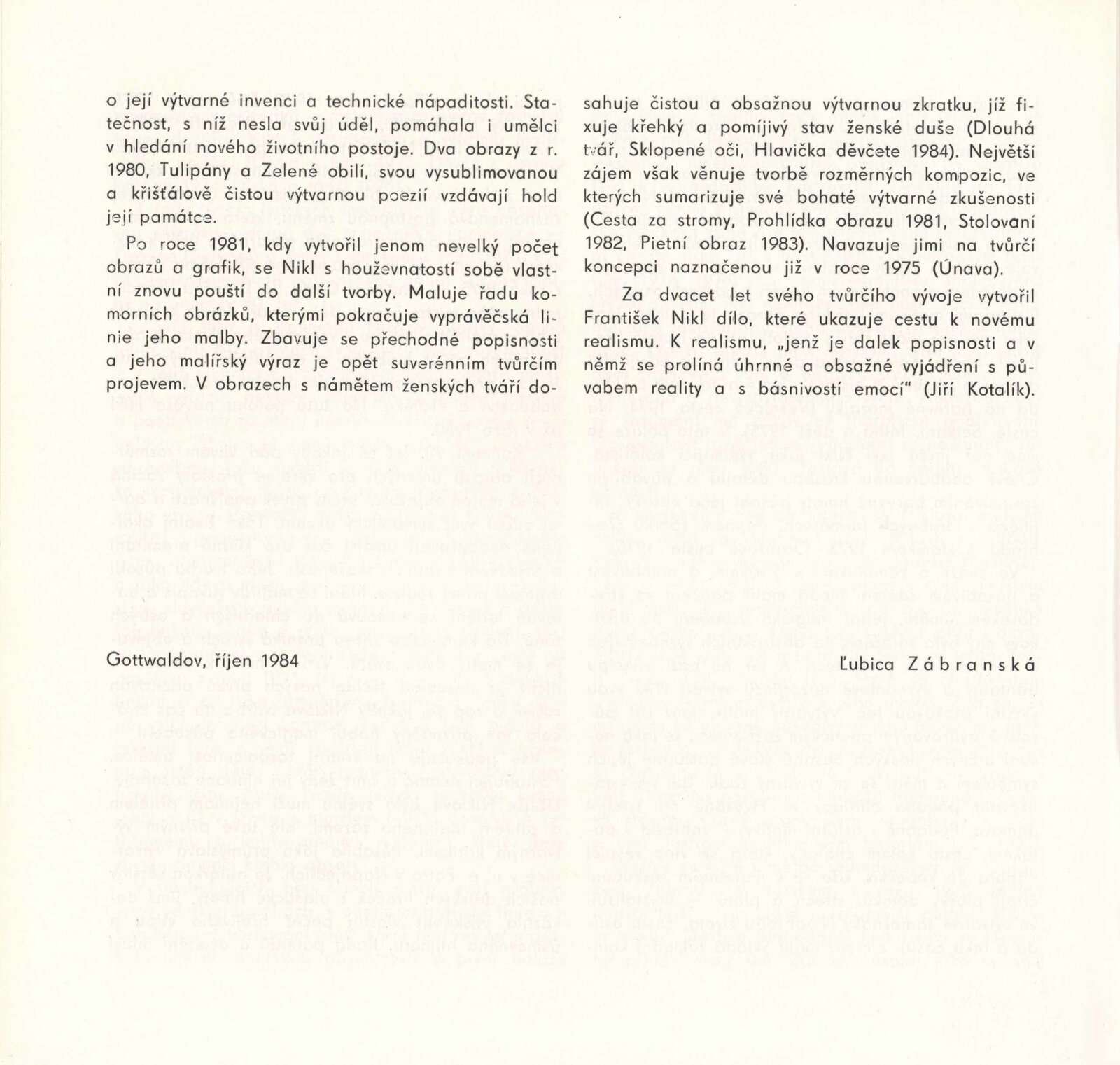 František Nikl. Malba a grafika 1963–1984: Dům umění, Galerie Jaroslava Krále, 14. 1. – 2. 2. 1986 / Převzatý katalog. František Nikl. Malba a grafika 1963–1984: Dům umění Gottwaldov prosinec 1984–leden 1985 / Text: Ĺubica Zábranská. – Hodonín: Galerie výtvarného umění, 1984. – 34 s., obr., portrét, životní data, výstavy, realizace, seznam výtvarných děl, DU 812. – MZK; MG