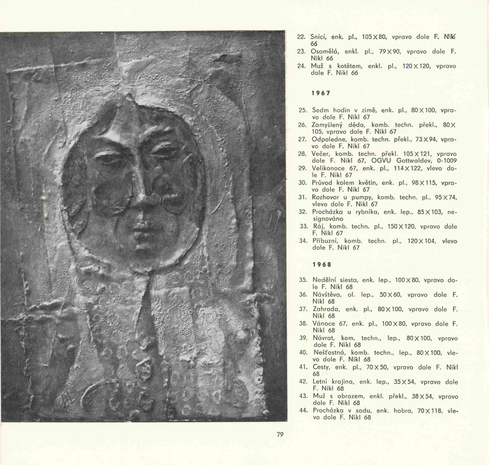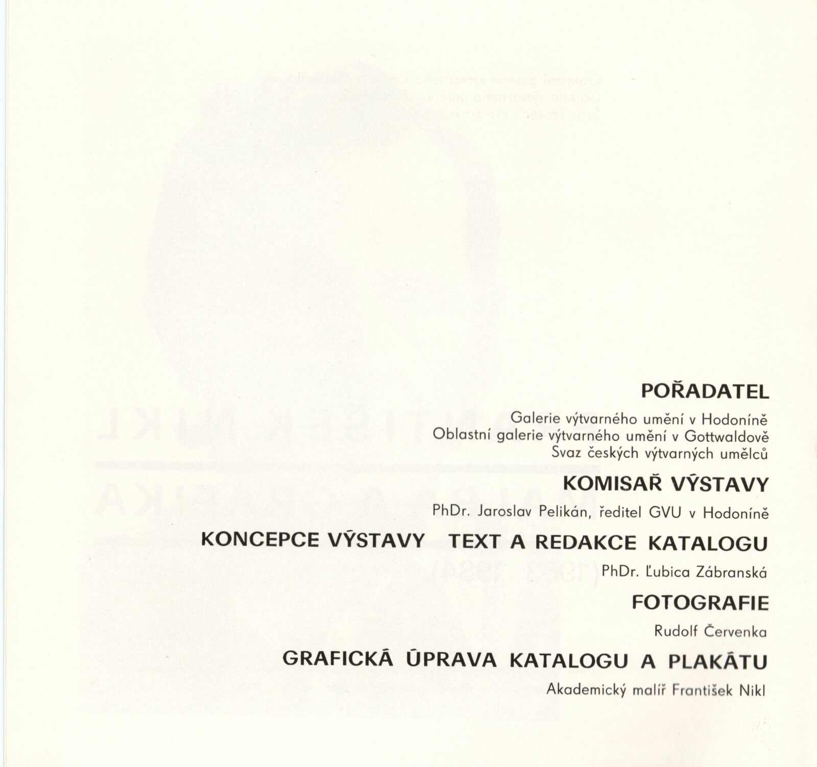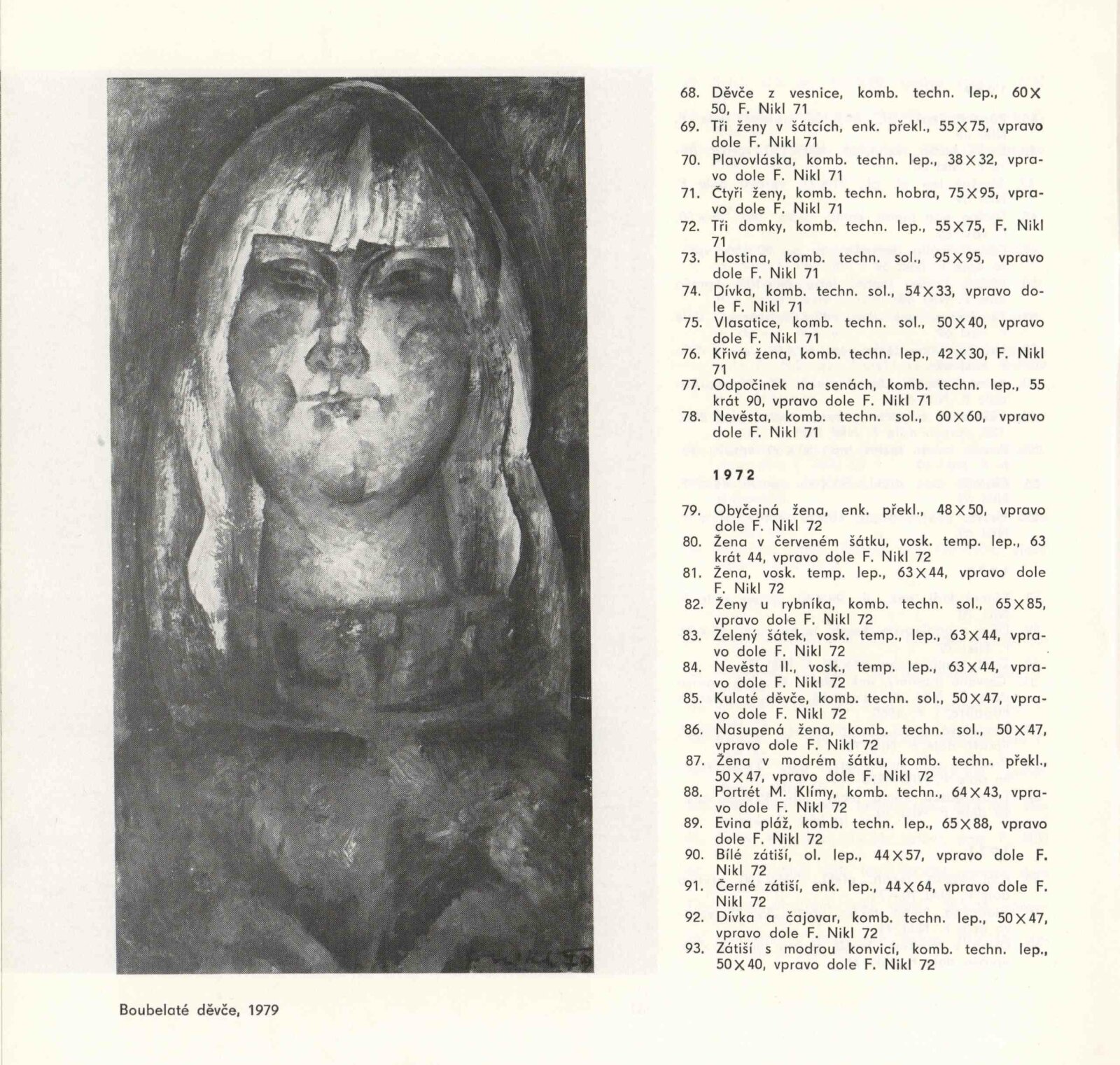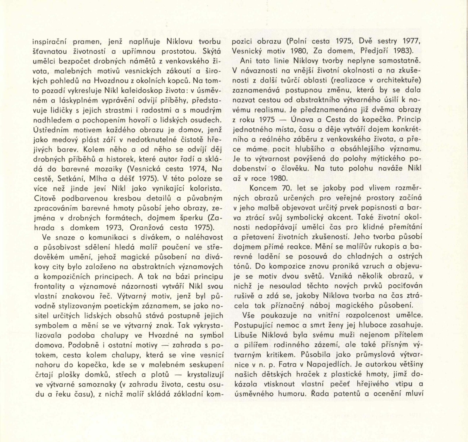 František Nikl. Malba a grafika 1963–1984: Dům umění, Galerie Jaroslava Krále, 14. 1. – 2. 2. 1986 / Převzatý katalog. František Nikl. Malba a grafika 1963–1984: Dům umění Gottwaldov prosinec 1984–leden 1985 / Text: Ĺubica Zábranská. – Hodonín: Galerie výtvarného umění, 1984. – 34 s., obr., portrét, životní data, výstavy, realizace, seznam výtvarných děl, DU 812. – MZK; MG
