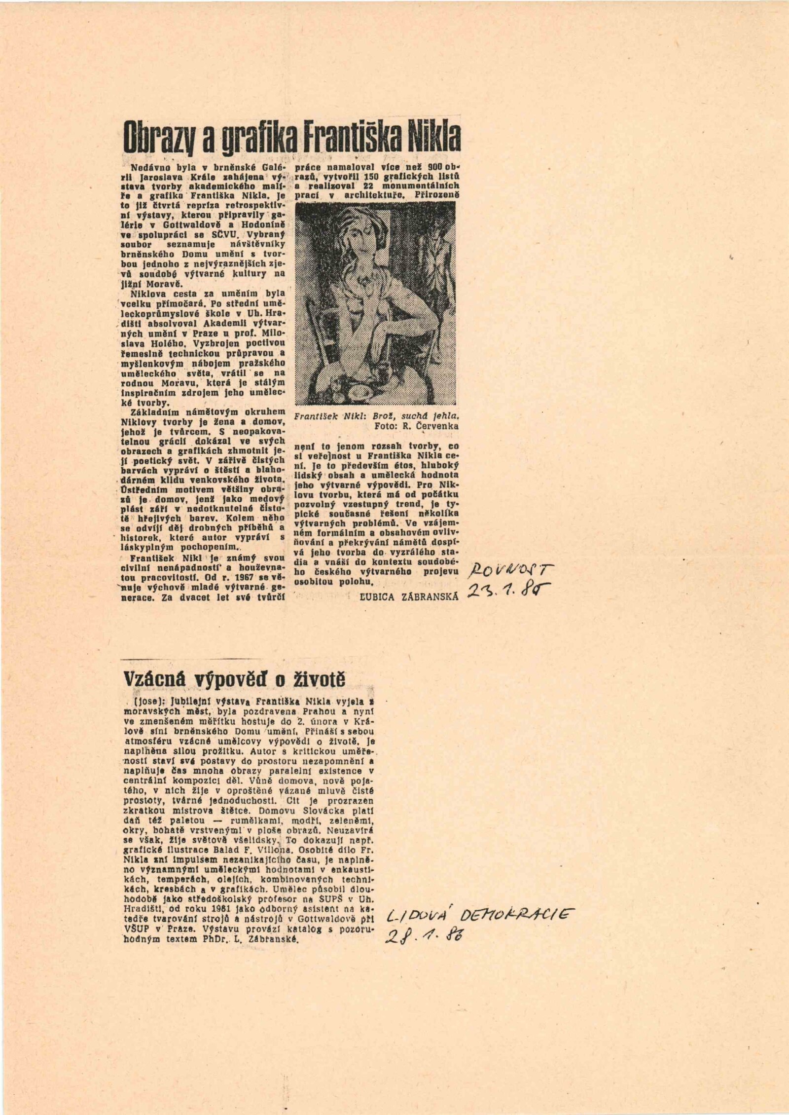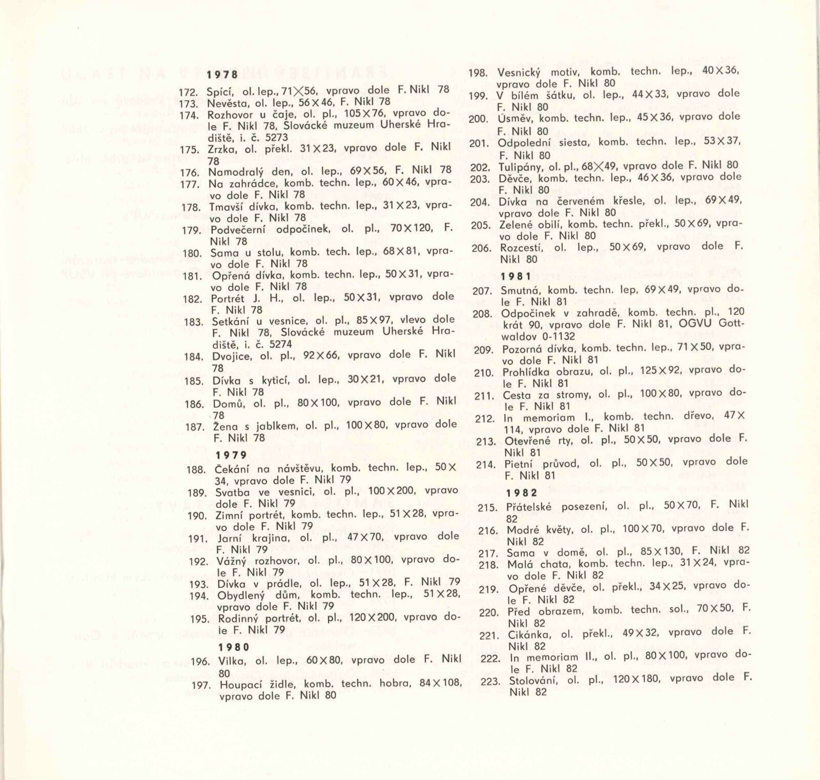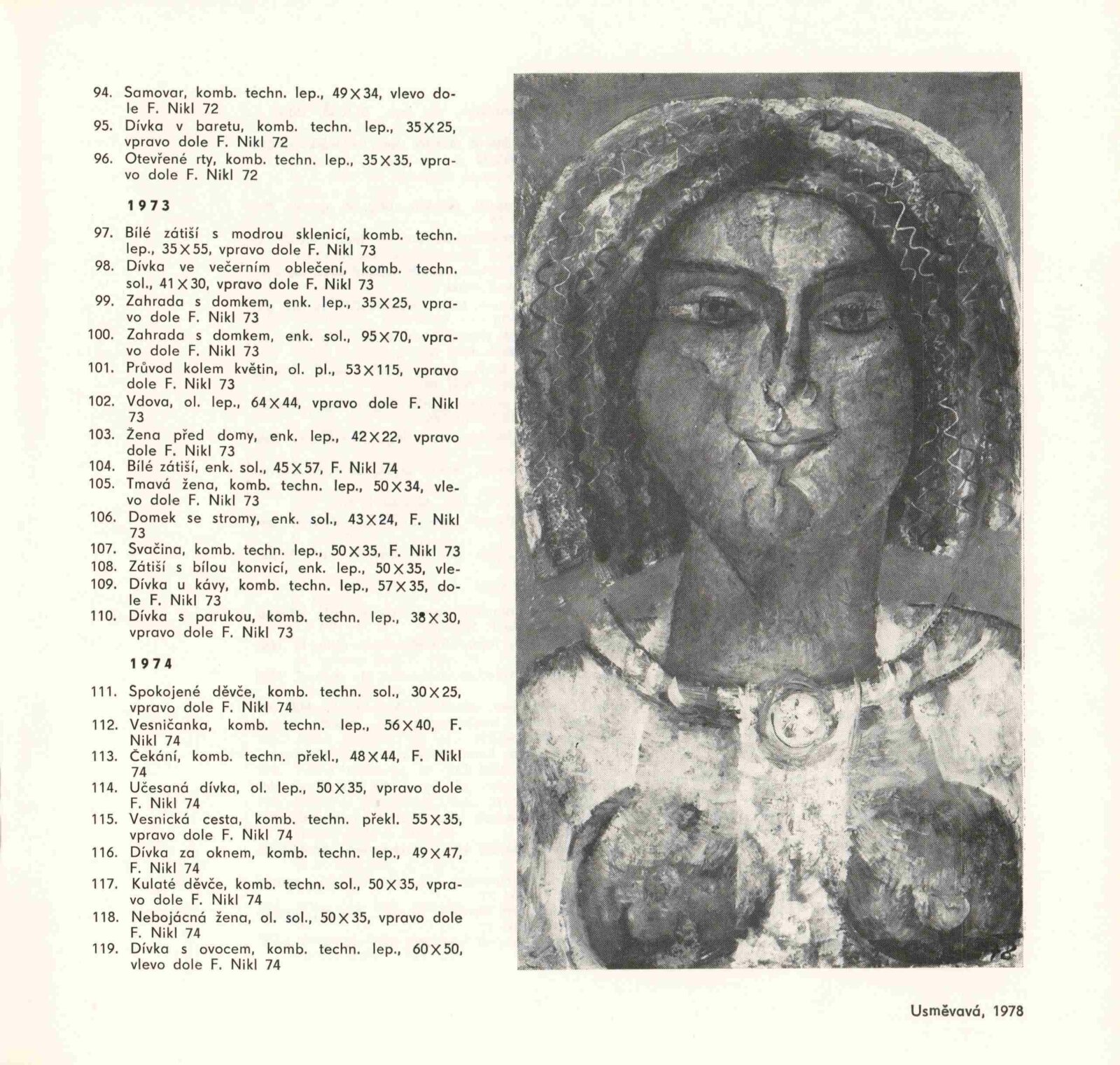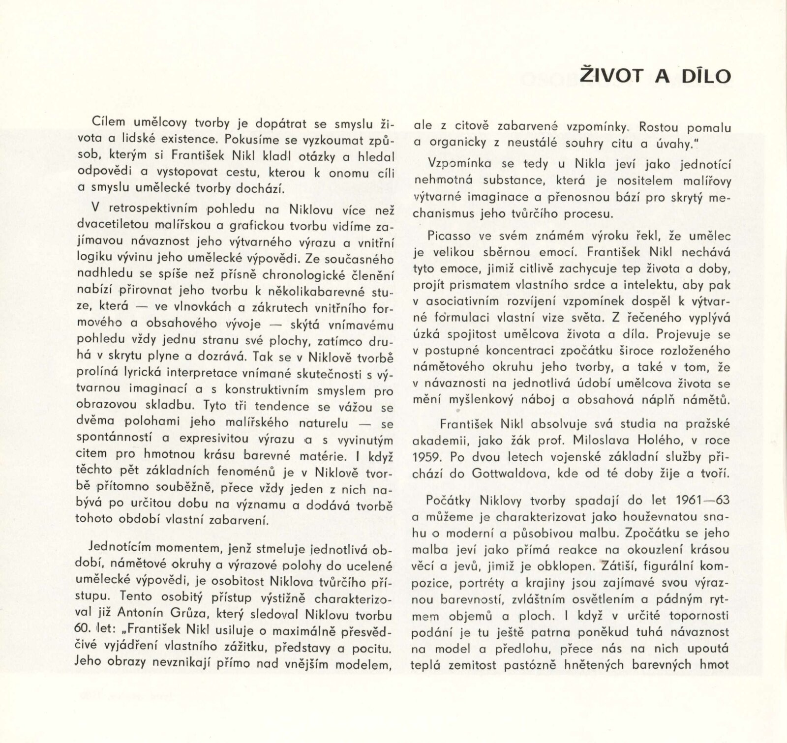 František Nikl. Malba a grafika 1963–1984: Dům umění, Galerie Jaroslava Krále, 14. 1. – 2. 2. 1986 / Převzatý katalog. František Nikl. Malba a grafika 1963–1984: Dům umění Gottwaldov prosinec 1984–leden 1985 / Text: Ĺubica Zábranská. – Hodonín: Galerie výtvarného umění, 1984. – 34 s., obr., portrét, životní data, výstavy, realizace, seznam výtvarných děl, DU 812. – MZK; MG