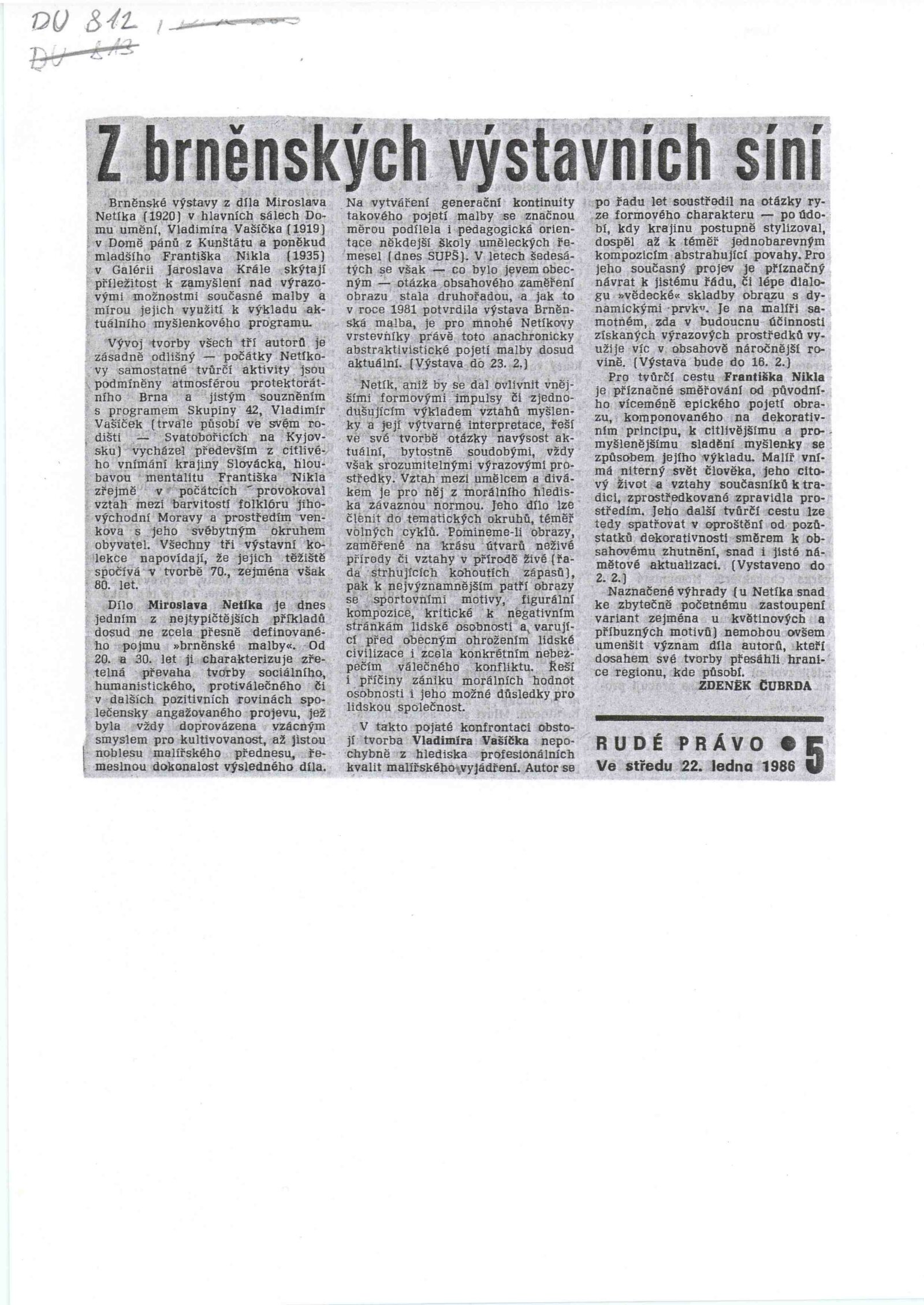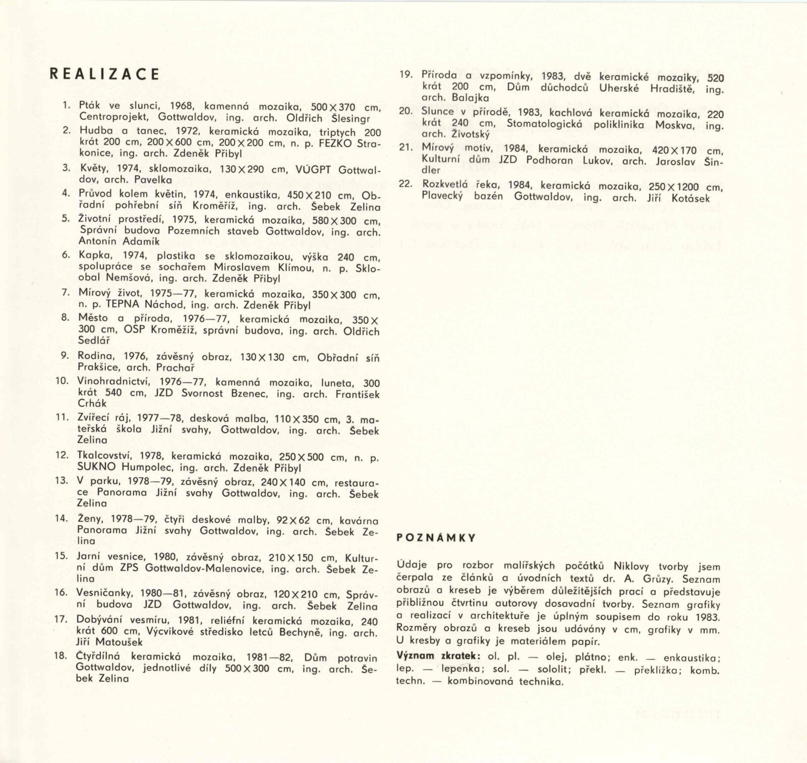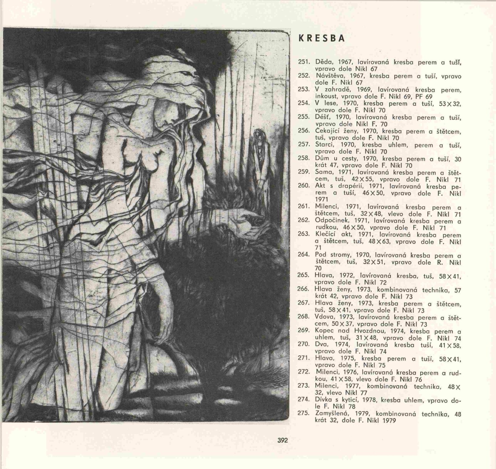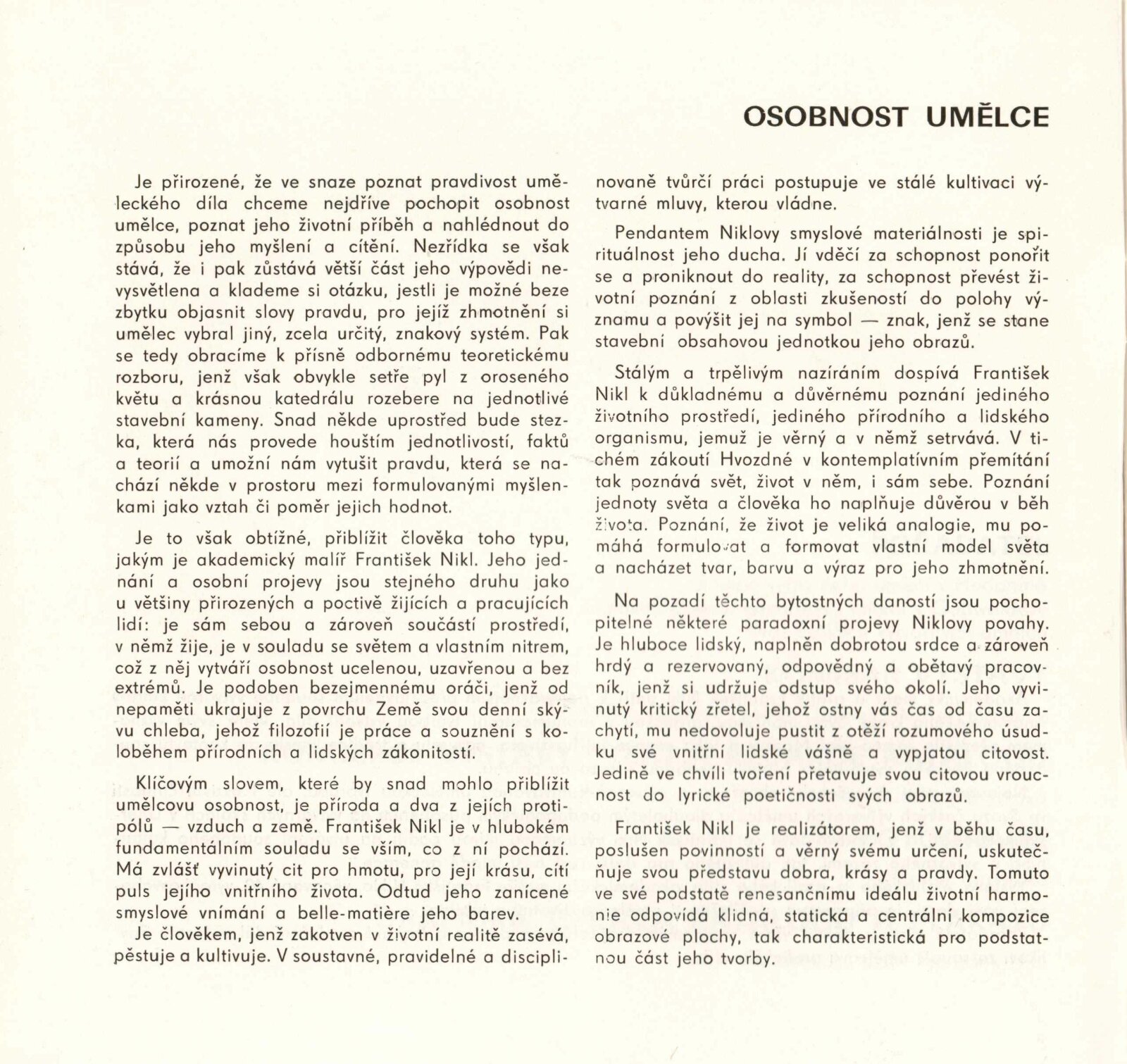 František Nikl. Malba a grafika 1963–1984: Dům umění, Galerie Jaroslava Krále, 14. 1. – 2. 2. 1986 / Převzatý katalog. František Nikl. Malba a grafika 1963–1984: Dům umění Gottwaldov prosinec 1984–leden 1985 / Text: Ĺubica Zábranská. – Hodonín: Galerie výtvarného umění, 1984. – 34 s., obr., portrét, životní data, výstavy, realizace, seznam výtvarných děl, DU 812. – MZK; MG