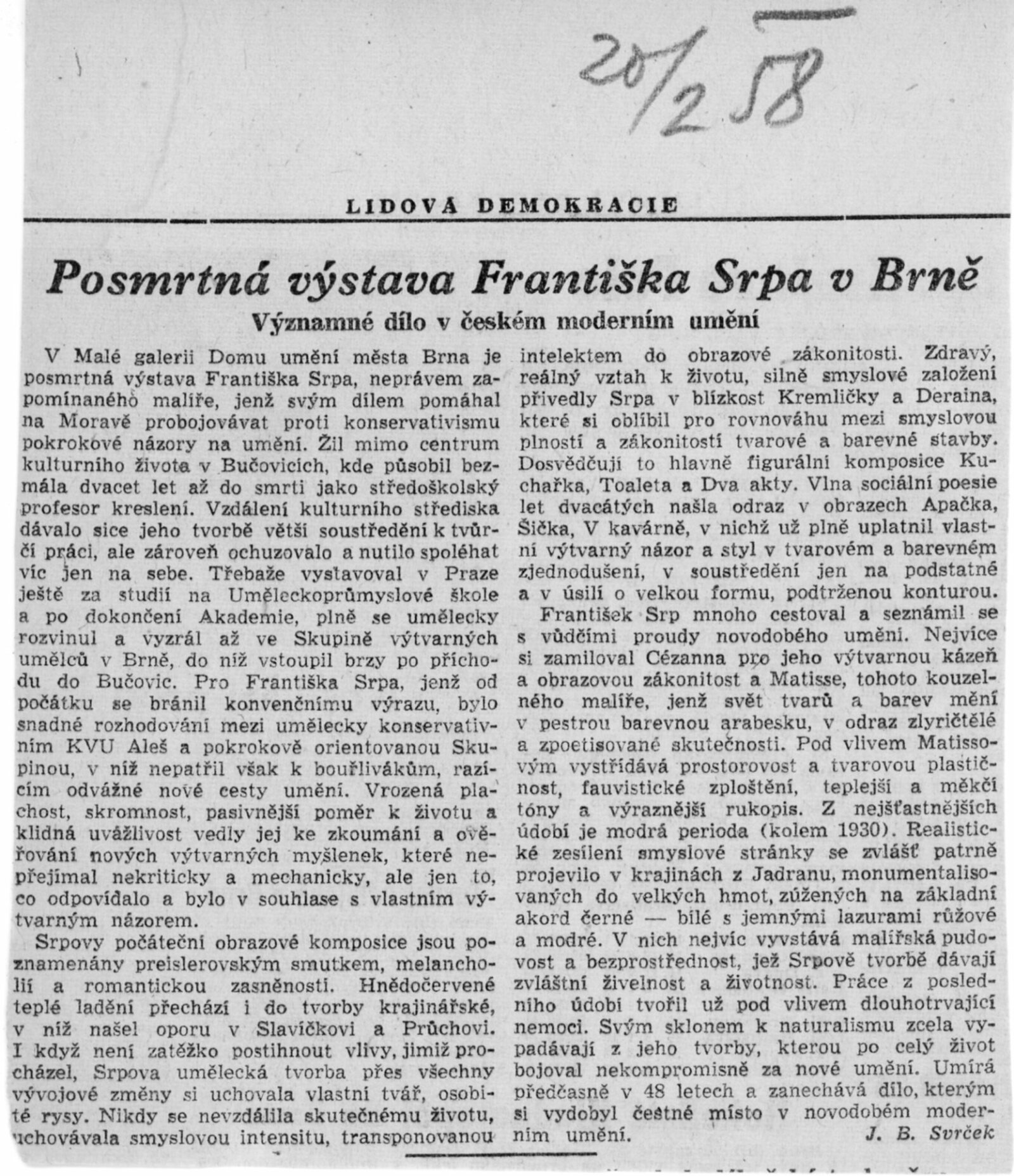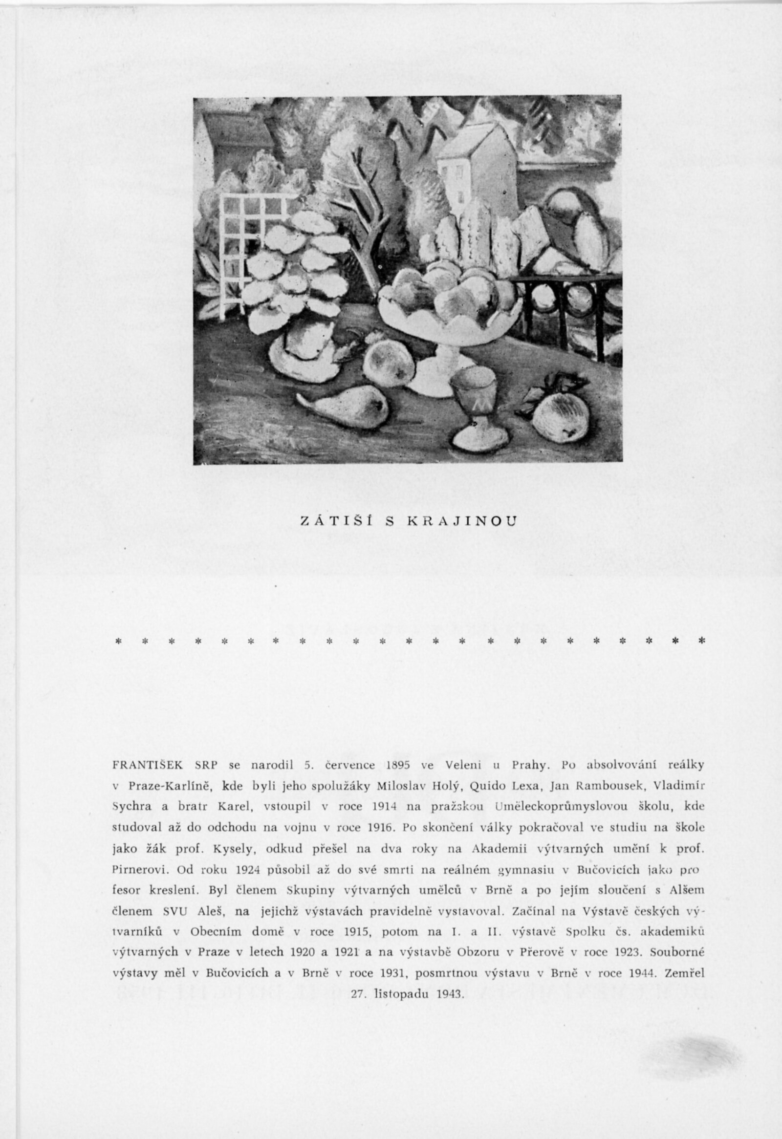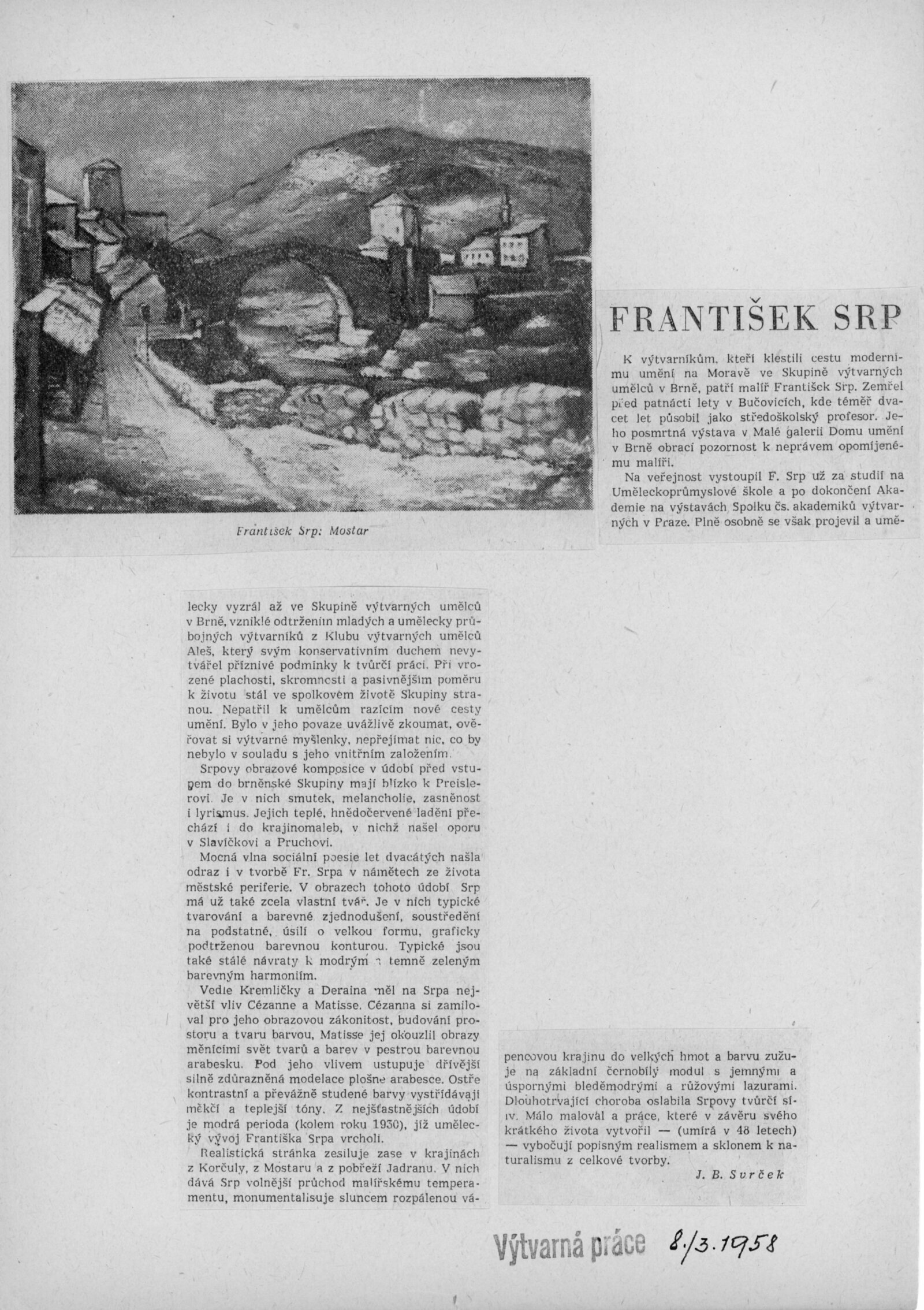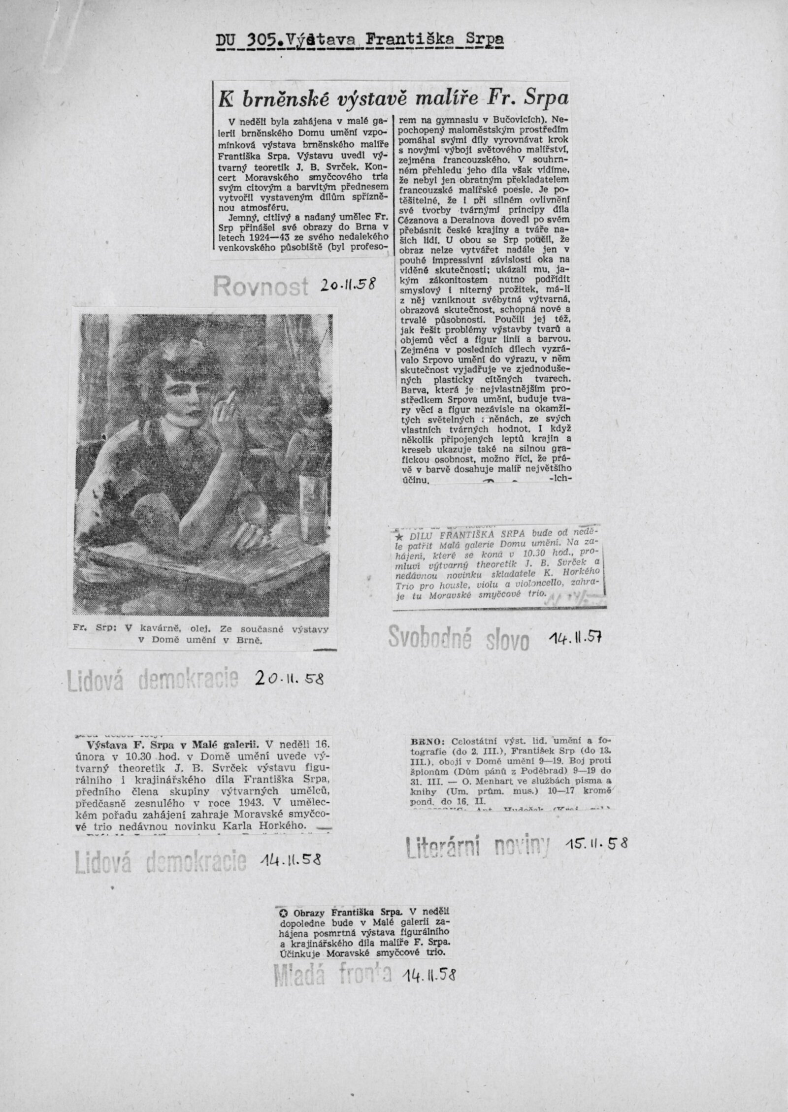 František Srp. Posmrtná výstava 1958: Dům umění, Malá galerie, 16. 2. – 16. 3. 1958 / Text: J. B. Svrček. – Brno: DUmB, 1958. – skládačka, 6 s., obr., životopis, DU 305. – MZK; MG; MMB