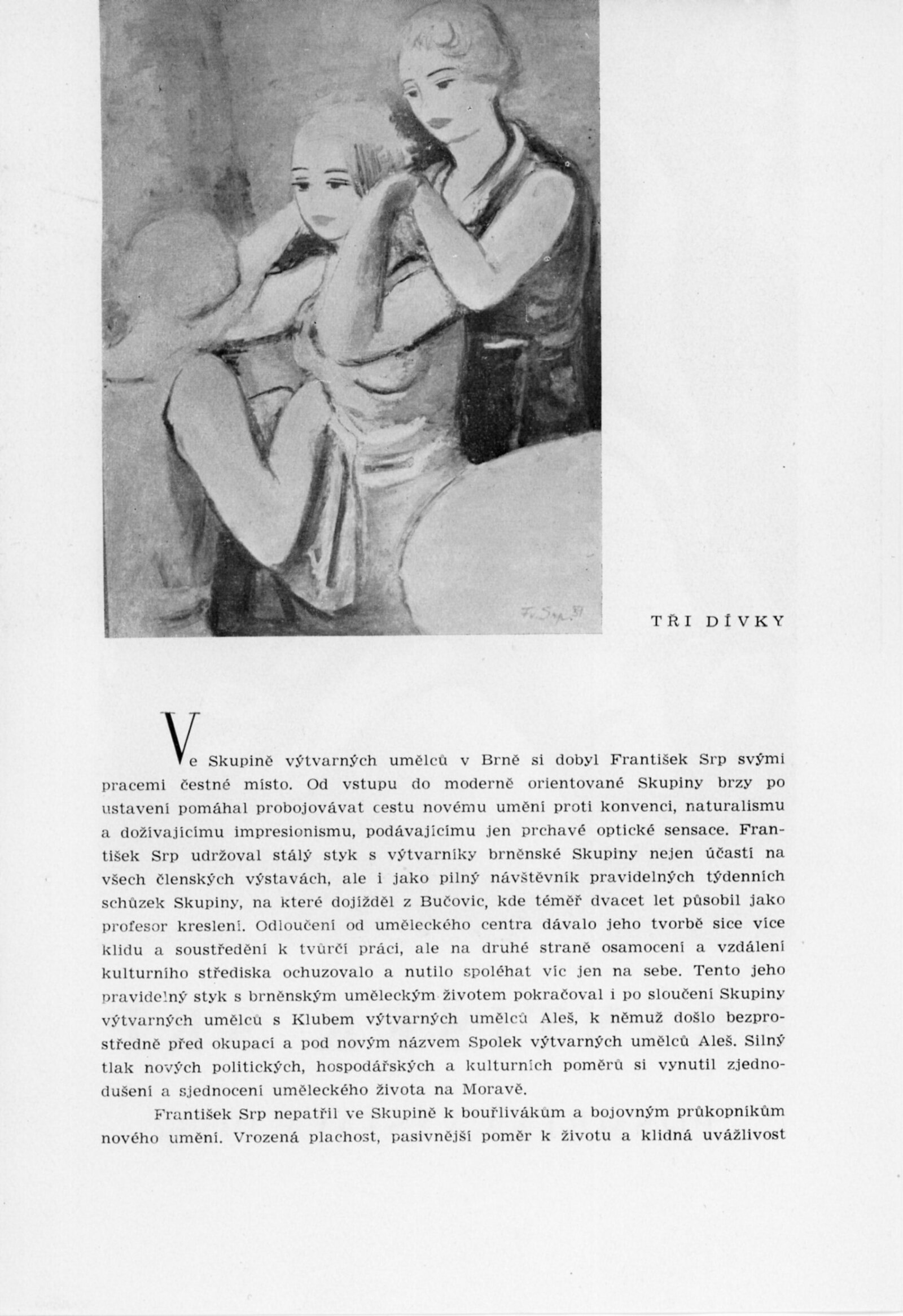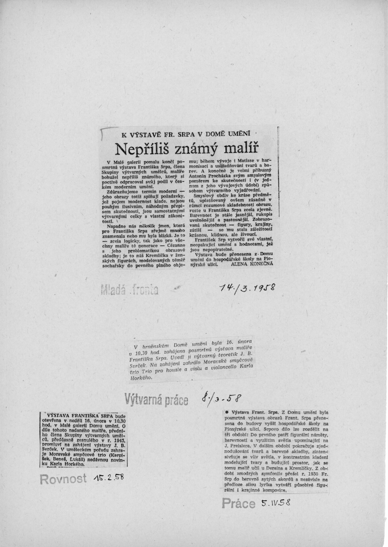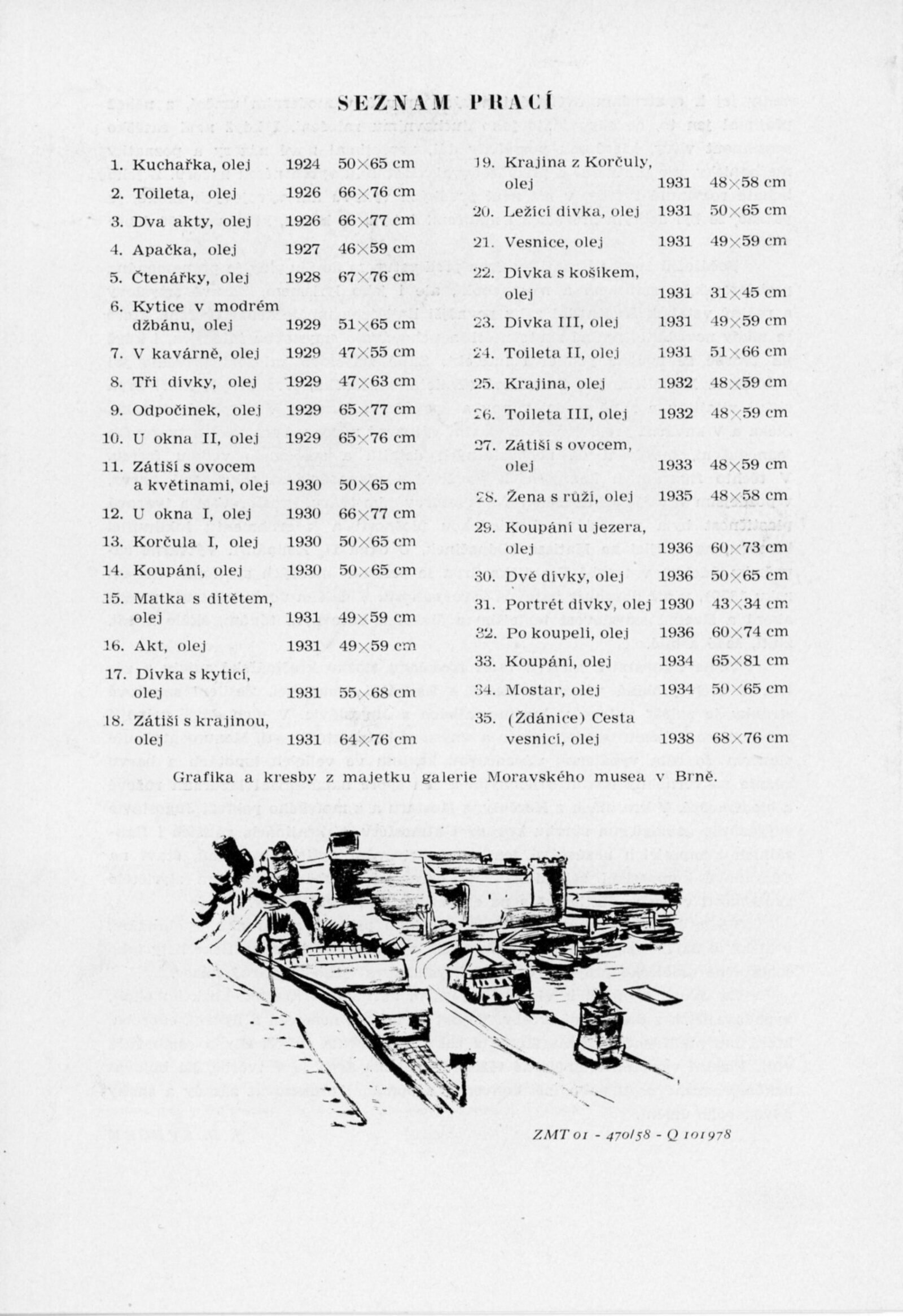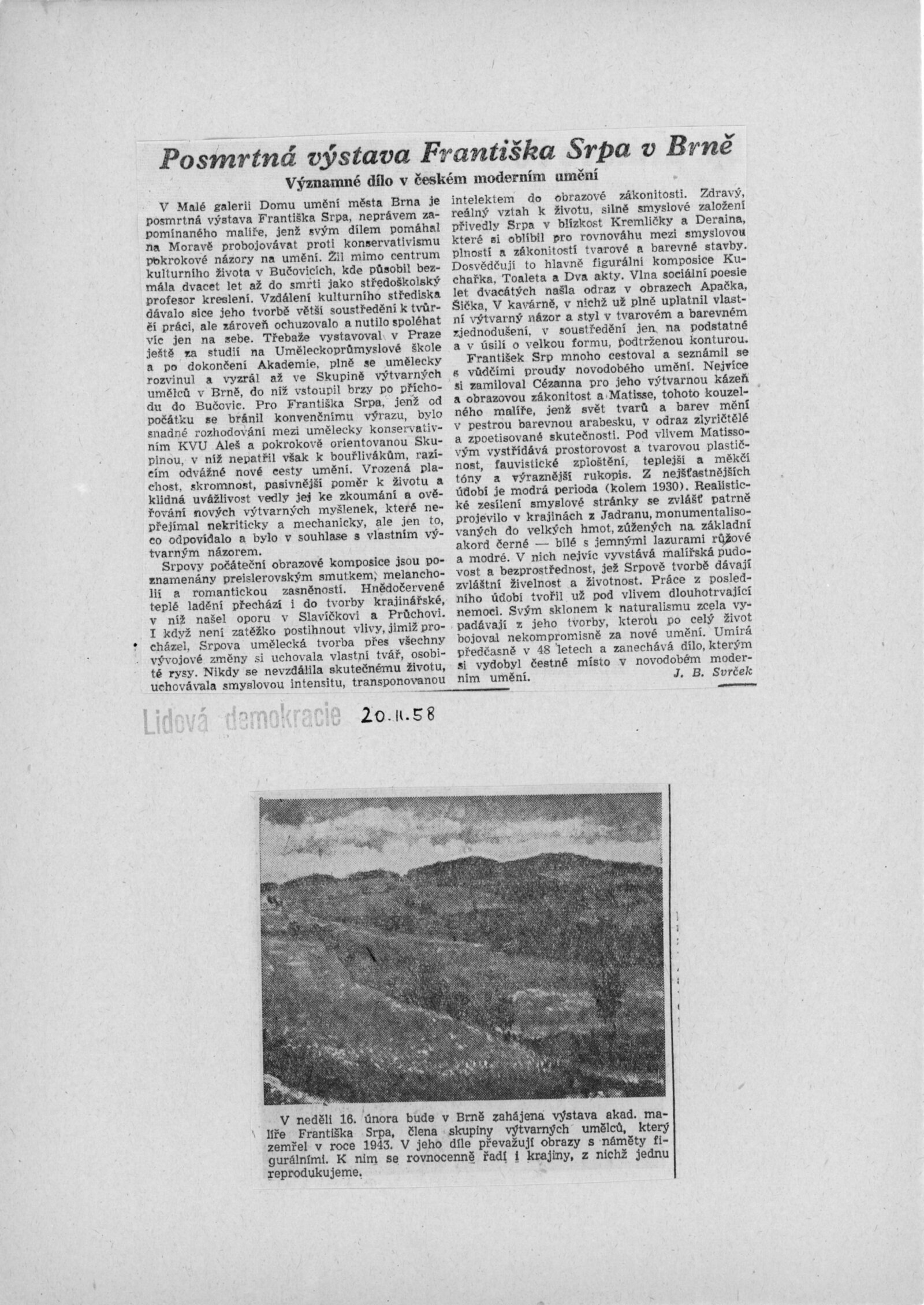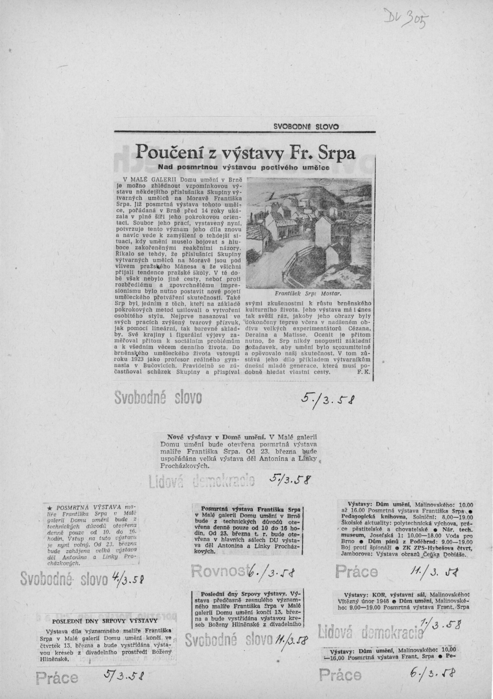František Srp. Posmrtná výstava 1958: Dům umění, Malá galerie, 16. 2. – 16. 3. 1958 / Text: J. B. Svrček. – Brno: DUmB, 1958. – skládačka, 6 s., obr., životopis, DU 305. – MZK; MG; MMB