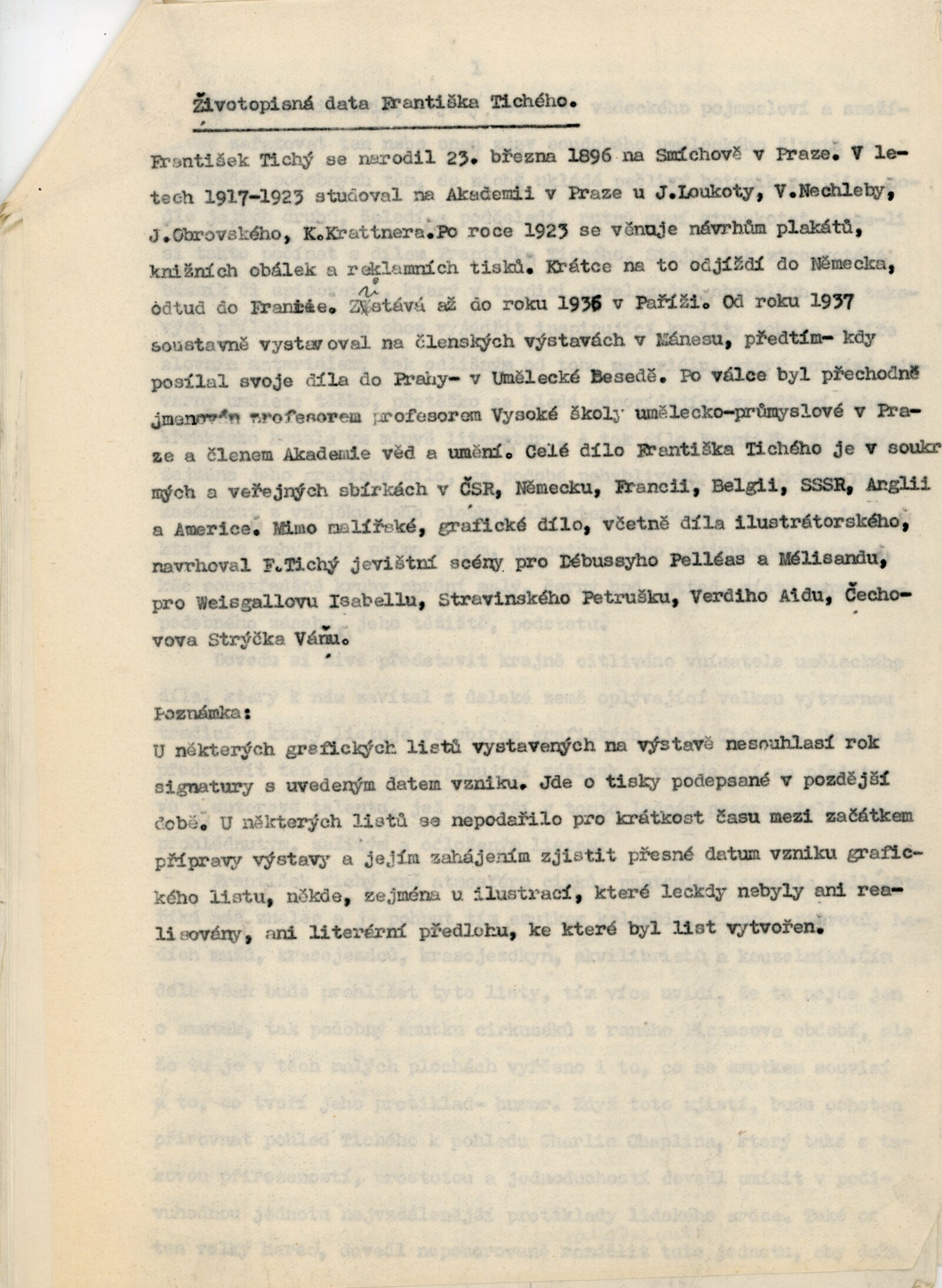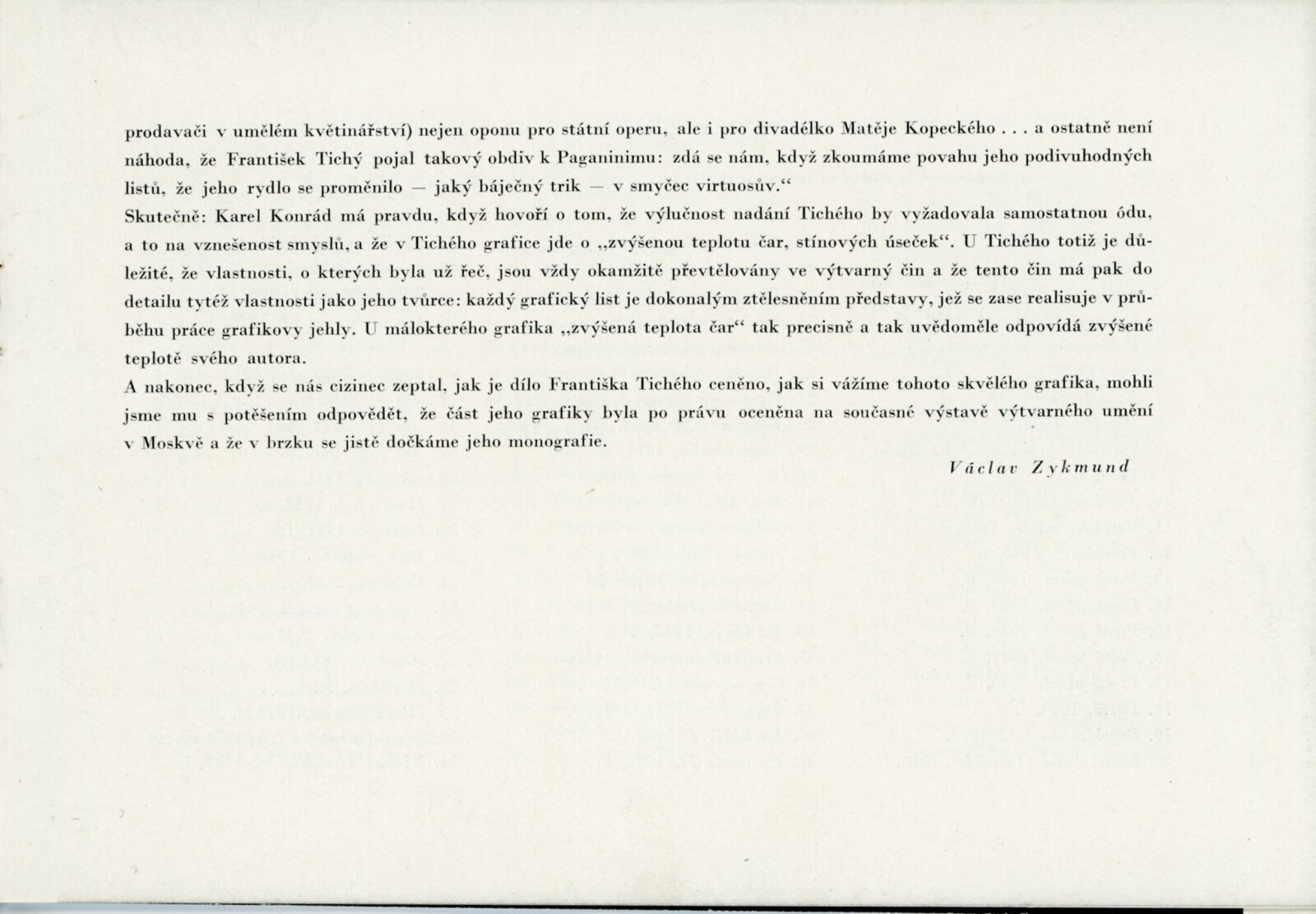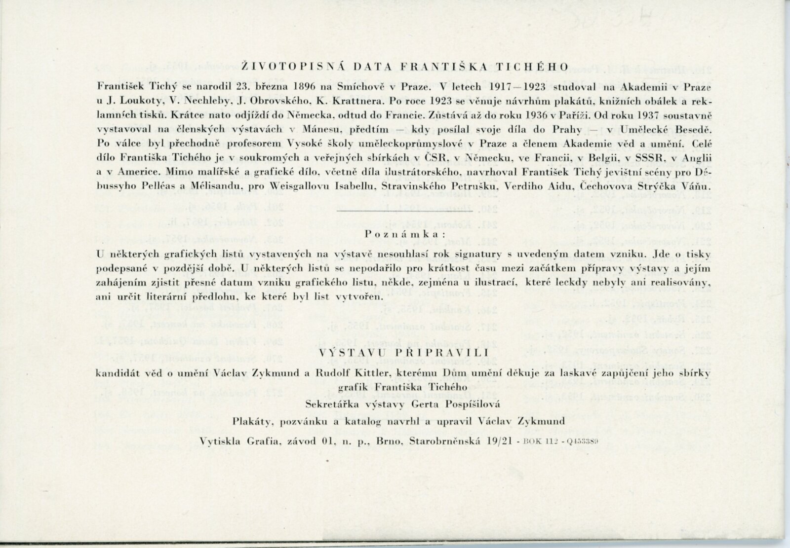 Souborná výstava grafiky Františka Tichého: Dům umění, 7. 2. – 30. 3. 1959 / Text: Václav Zykmund. – Brno: DUmB, 1959. – 17 s., obr., DU 324. – MZK; MG