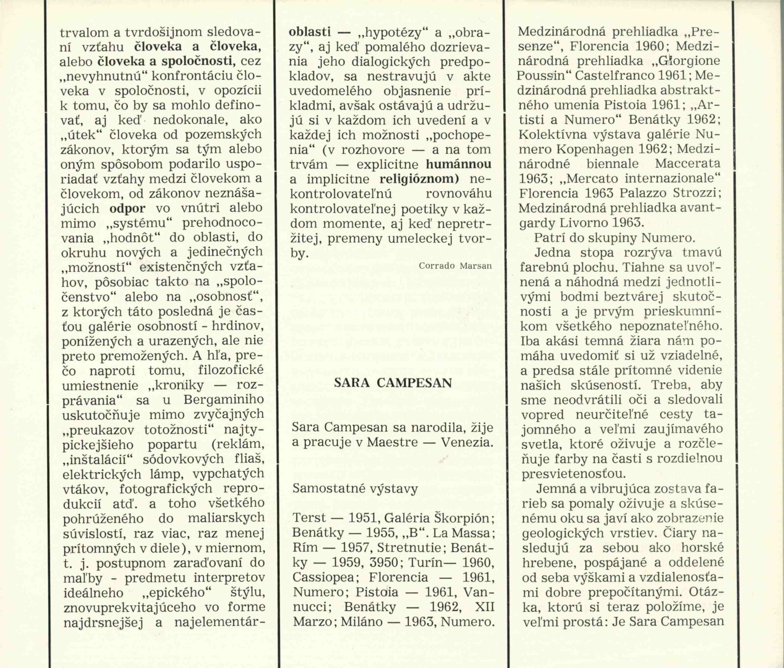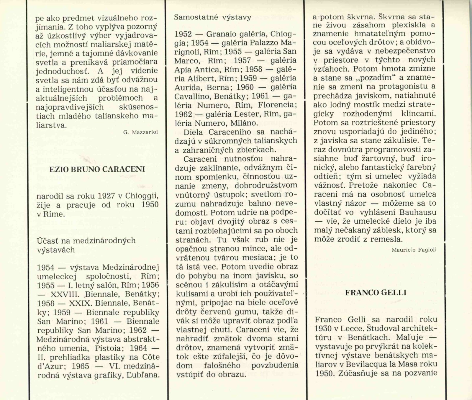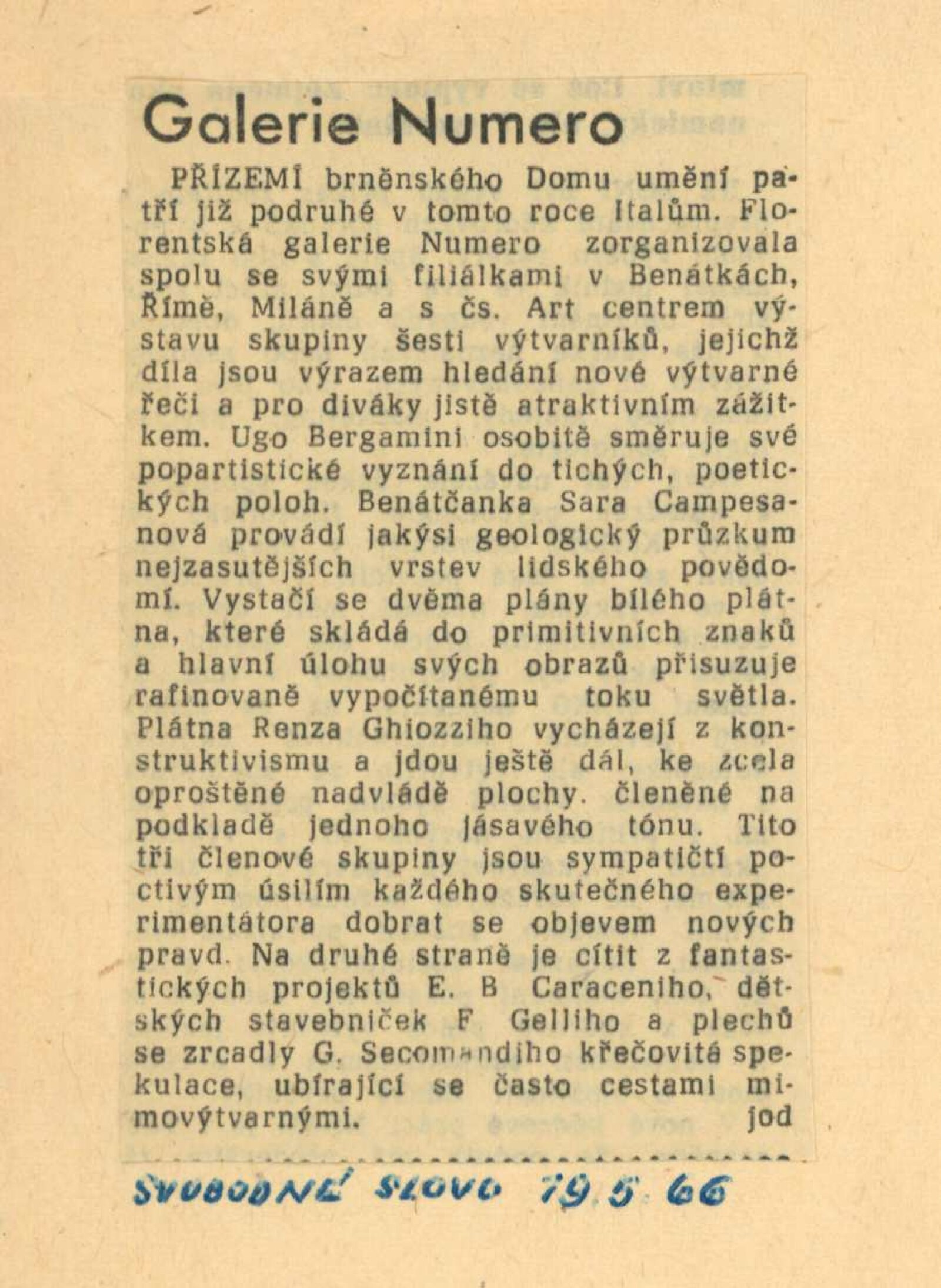 Výstava galérie Numero, Firenze: Dům umění města Brna, hala, 14. 5. – 5. 6. 1966 / Texty: několika italských autorů. – Bratislava: Vydavatelstvo SSVU, 1966. – 22 s., obr., medailony jednotlivých umělců, DU 460. – MZK; MG