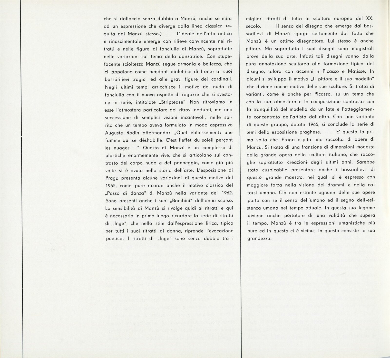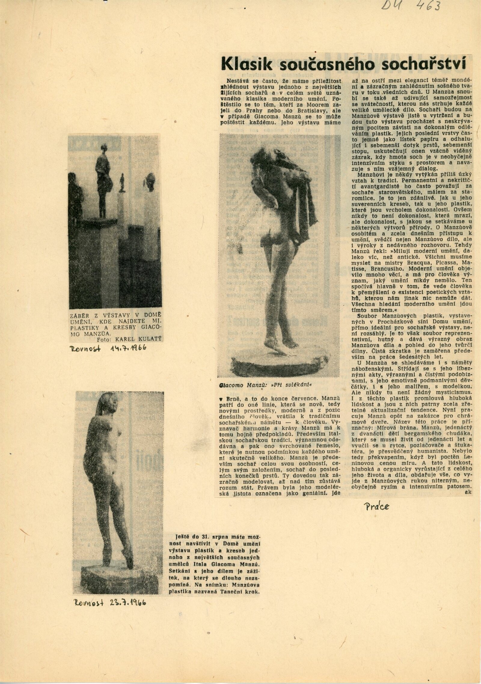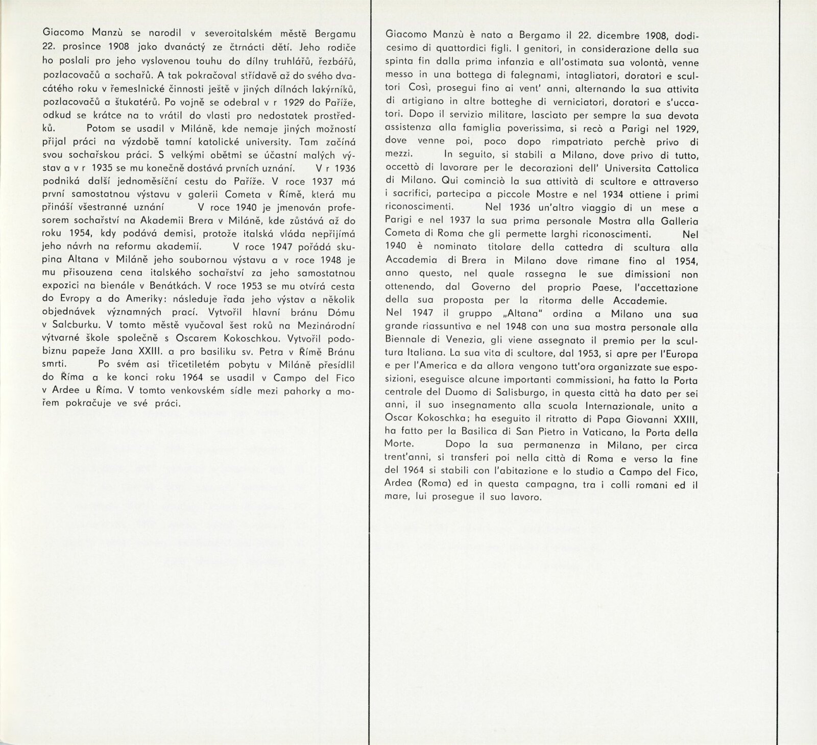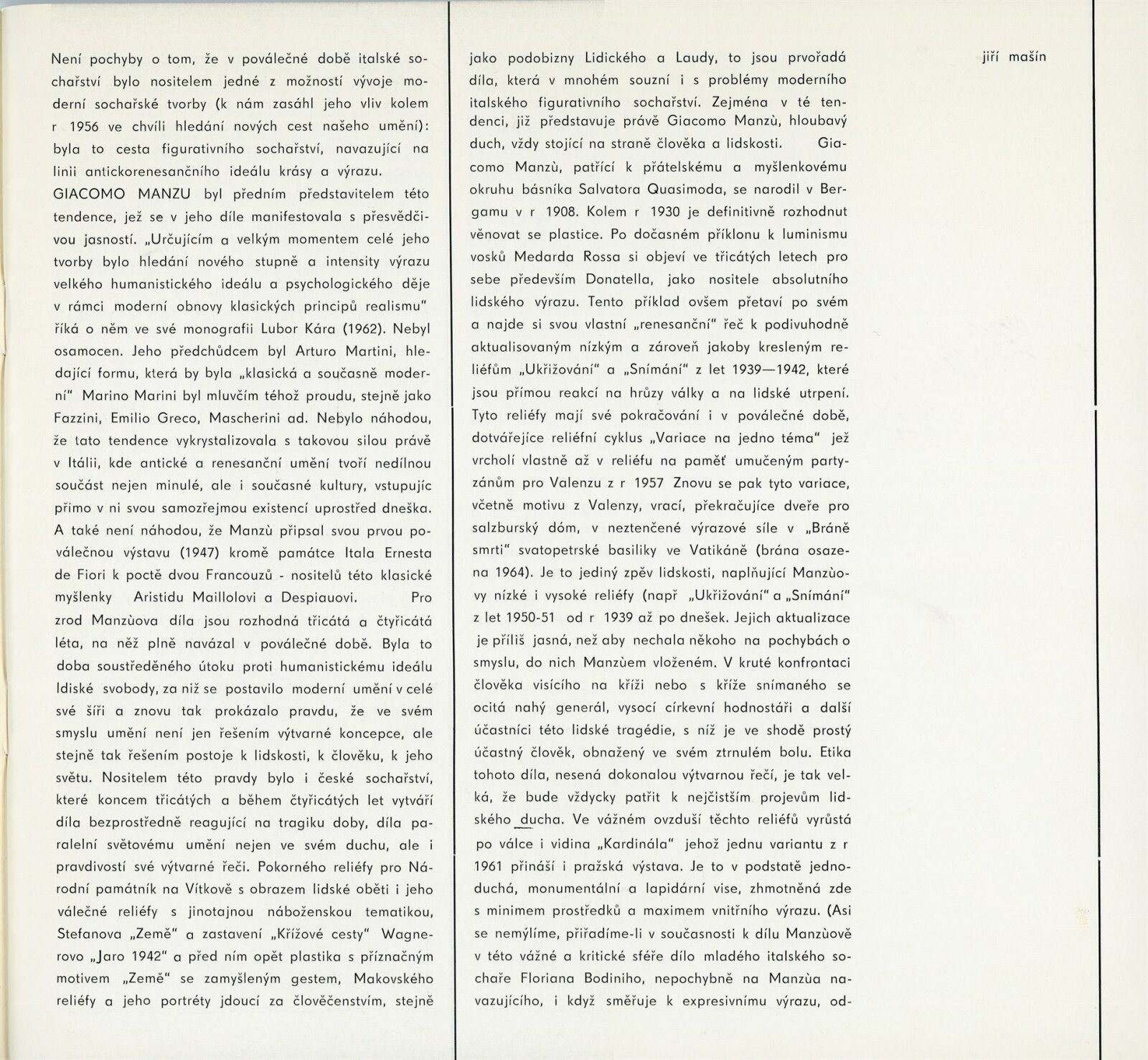 Giacomo Manzú. Plastiky a kresby: Dům umění města Brna, Procházkova síň, 2. 7. – 31. 7. 1966 / Převzatý katalog. Giacomo Manzú: 14. výstava Galerie Vincence Kramáře, 8. 5. – 20. 6. 1966 / Text: Jiří Mašín. – Praha: SČSVU, 1966. – 32 s., obr., portrét, životopis, DU 463. – MG