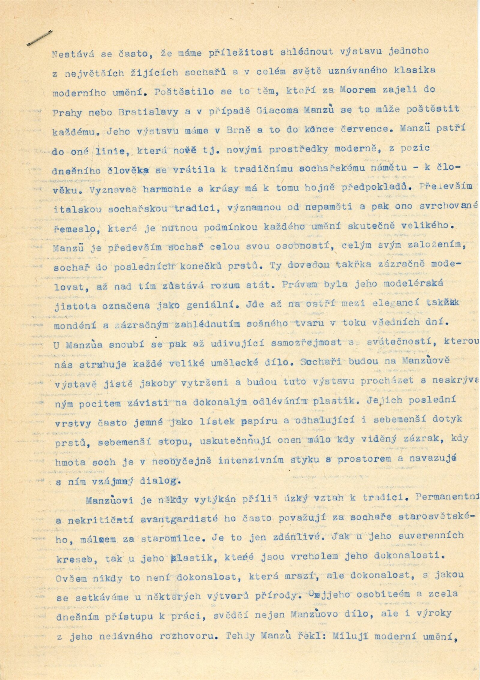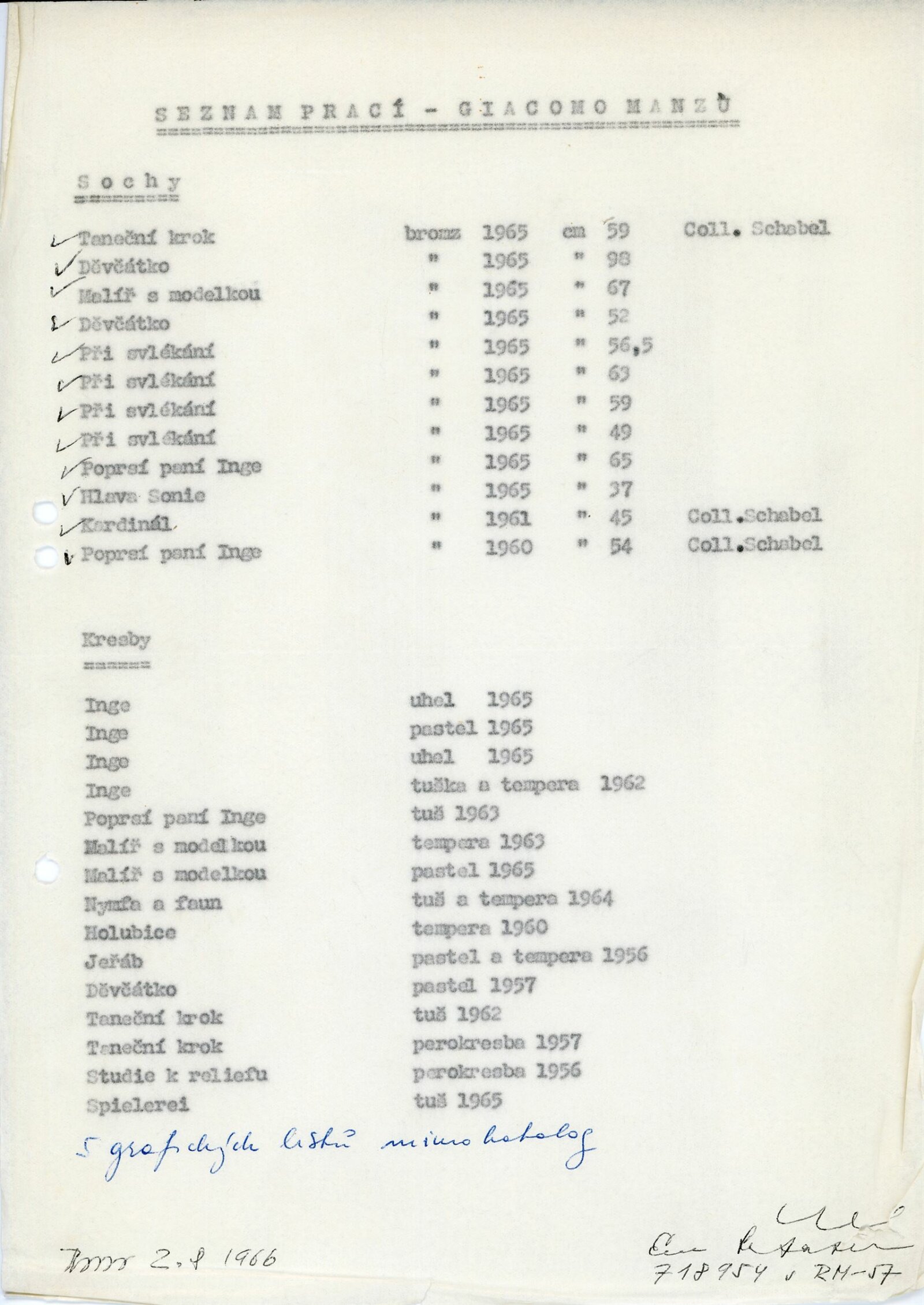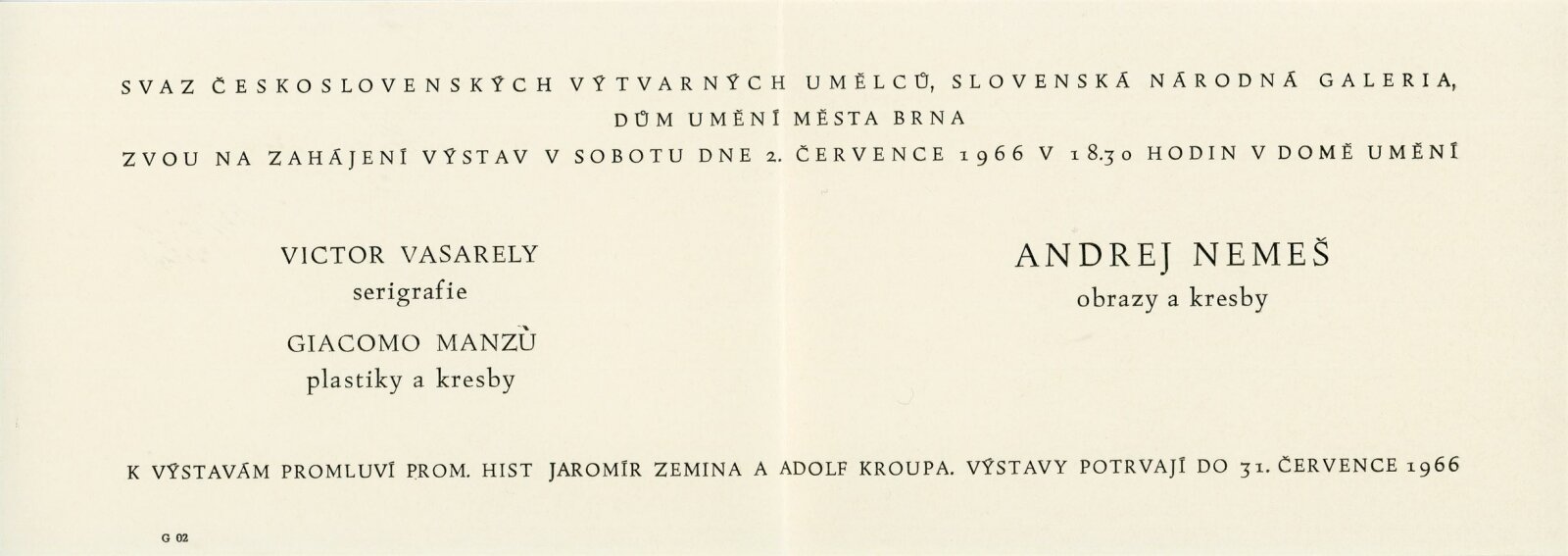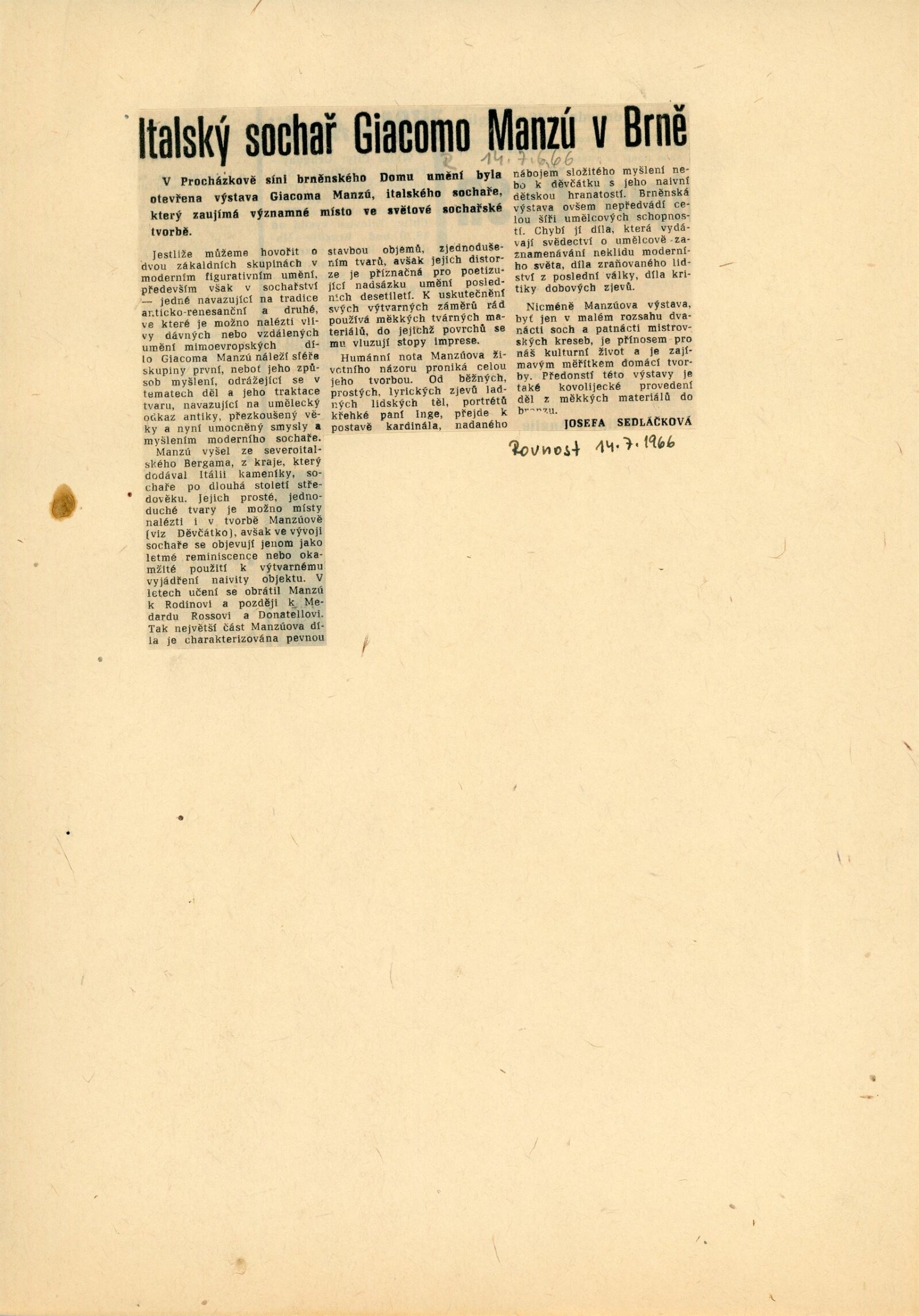 Giacomo Manzú. Plastiky a kresby: Dům umění města Brna, Procházkova síň, 2. 7. – 31. 7. 1966 / Převzatý katalog. Giacomo Manzú: 14. výstava Galerie Vincence Kramáře, 8. 5. – 20. 6. 1966 / Text: Jiří Mašín. – Praha: SČSVU, 1966. – 32 s., obr., portrét, životopis, DU 463. – MG