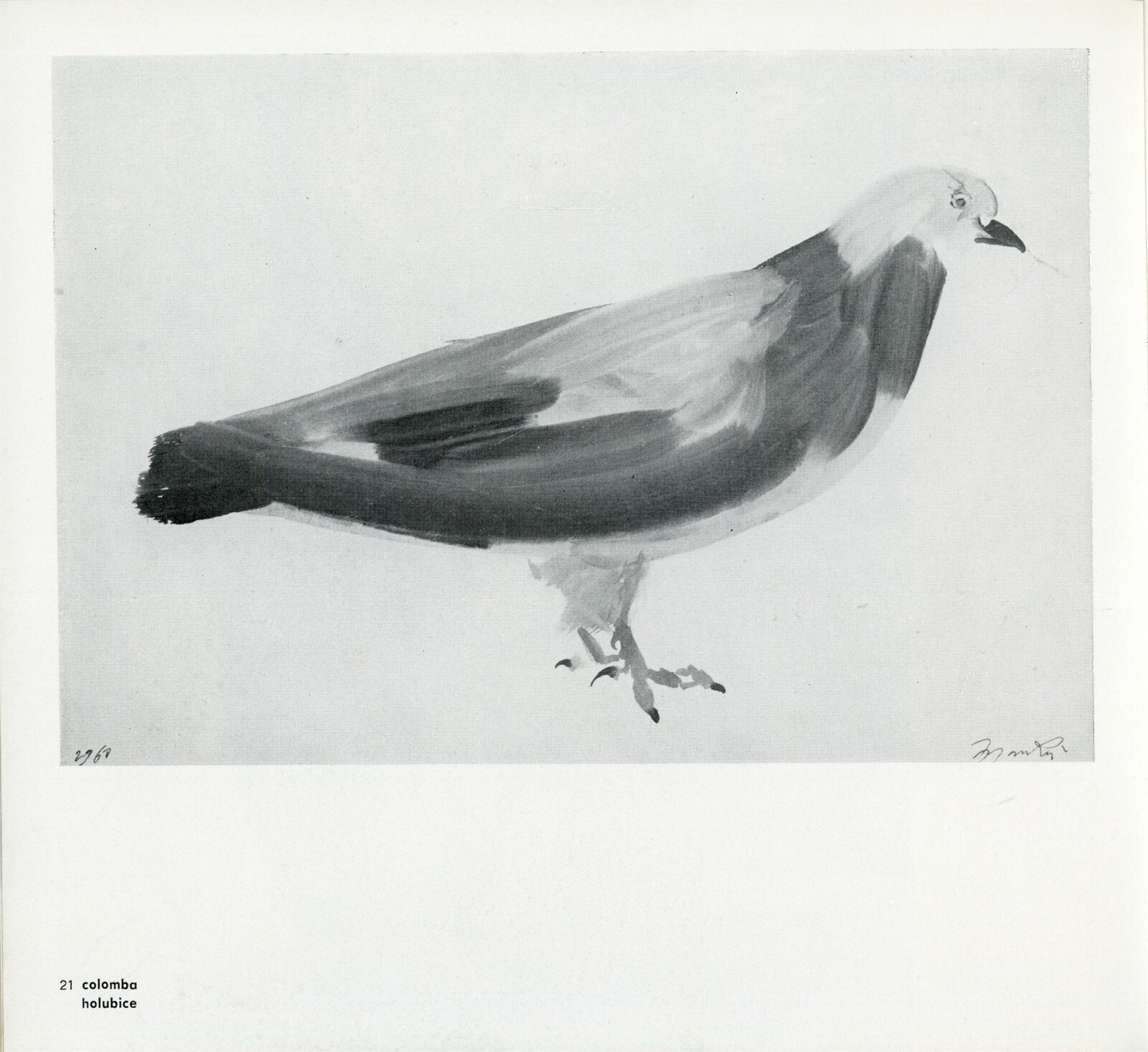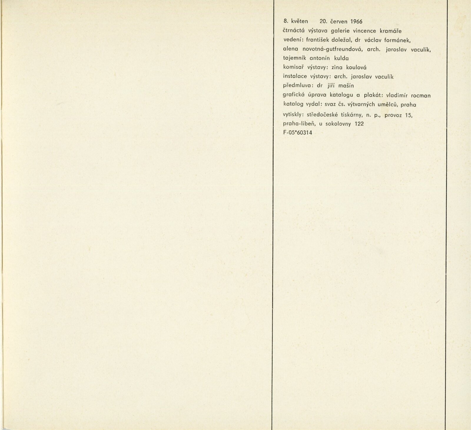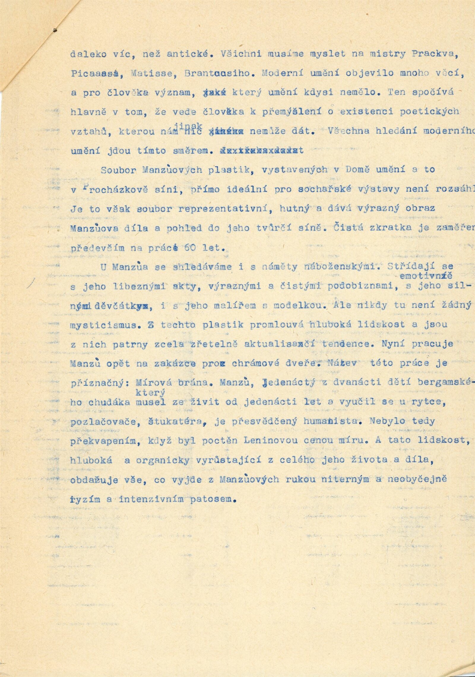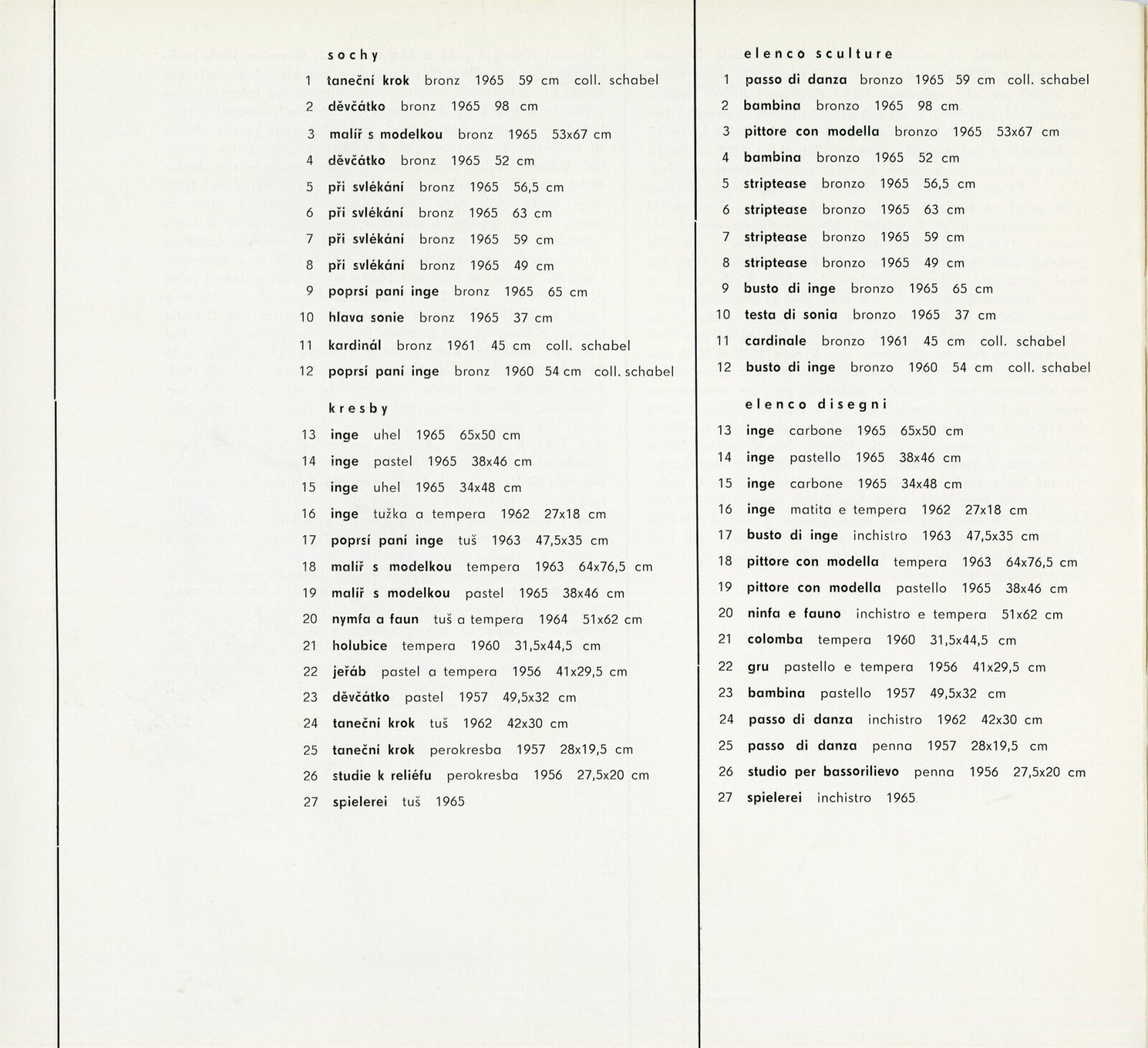 Giacomo Manzú. Plastiky a kresby: Dům umění města Brna, Procházkova síň, 2. 7. – 31. 7. 1966 / Převzatý katalog. Giacomo Manzú: 14. výstava Galerie Vincence Kramáře, 8. 5. – 20. 6. 1966 / Text: Jiří Mašín. – Praha: SČSVU, 1966. – 32 s., obr., portrét, životopis, DU 463. – MG