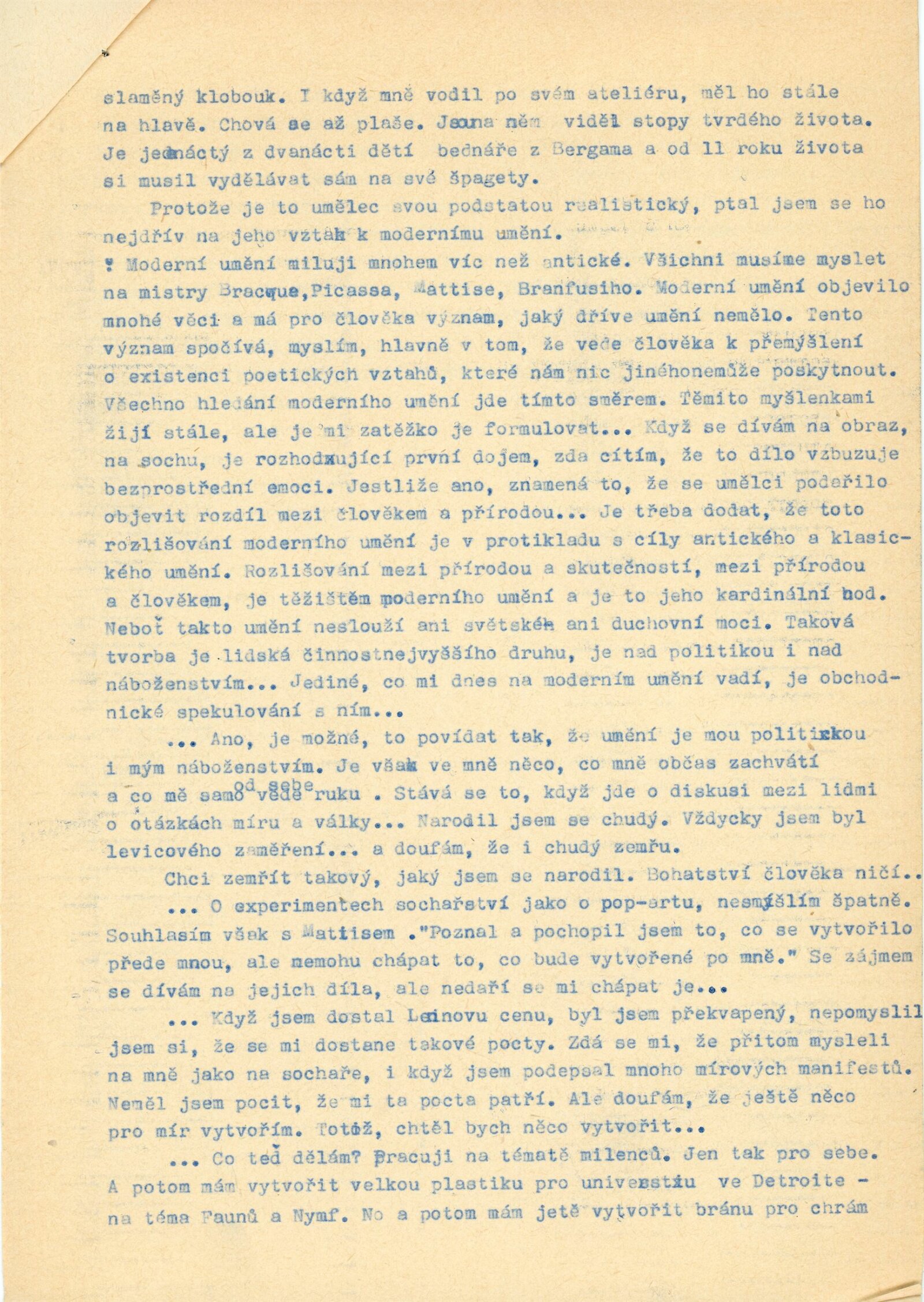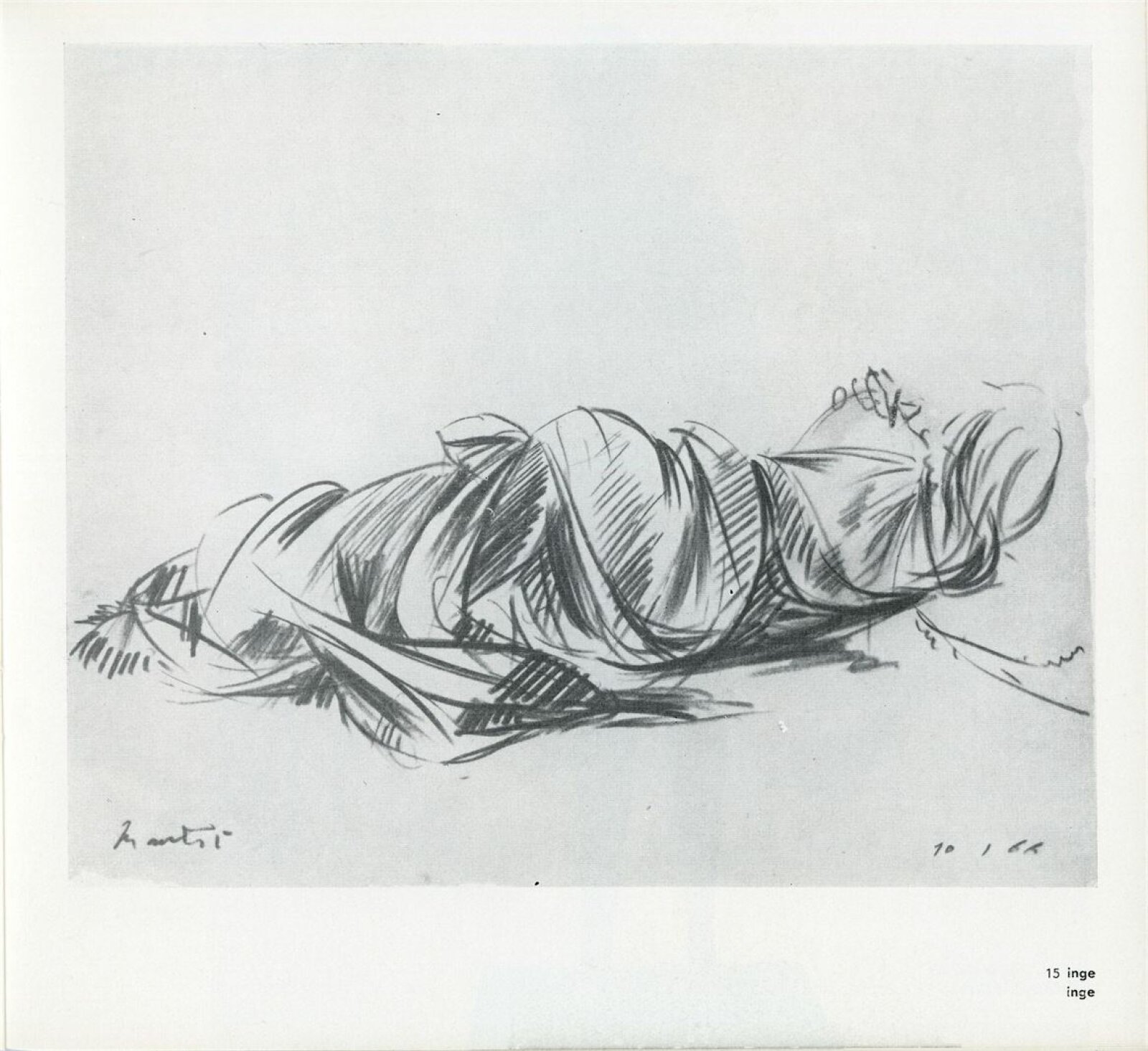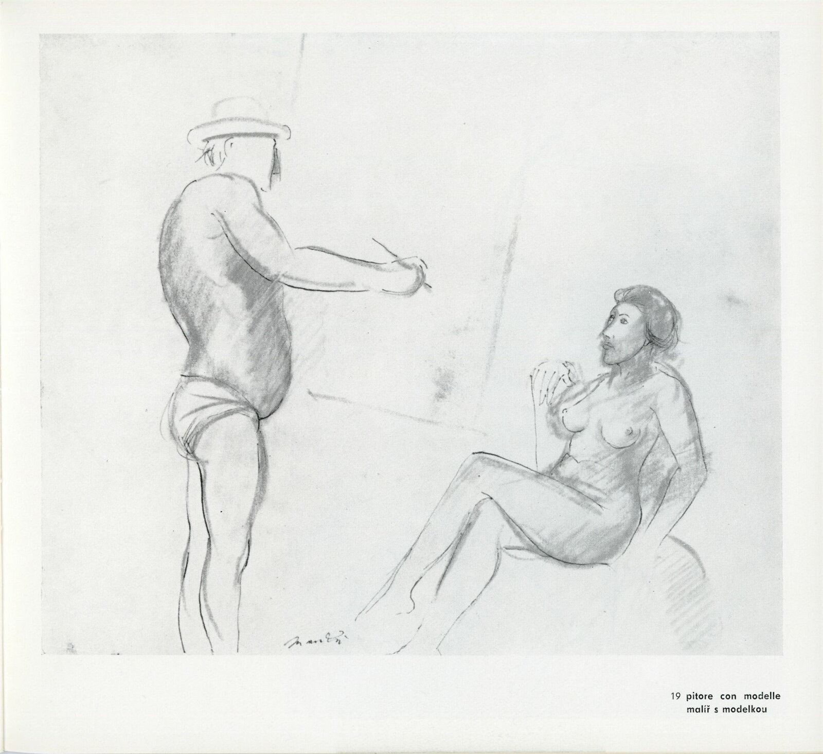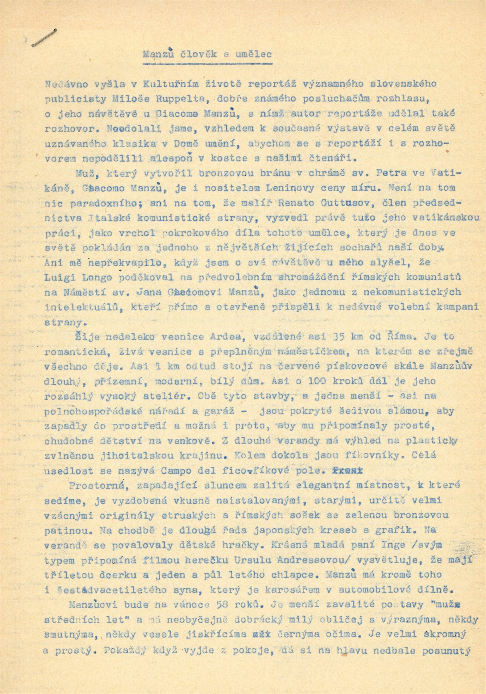 Giacomo Manzú. Plastiky a kresby: Dům umění města Brna, Procházkova síň, 2. 7. – 31. 7. 1966 / Převzatý katalog. Giacomo Manzú: 14. výstava Galerie Vincence Kramáře, 8. 5. – 20. 6. 1966 / Text: Jiří Mašín. – Praha: SČSVU, 1966. – 32 s., obr., portrét, životopis, DU 463. – MG