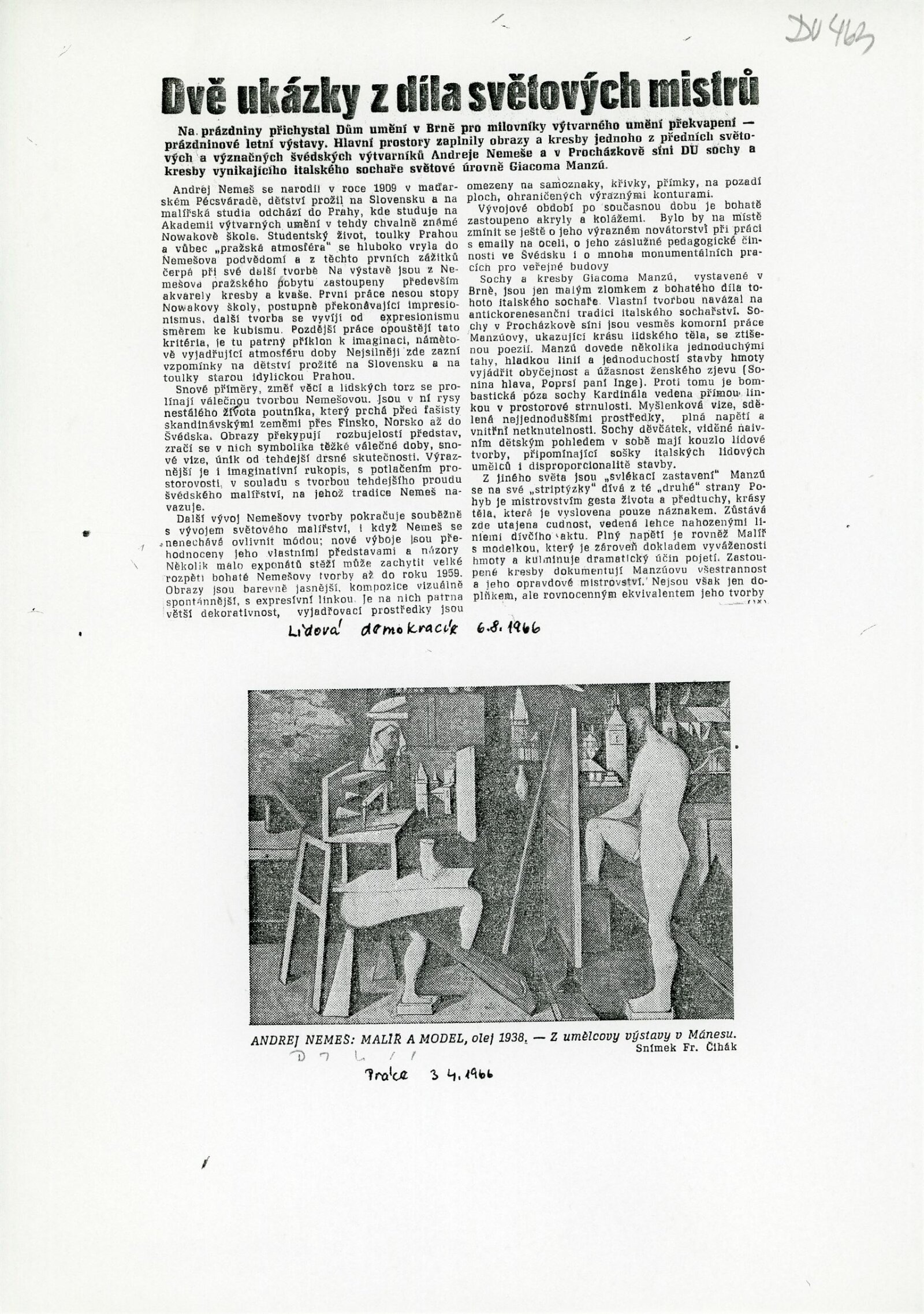 společná pozvánka DU 462 a 463, texty o autorovi, seznam prací, fotografie z vernisáže, korespondence (s SČSVU, SNG o realizaci výstavy, provozní korespondence – souhlas SČSVU s převzetím výstavy), recenze v tisku, pozvánka a katalog z výstavy Praha