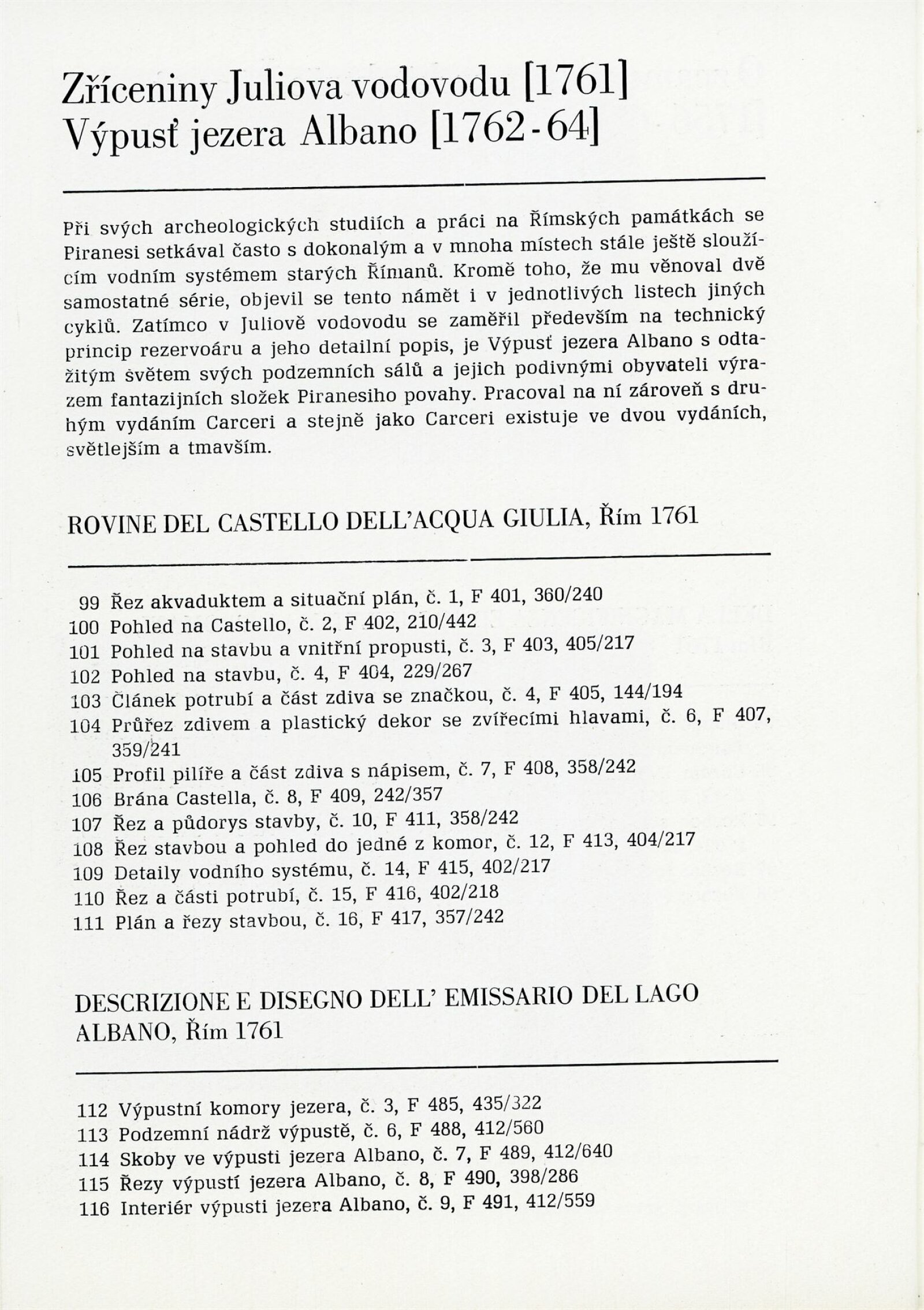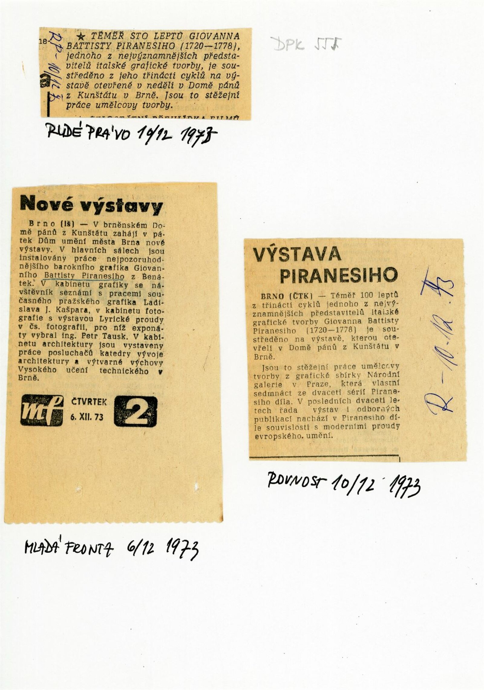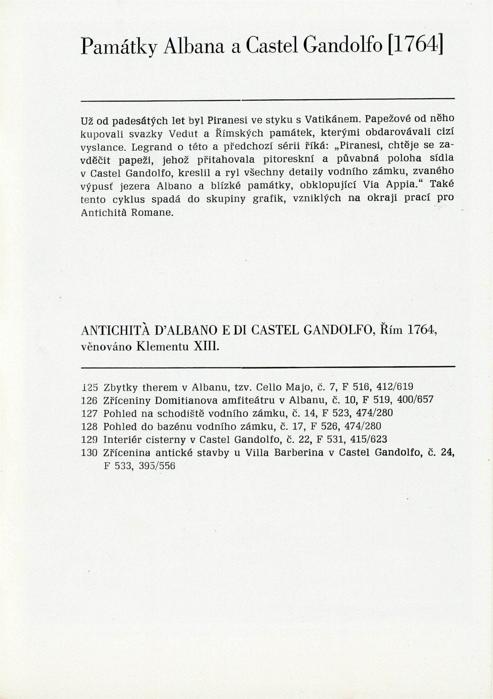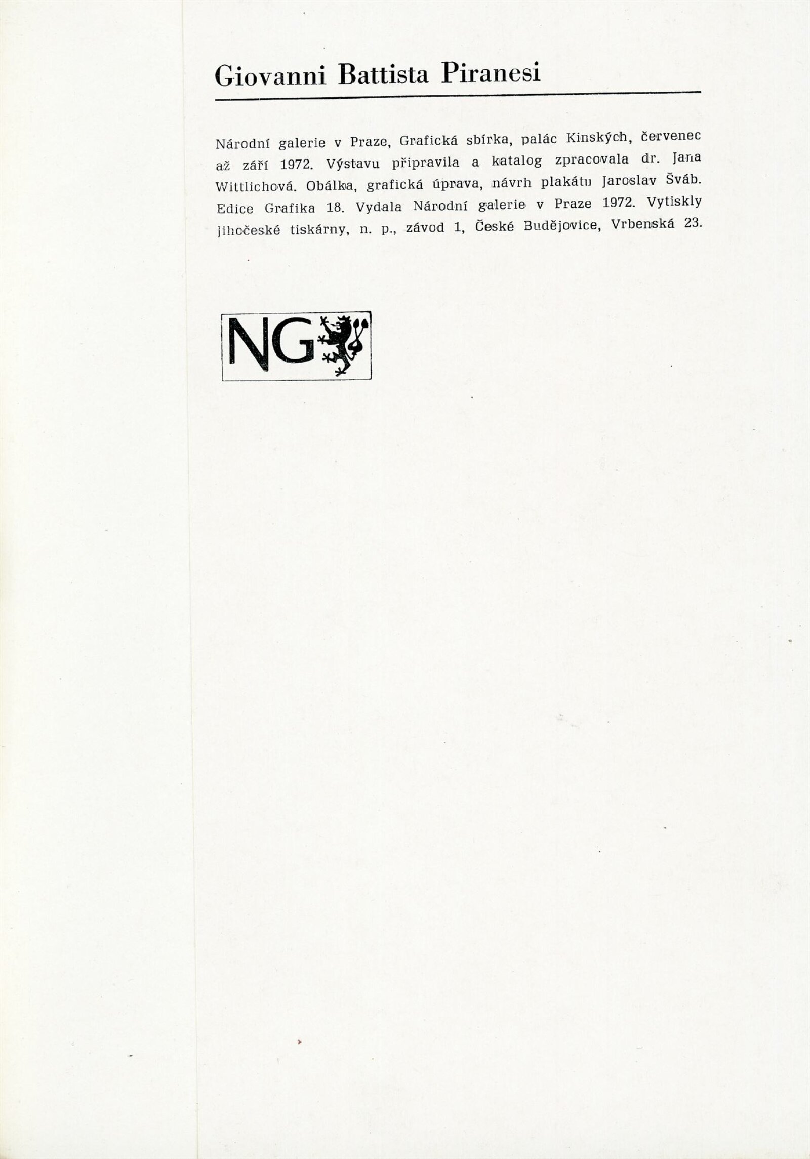 Giovanni Battista Piranesi: Dům umění / Dům pánů z Kunštátu, 9. 12. 1973 – 1. 1. 1974 / Převzatý katalog. Giovanni Battista Piranesi. 1720–1778. Grafické dílo: Grafická sbírka Národní galerie, palác Kinských, červenec–září 1972 / Text Jana Wittlichová. – Praha: Národní galerie, 1972. – 46 s., obr., životní data, bibliografie, DPK 555. – MZK