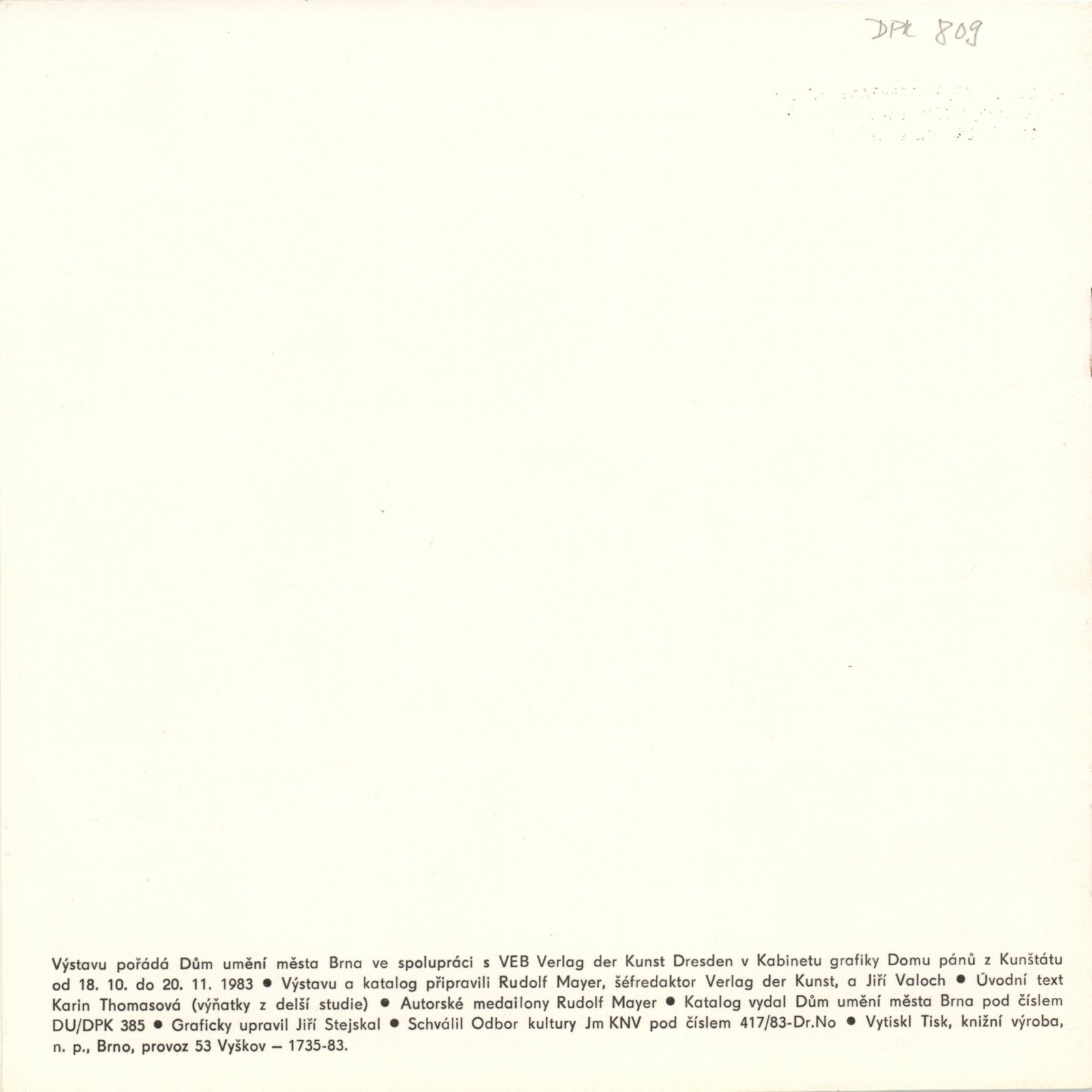 Grafické edice z Verlag der Kunst v Drážďanech. Grafika: Dům umění / Dům pánů z Kunštátu, Kabinet grafiky, 18. 10. – 20. 11. 1983 / Text: Karin Thomasová. – Brno: DUmB, 1983. – 8 s., obr., DPK 809. – MZK; MG