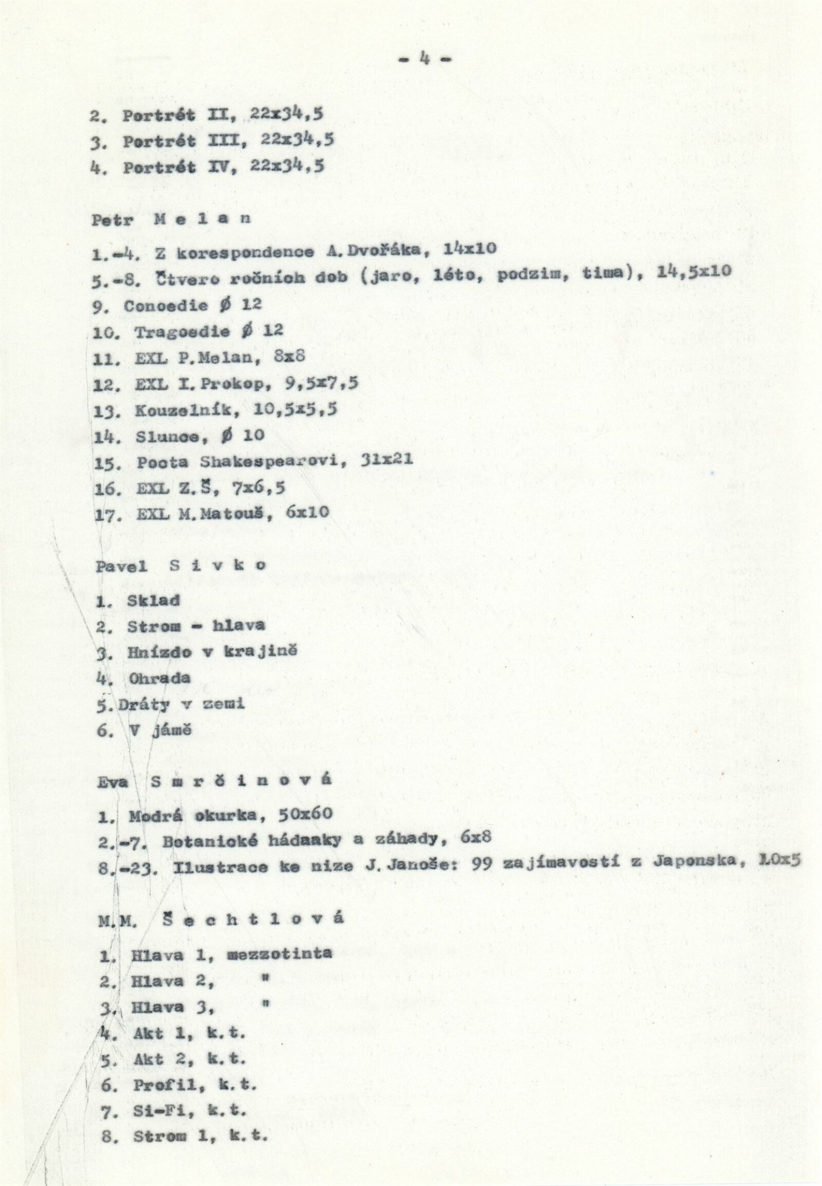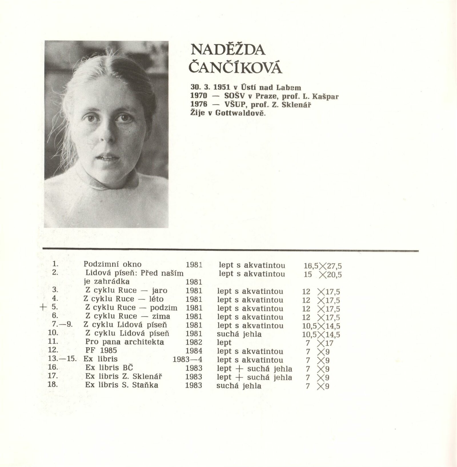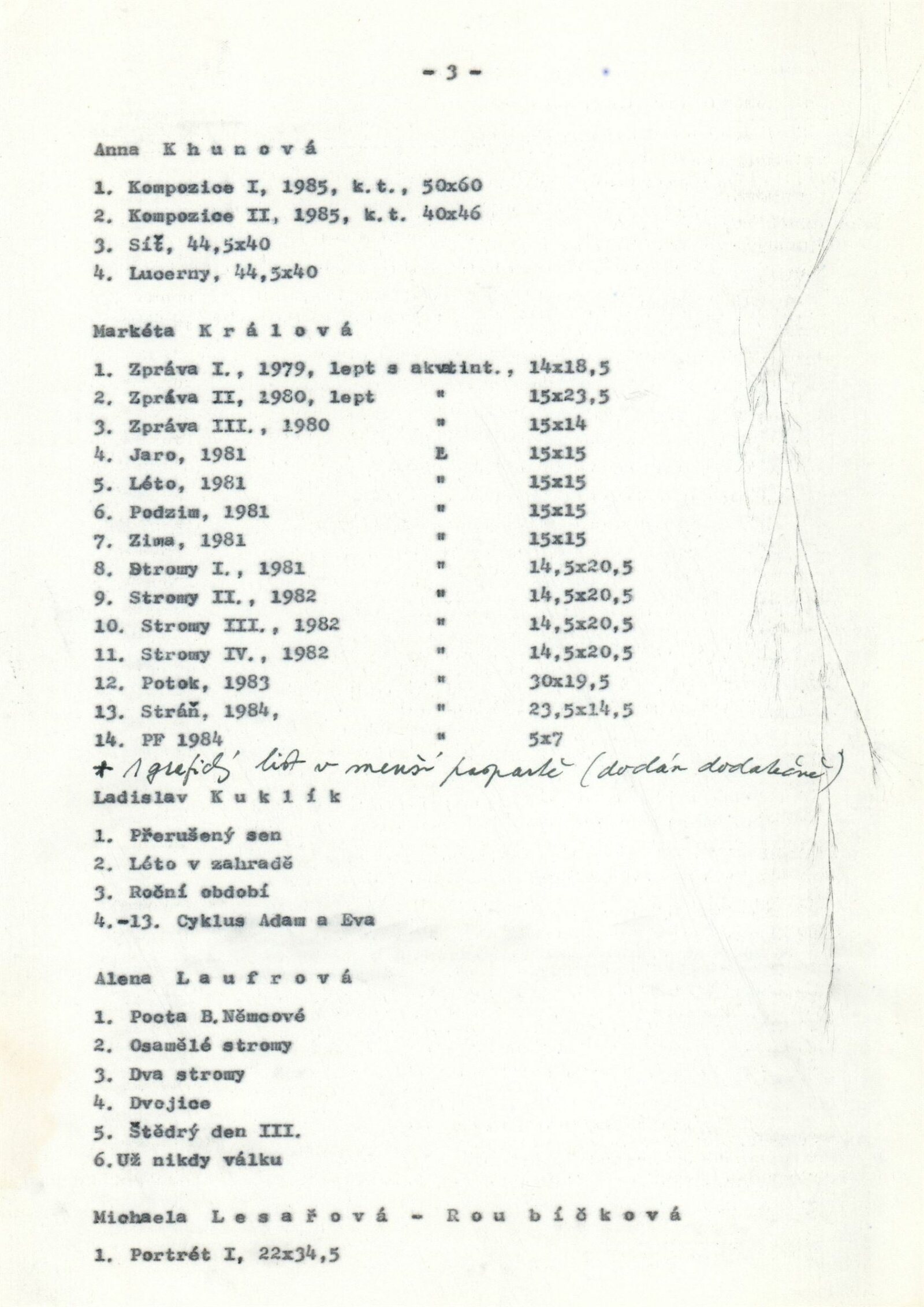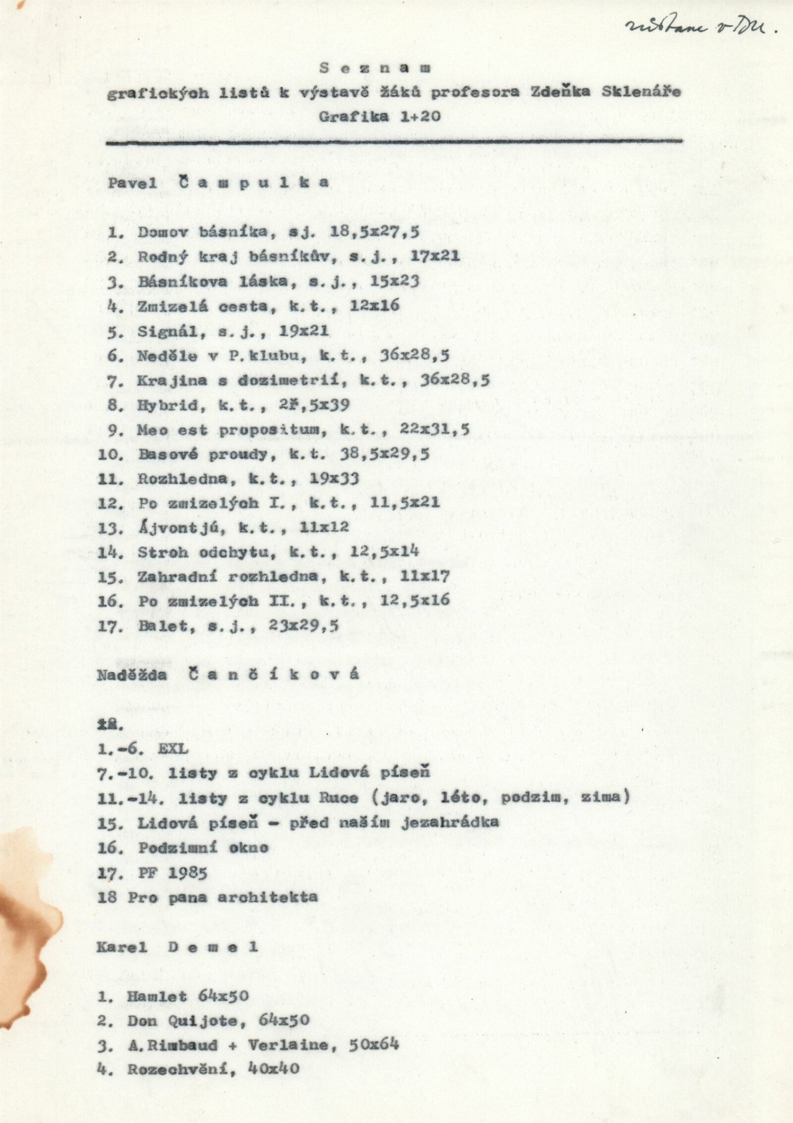 pozvánka, strojopis, katalog, informace o přípravě výstavy, seznam vystavených děl, provozní korespondence, žádost o povolení výstavy, recenze v tisku, pozvánka na výstavu Grafika 1 + 20 (Prostějov, 1985)