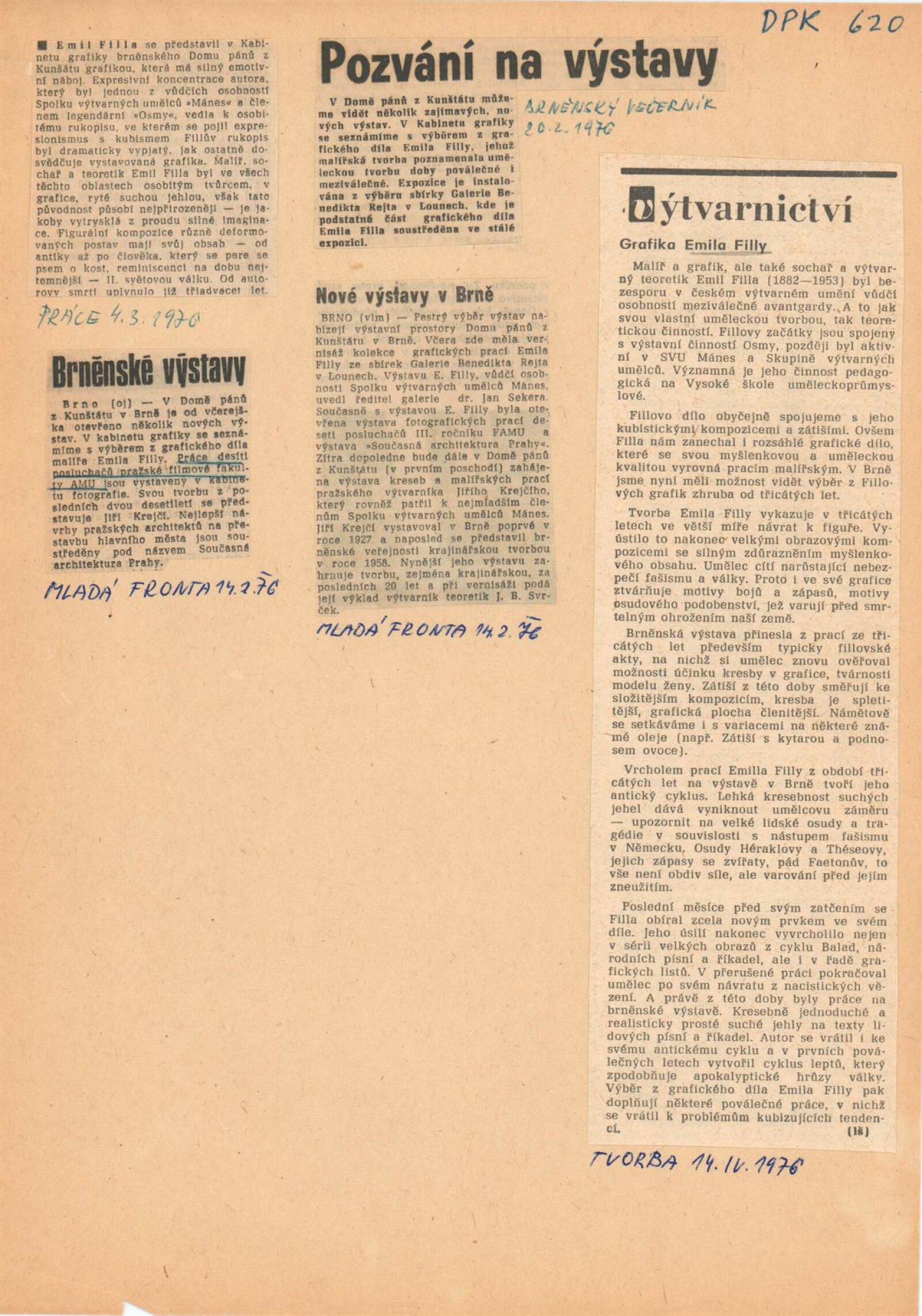 Grafika Emila Filly: Dům umění / Dům pánů z Kunštátu, 155. výstava Kabinetu grafiky, 13. 2. – 14. 3. 1976 / Text: Jan Sekera. – Brno: DUmB, 1976. – 20 s., obr., DPK 620. – MMB
