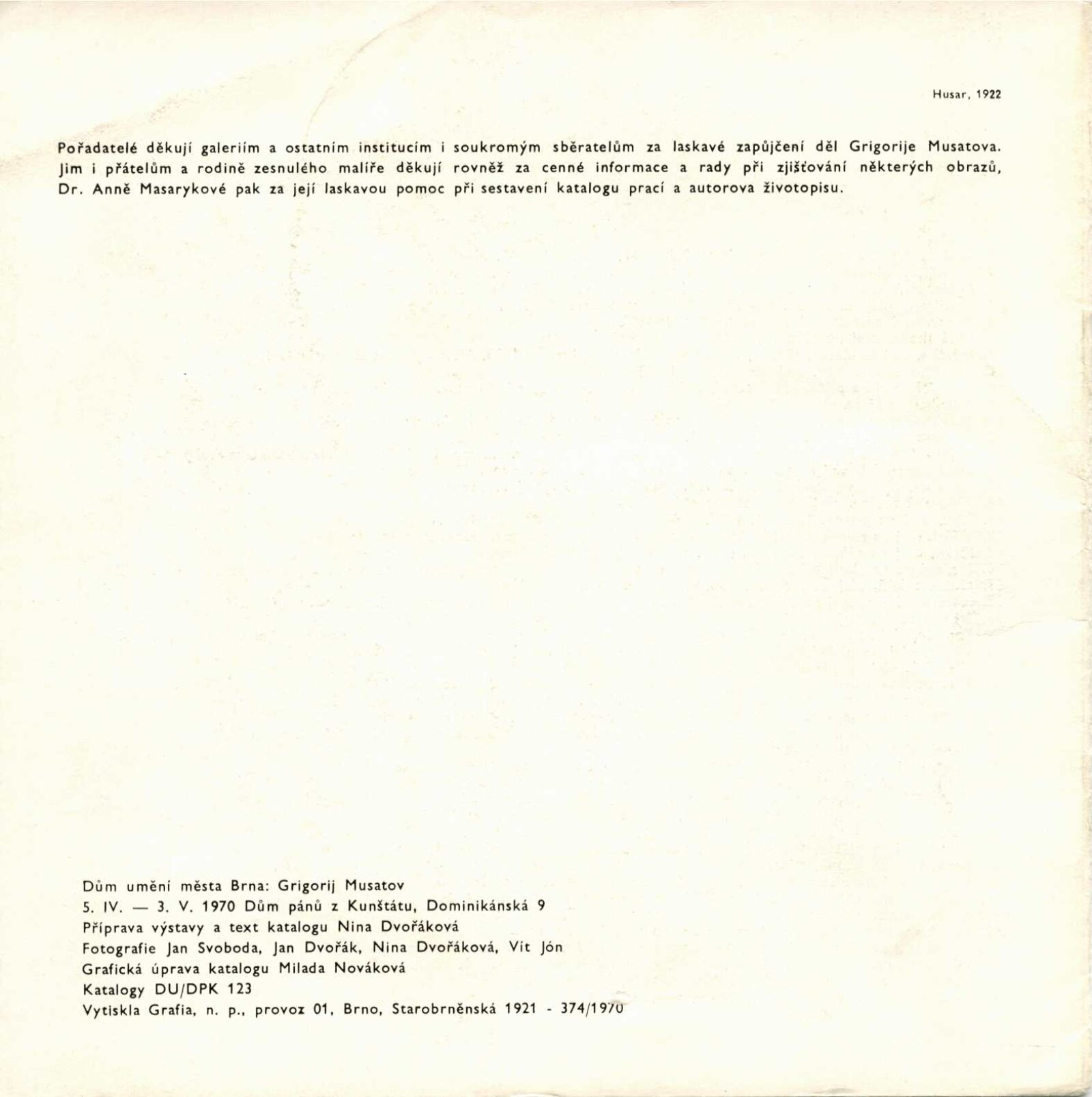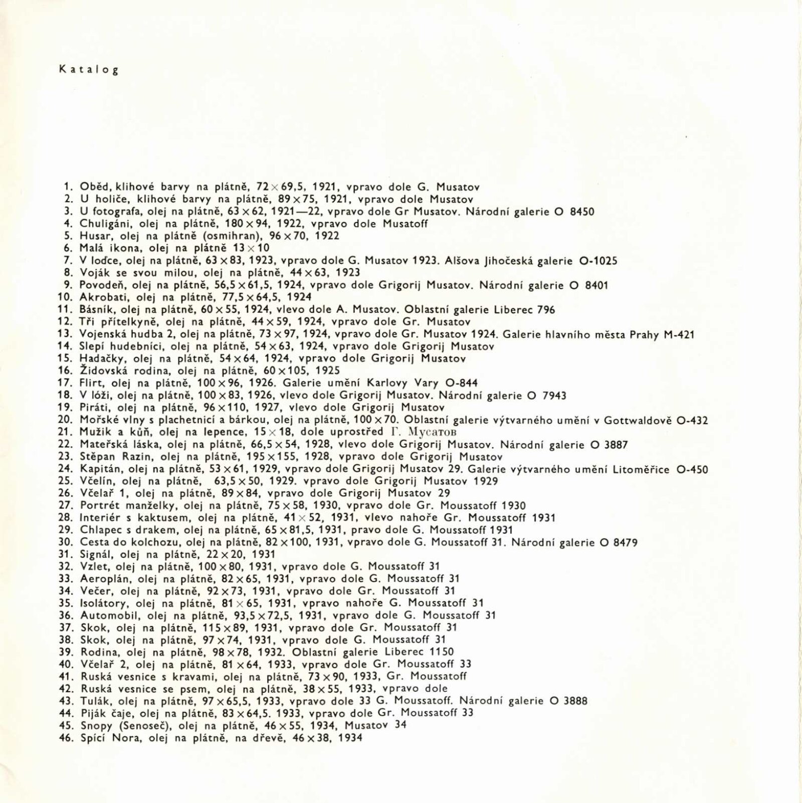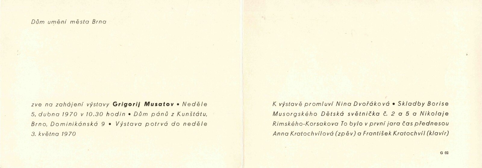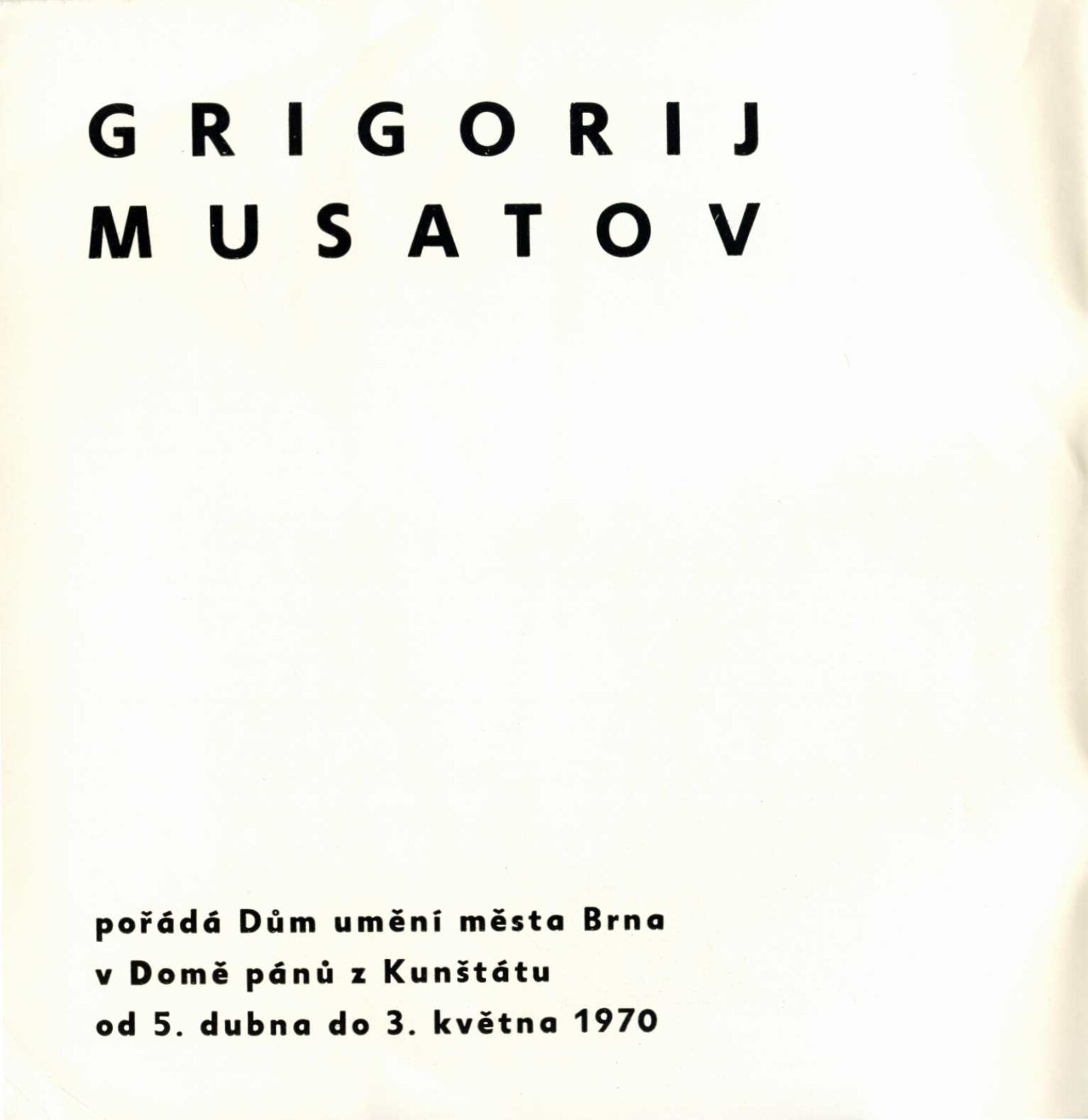 Grigorij Musatov: Dům umění města Brna / Dům pánů z Kunštátu, 5. 4. – 3. 5. 1970 / Text: Nina Dvořáková. – Brno: DUmB, 1970. – 18 s., obr., životní data, DPK 439. – MZK; MG; MMB