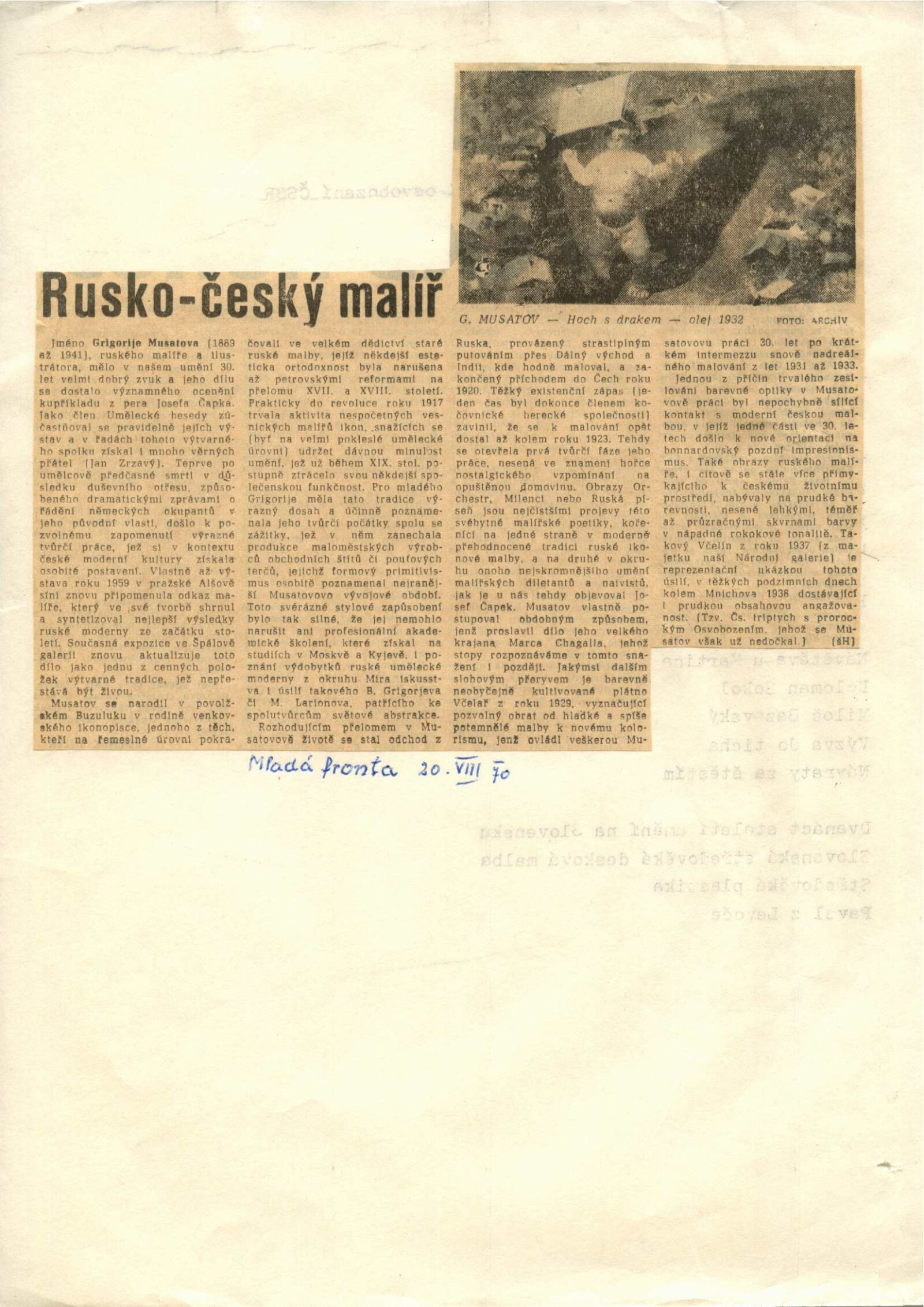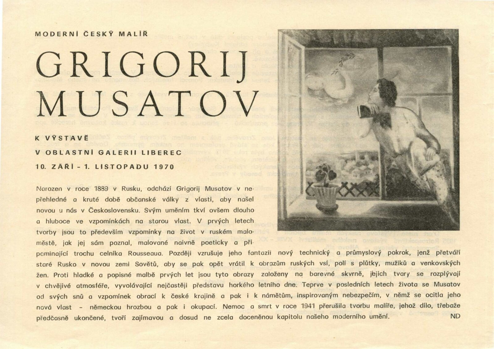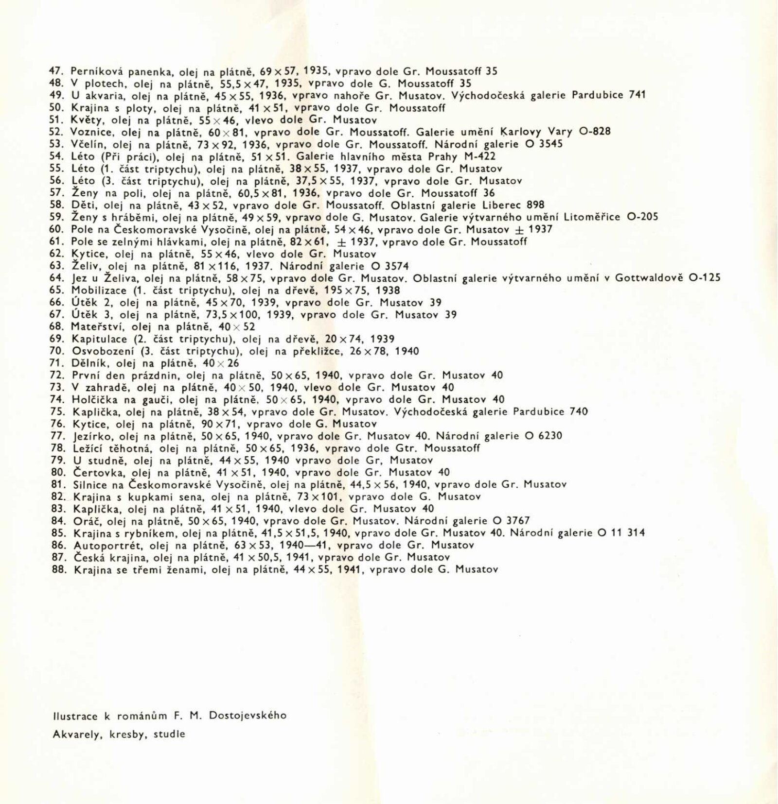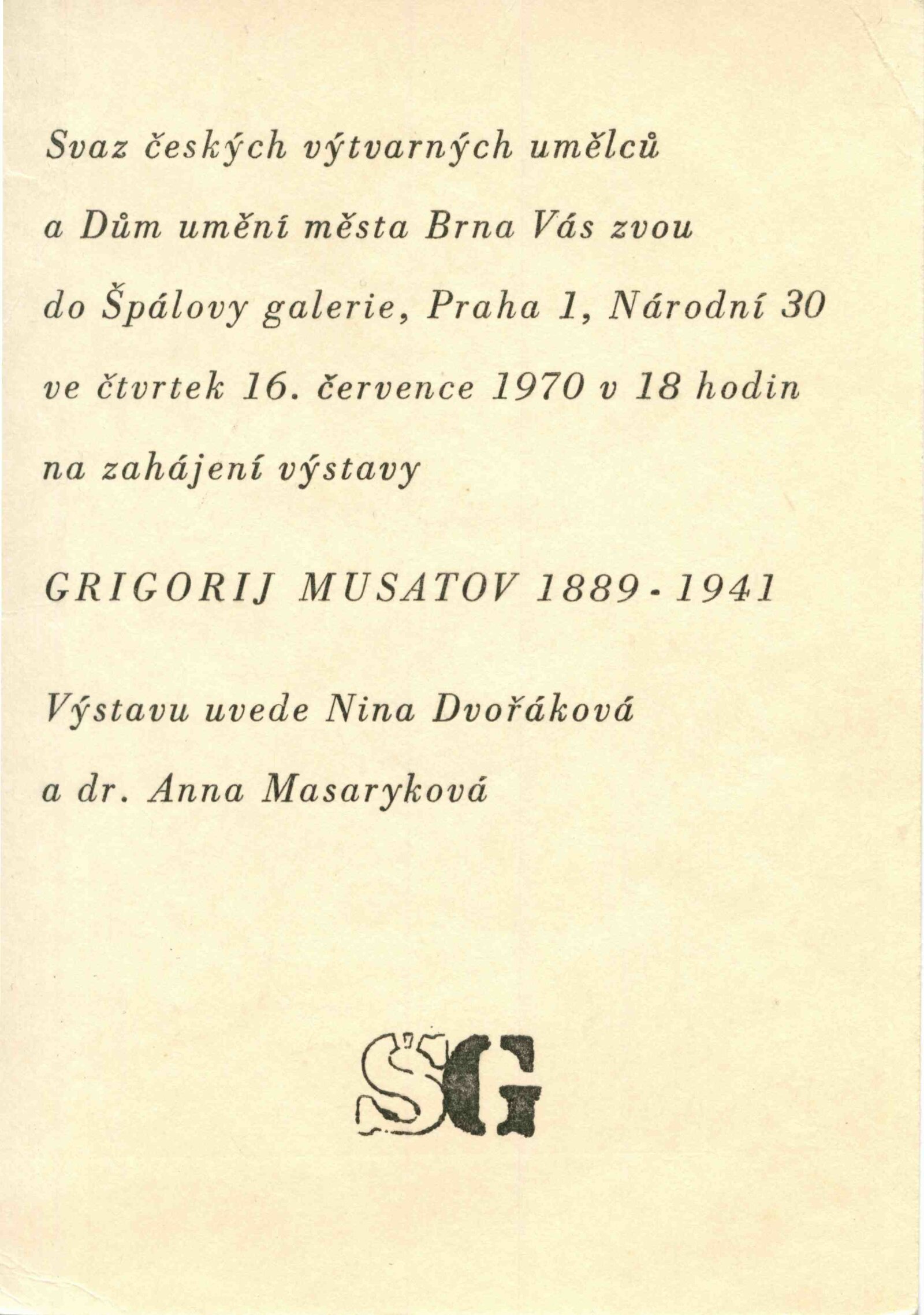 Grigorij Musatov: Dům umění města Brna / Dům pánů z Kunštátu, 5. 4. – 3. 5. 1970 / Text: Nina Dvořáková. – Brno: DUmB, 1970. – 18 s., obr., životní data, DPK 439. – MZK; MG; MMB