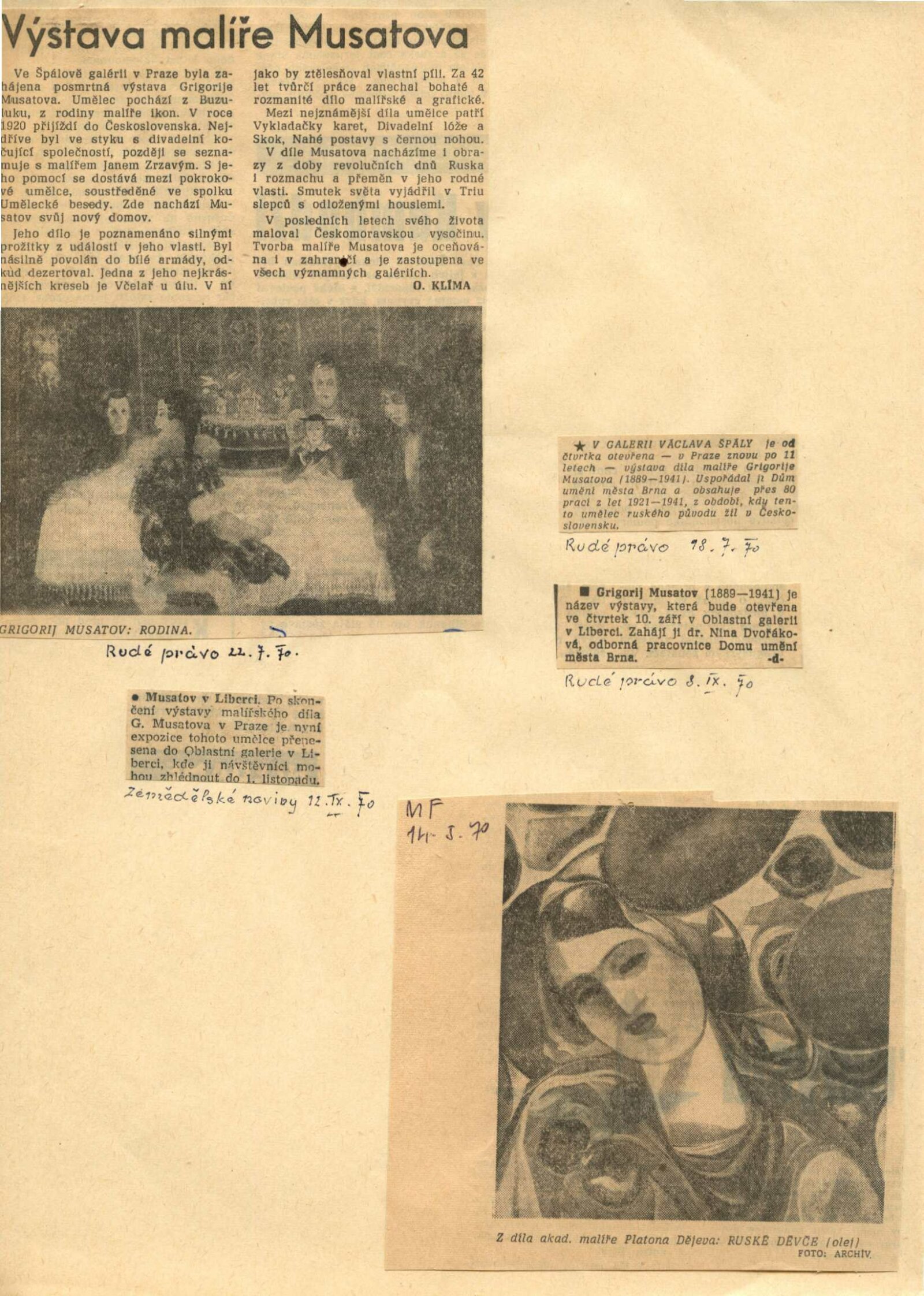pozvánka (DU, Oblastní galerie v Liberci, Špálova galerie v Praze), leták k výstavě (DU, Liberec), katalog, fotografie instalace, fotografie děl (Jan Svoboda), plakát na výstavu v Liberci, (plakát na dubnové výstavy ve složce DU 545), biografie autora, text Ivana Smetany „Vzpomínka na přítele Grigorije Musatova“, soupis obrazů Grigorije Musatova, adresy majitelů, seznam prací pro výstavu v DU, seznam poškozených děl, seznamy děl s adresami majitelů, parte Věry Musatové, soupis děl pro katalog, reversy a žádosti o výpůjčku, provozní korespondence (instituce), strojopis letáku – Musatov + 25 let DUMB, sešit poznámek Niny Dvořákové, recenze v tisku, informační a kulturní kalendář města Liberec (říjen 1970)