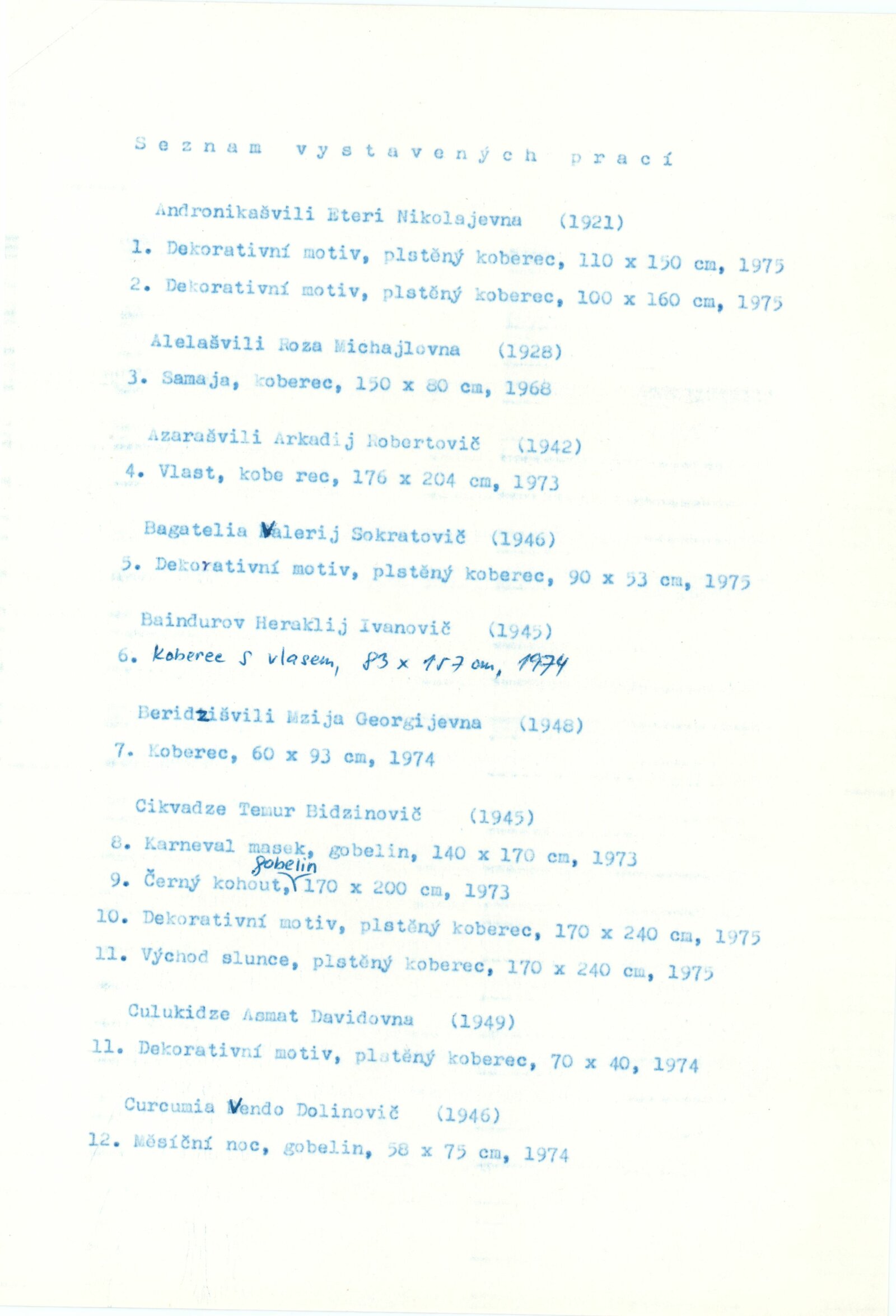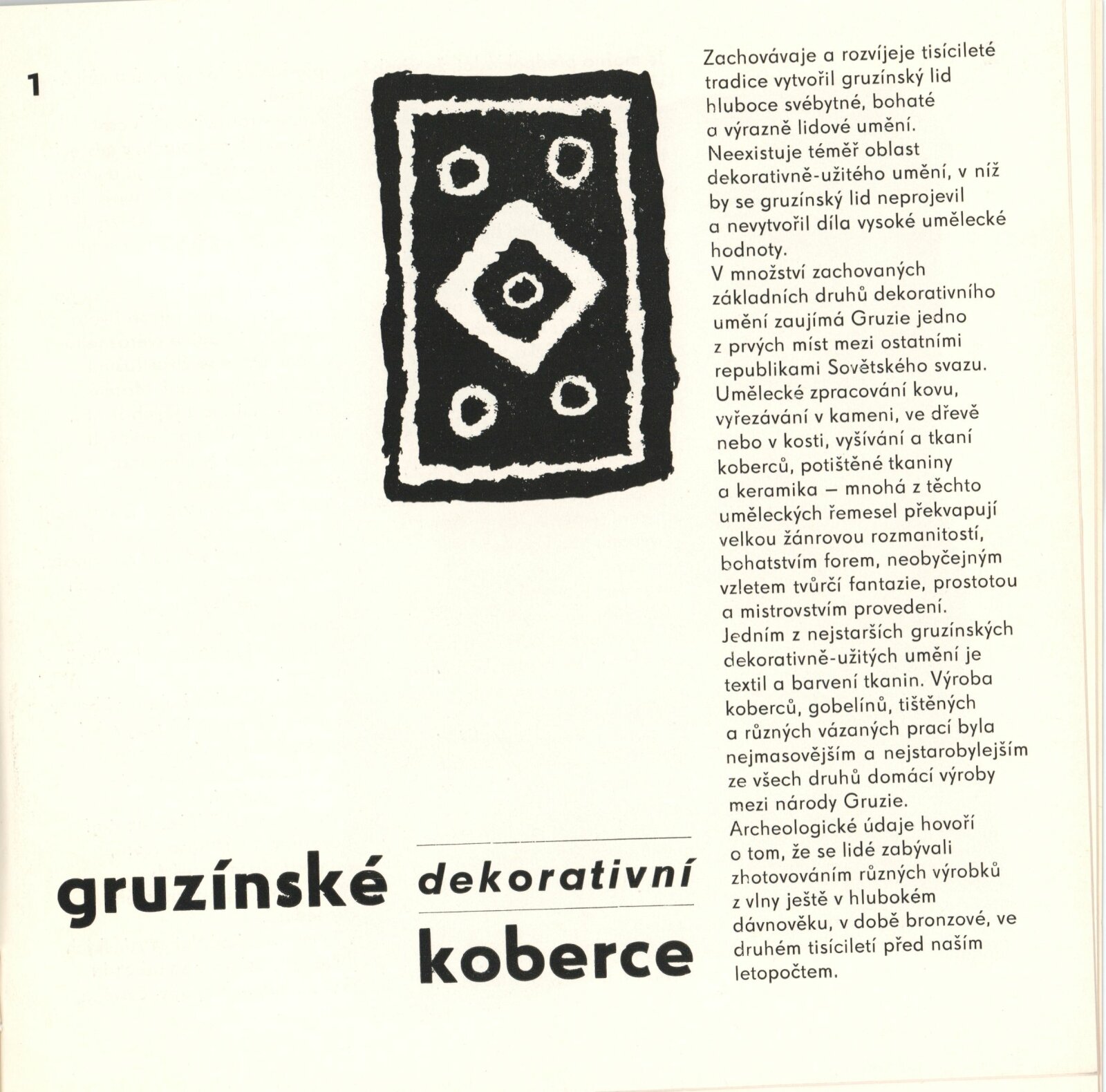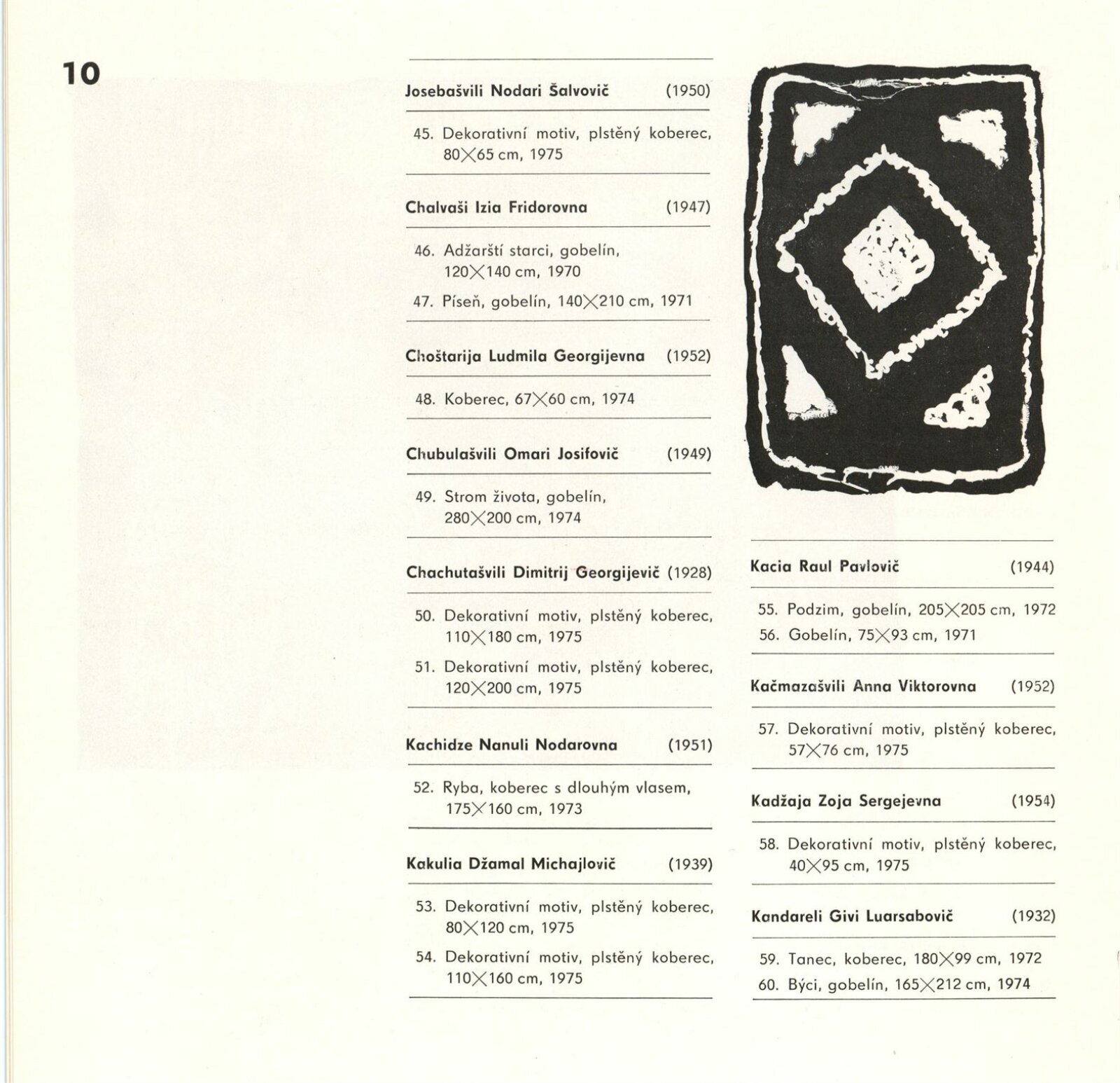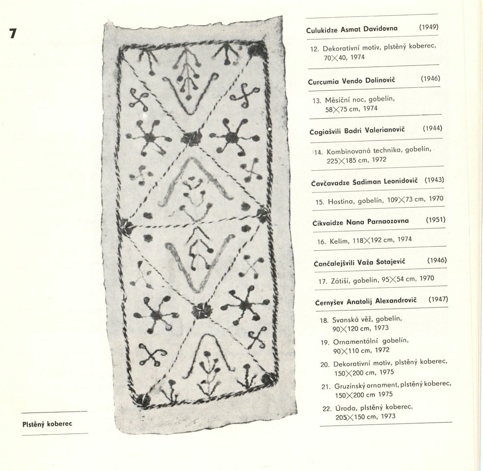 Gruzínské dekorativní koberce: Dům umění města Brna, 30. 7. – 29. 8. 1976 / Text: Tbiliská akademie výtvarných umění. – Brno: DUmB, 1976. – 16 s., obr., DU 643. – MZK; MG
