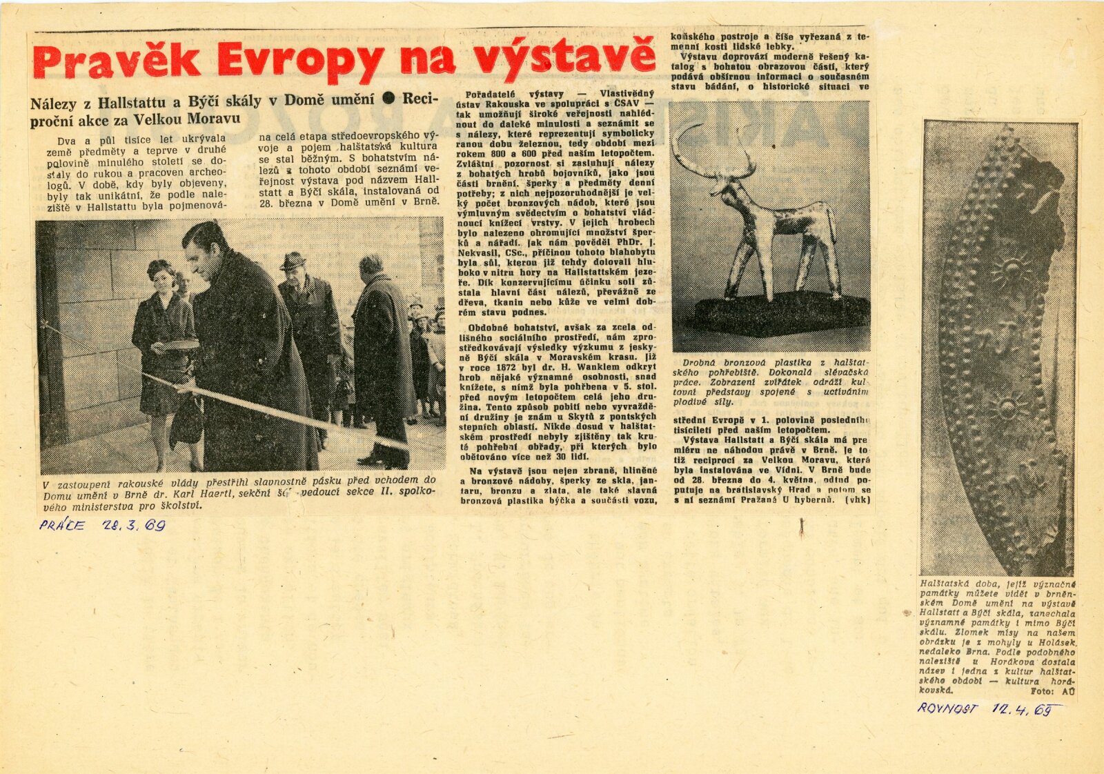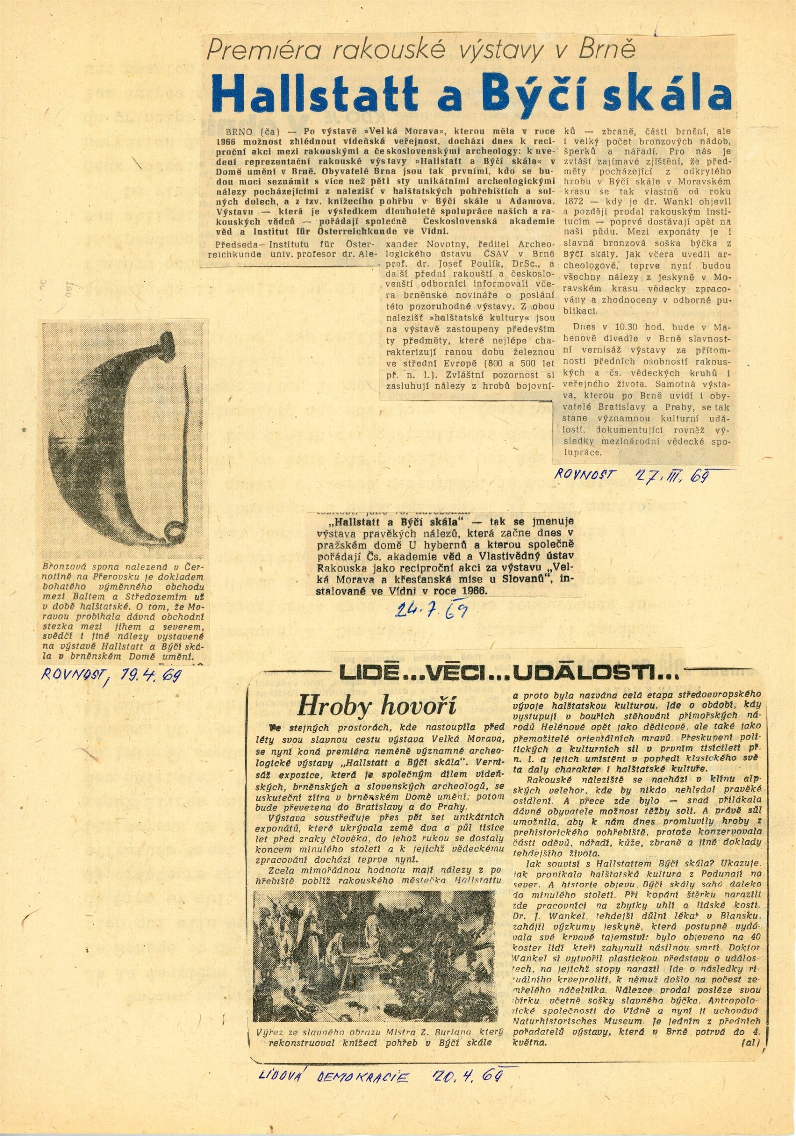 pozvánka (ČJ, NJ), katalog, leták, strojopis pozvánky na přednášku (prof. dr. Karel Kromer), text k výstavě, texty k obrázkům pro tiskovou konferenci, fotografie vystavených exponátů, korespondence (dopis Adolfu Kroupovi z Archeologického ústavu ČAV s žádostí o uspořádání výstavy), recenze v tisku, pozvánka na výstavu (Bratislava, Vídeň), turistické brožury o Rakousku