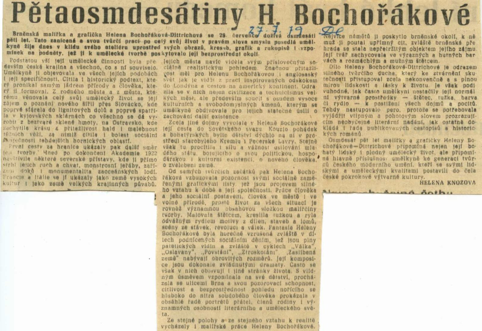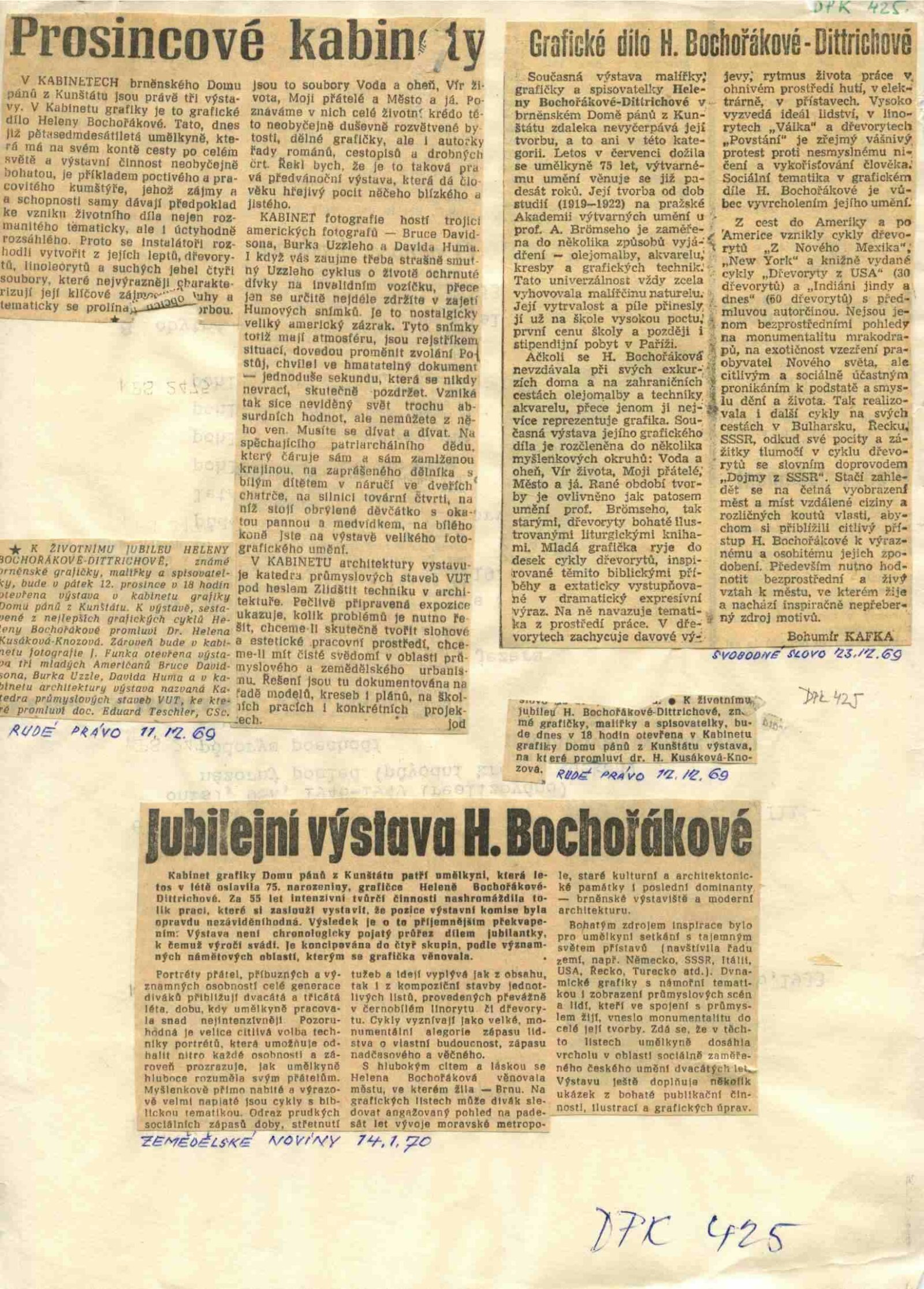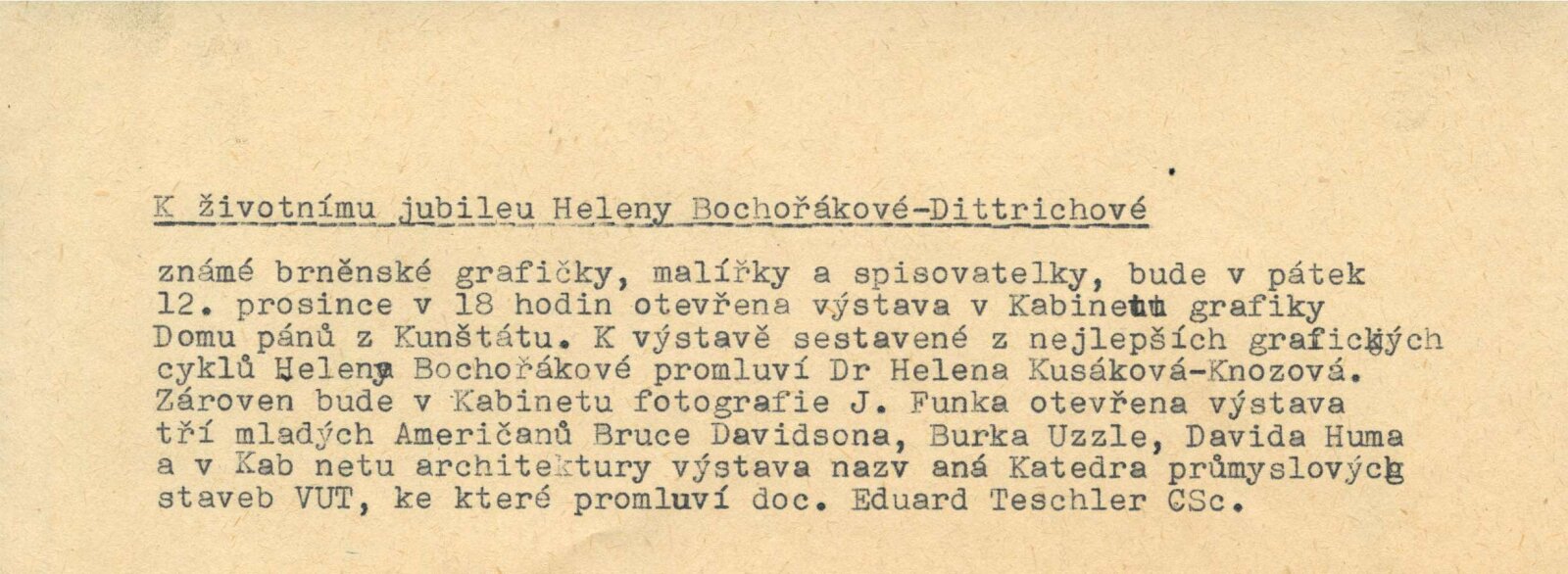 Helena Bochořáková: Dům umění města Brna / Dům pánů z Kunštátu, Kabinet grafiky, 12. 12. 1969 – 11. 1. 1970 / Text: Helena Kusáková-Knozová. – Brno: DUmB, 1969. – 10 s., obr., životní data, DPK 425. – MZK; MG