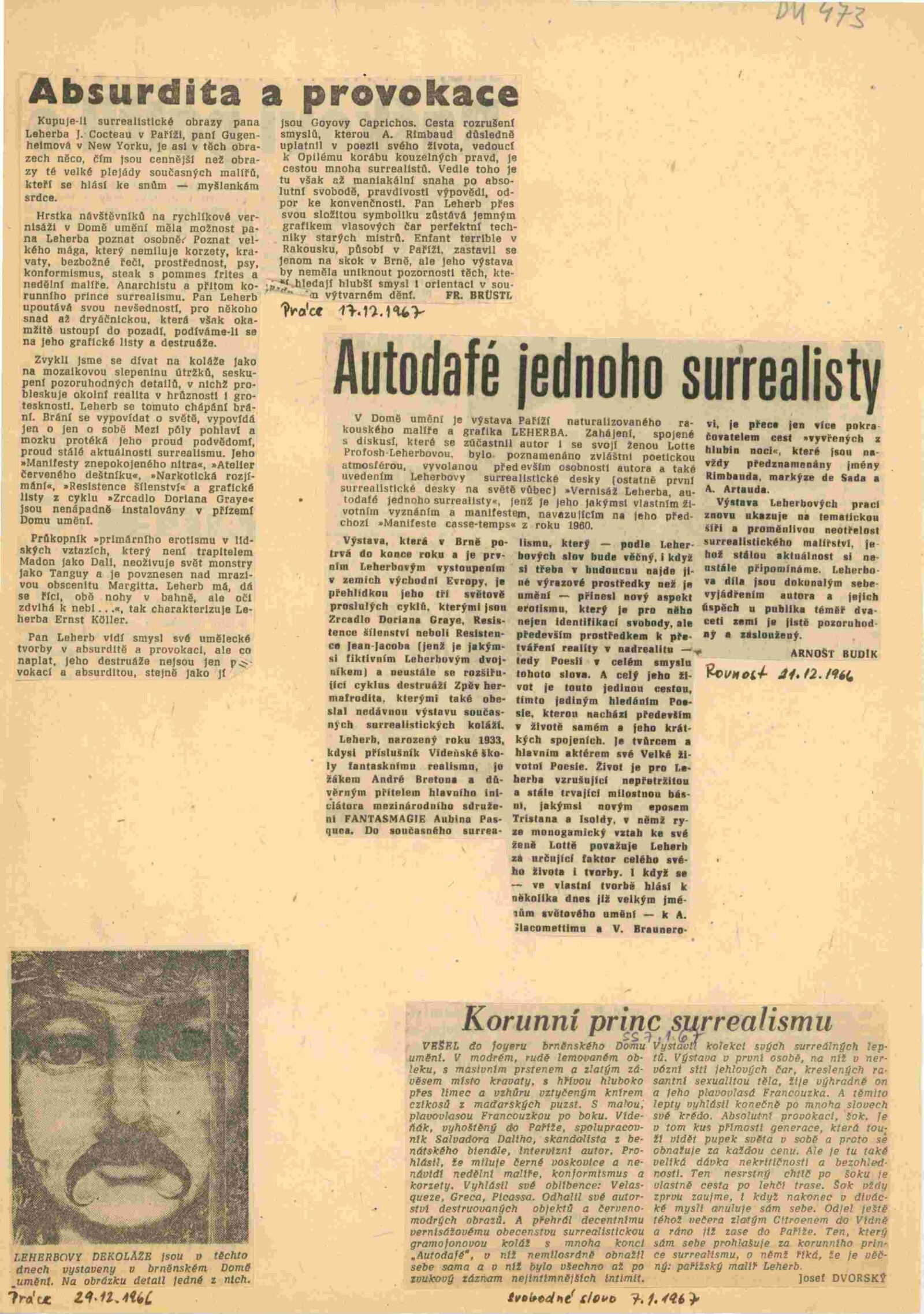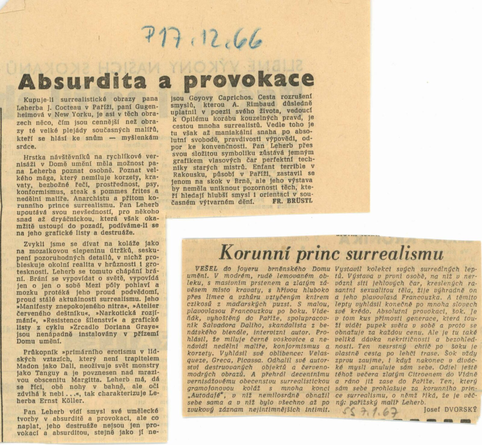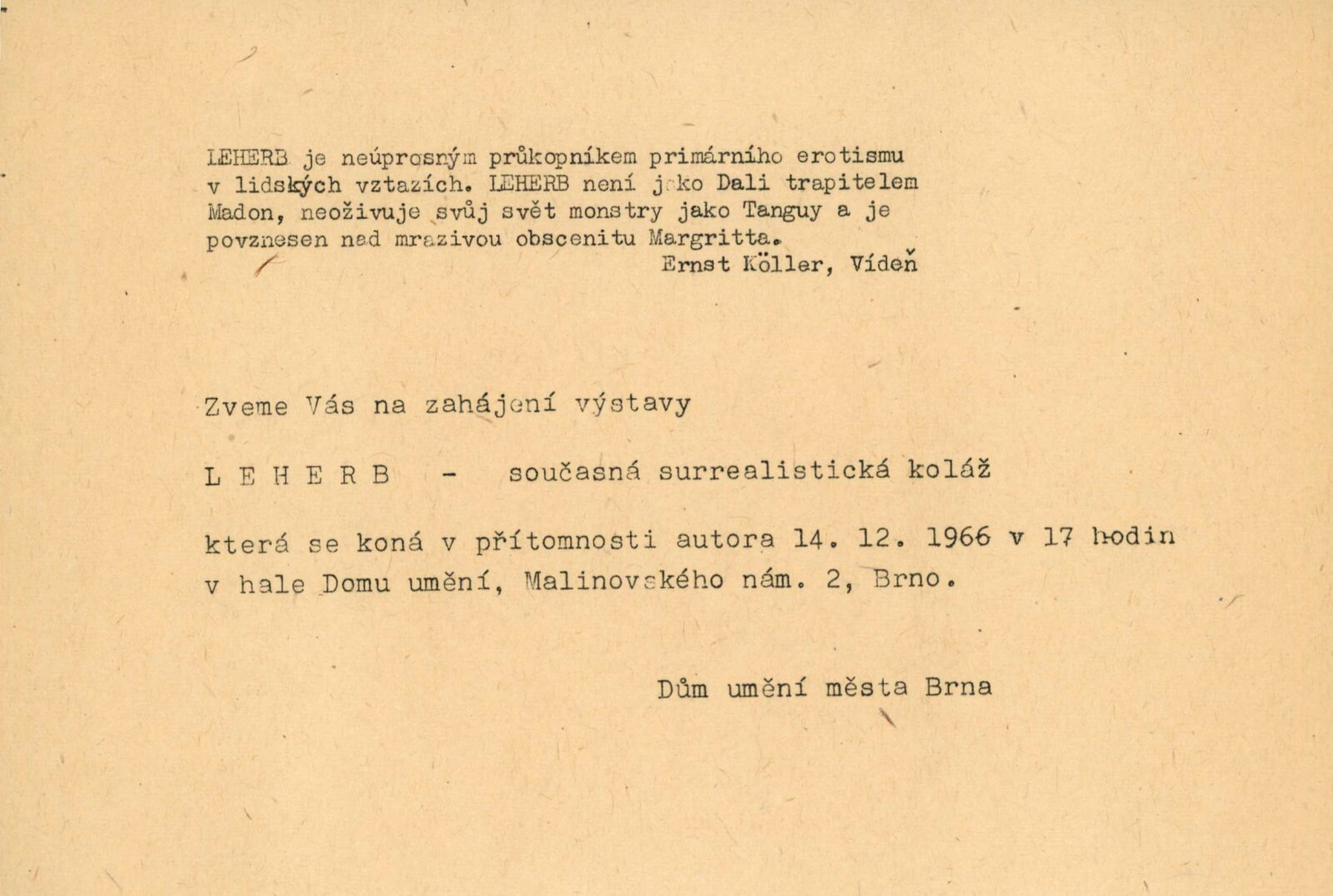 Helmut Leherb: Dům umění města Brna, hala, 14. 12. 1966 – 7. 1. 1967 / Text: Arnošt Budík. – Brno: DUmB, 1966. – skládačka, 6 s., obr., DU 473. – MZK; MG; MMB