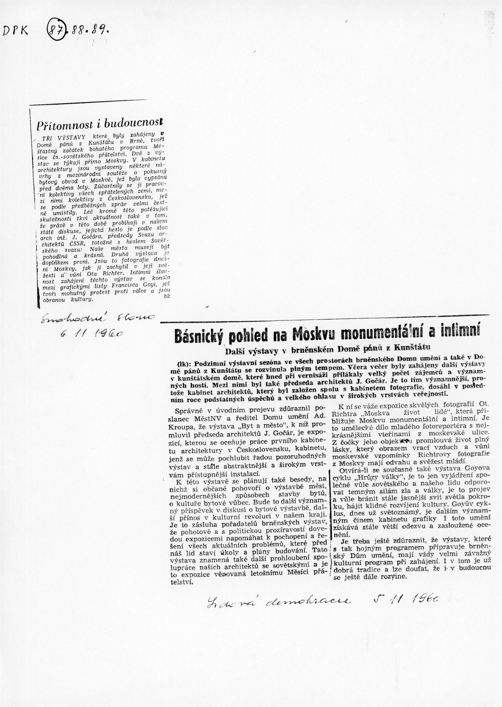 společná pozvánka DPK 87 a 89, provozní korespondence, recenze v tisku
