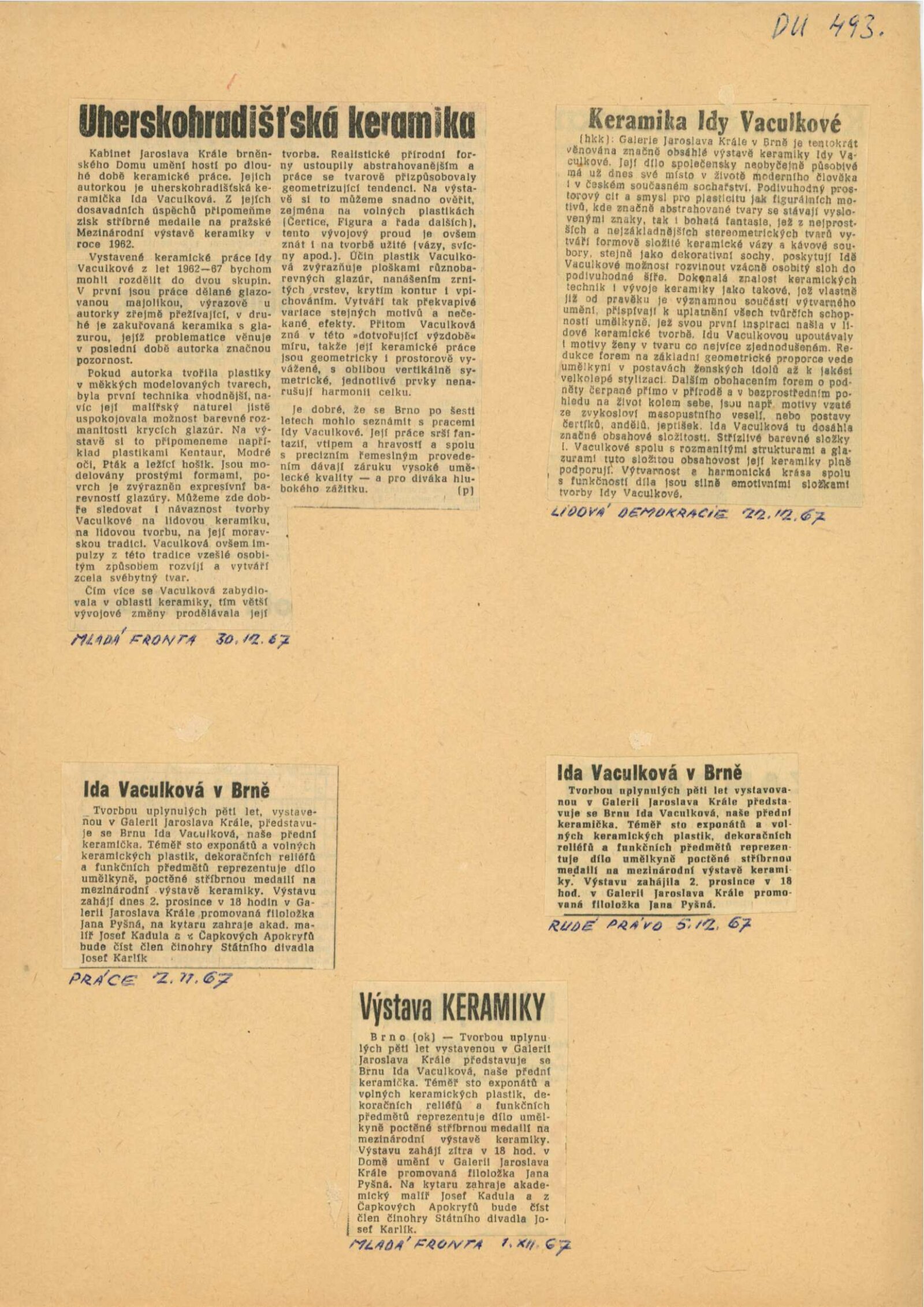Ida Vaculková. Keramika: Dům umění, 15. výstava Galerie Jaroslava Krále, 2. 12. 1967 – 1. 1. 1968 / Text: Jana Pyšná. – Brno: ČFVU, 1967. – 10 s., obr., portrét, životopis, výstavy, DU 493. – MG