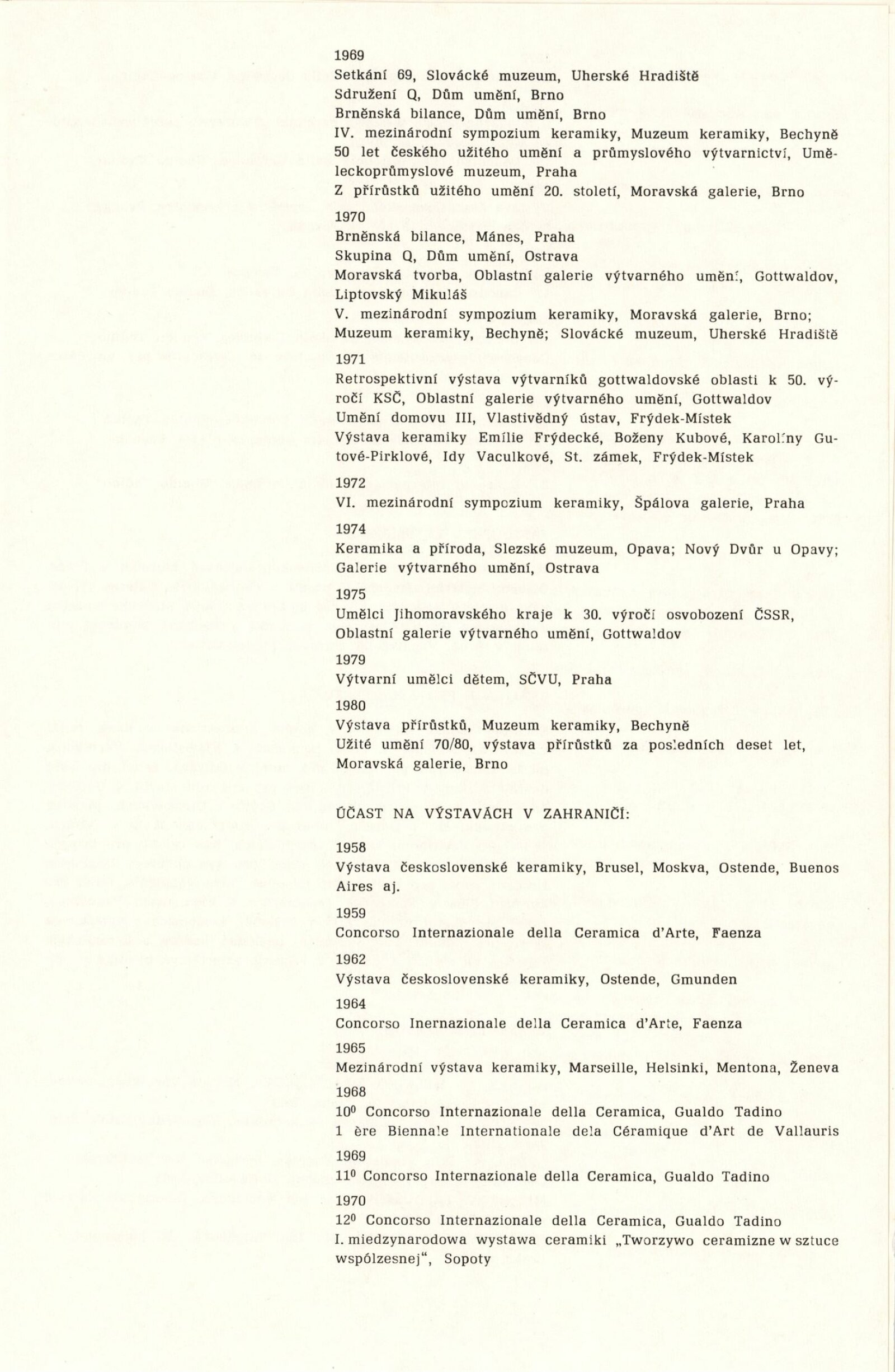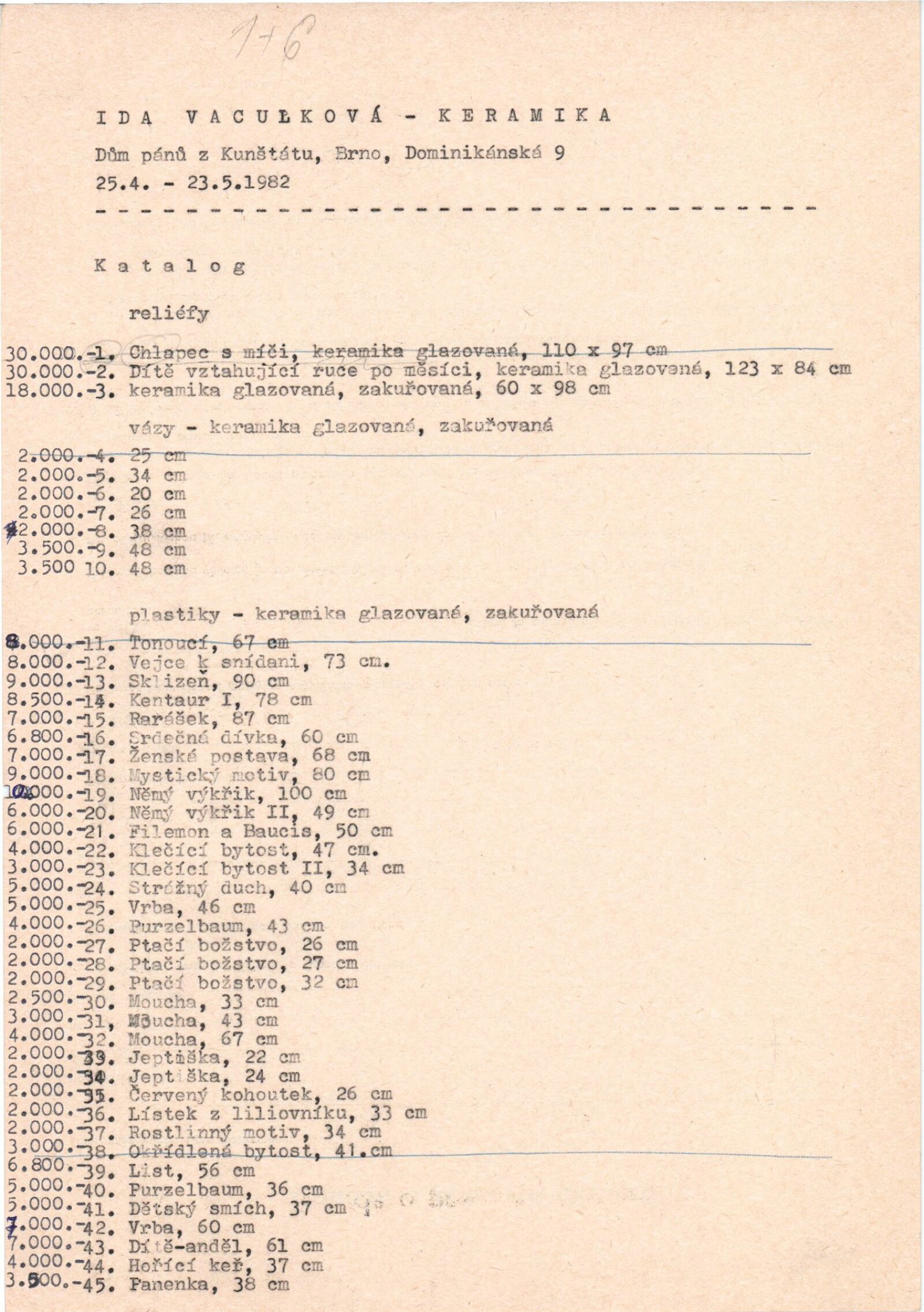pozvánka, katalog, seznam prací v DPK, strojopis textu pozvánky, fotografie z instalace výstavy, soupis děl s pojistnými cenami + seznam nevystavených děl, provozní korespondence (s gal. v Hodoníně a NMnM, s Idou Vaculkovou, zápis o poškození děl při převozu do Brna, gymn. Uher. Hrad.), dohoda o spolupráci při realizaci výstavy (mezi DU v Brně, GVU v Hodoníně a HG v NMnM), potvrzení o předání děl z jiných inst., reversy, zápis o zjištěné pojist. události, rukopis žádosti o výstavu, žádost o povolení výstavy, recenze v tisku