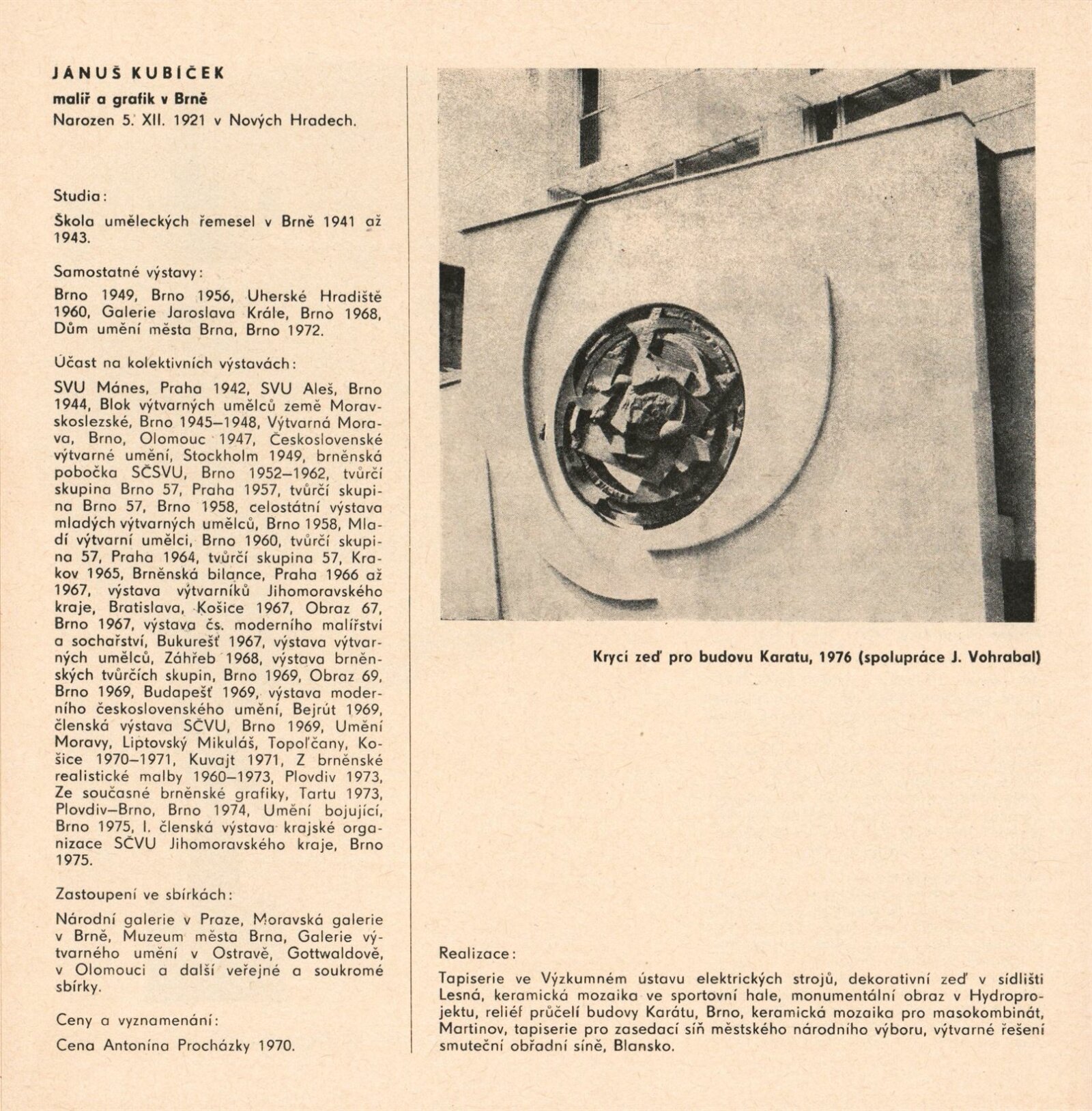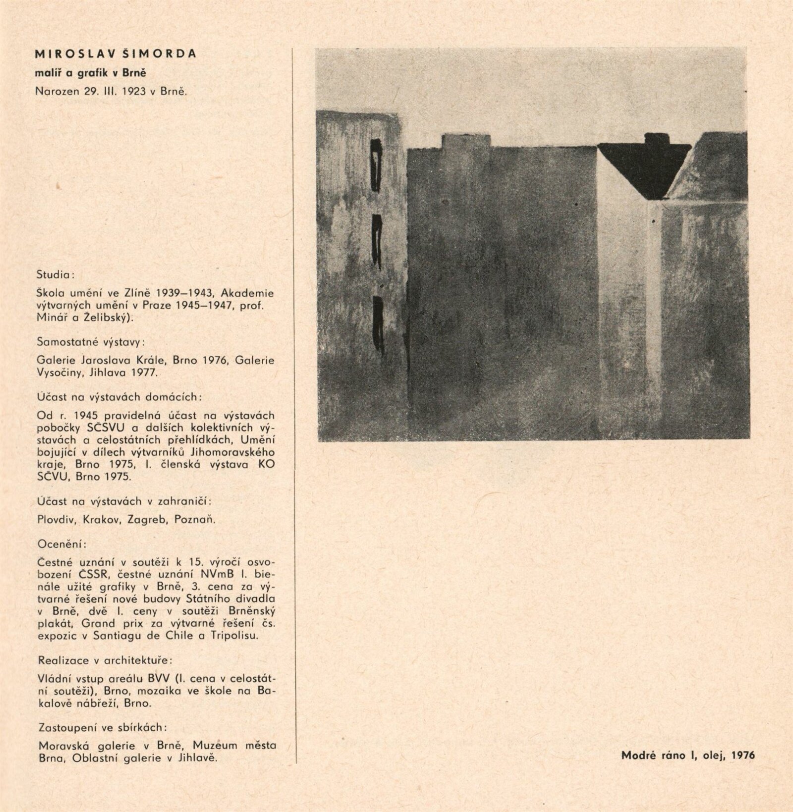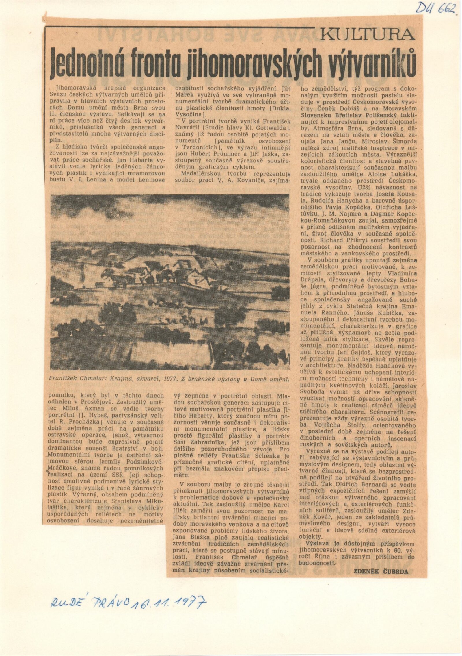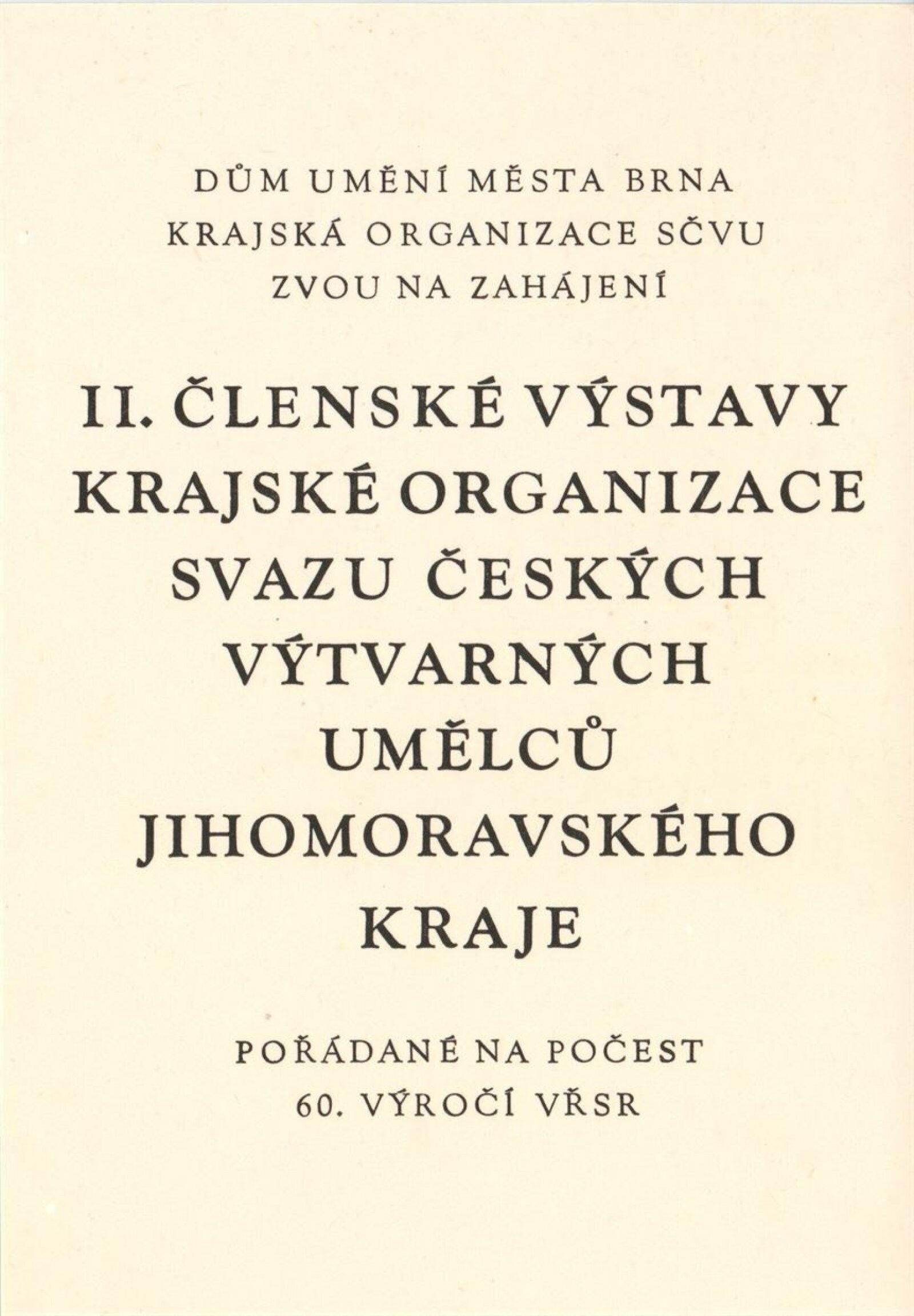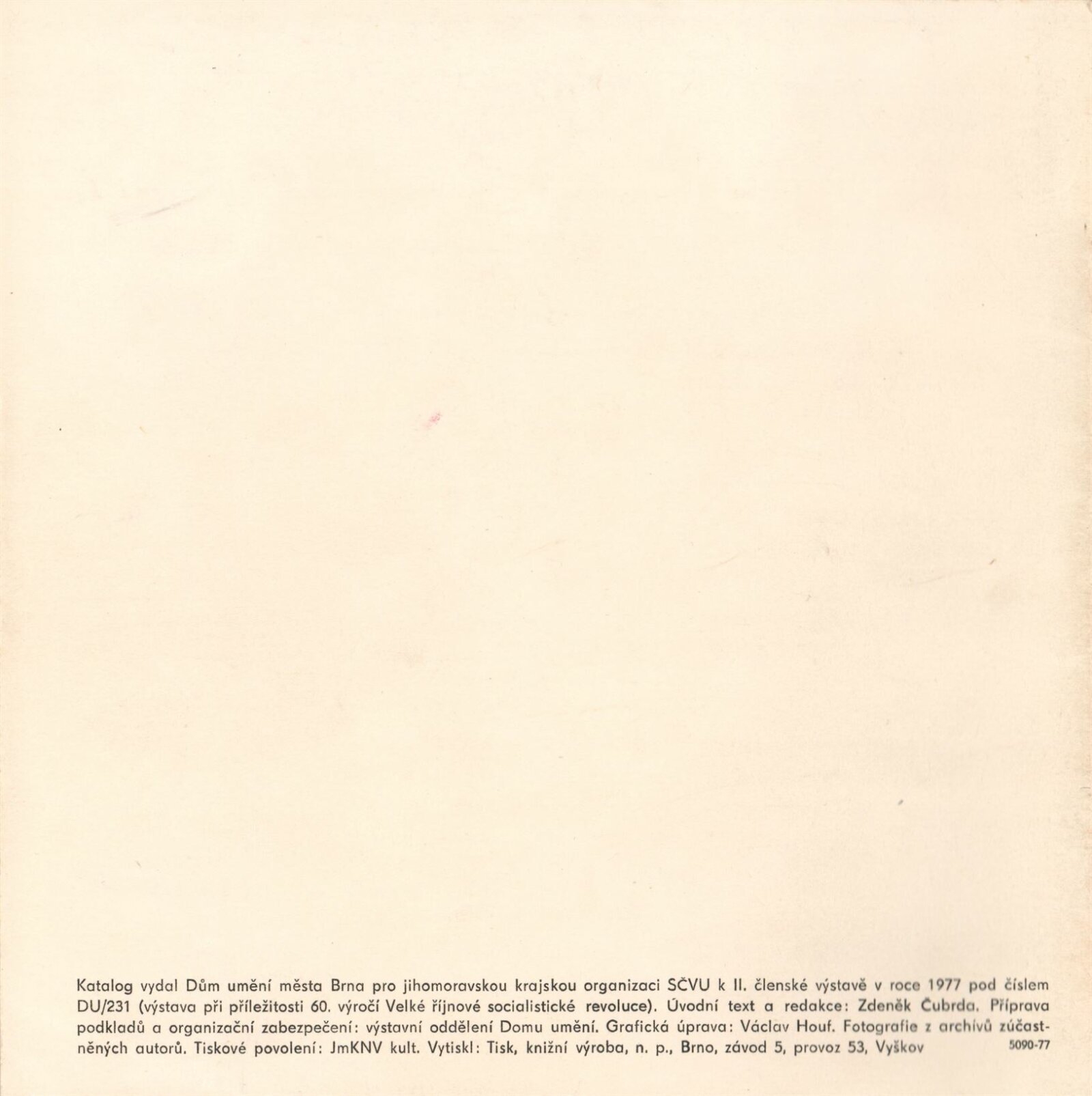 II. členská výstava krajské organizace Svazu českých výtvarných umělců Jihomoravského kraje: Dům umění města Brna, 14. 10. – 20. 11. 1977 / Text: Zdeněk Čubrda. – Brno: DUmB, 1977. – 44 s., obr., seznam prací 4 s., životní data vystavujících, DU 662