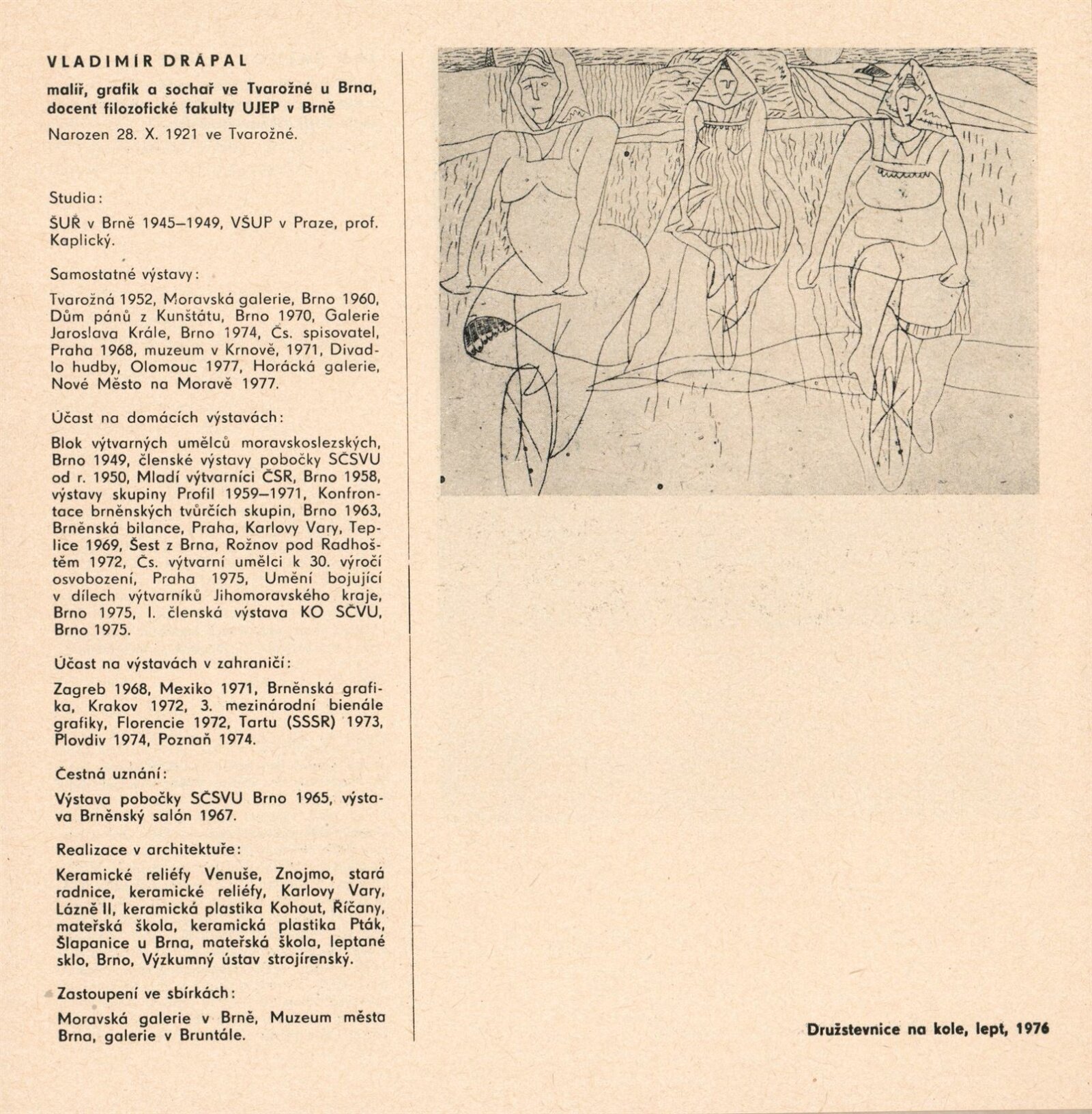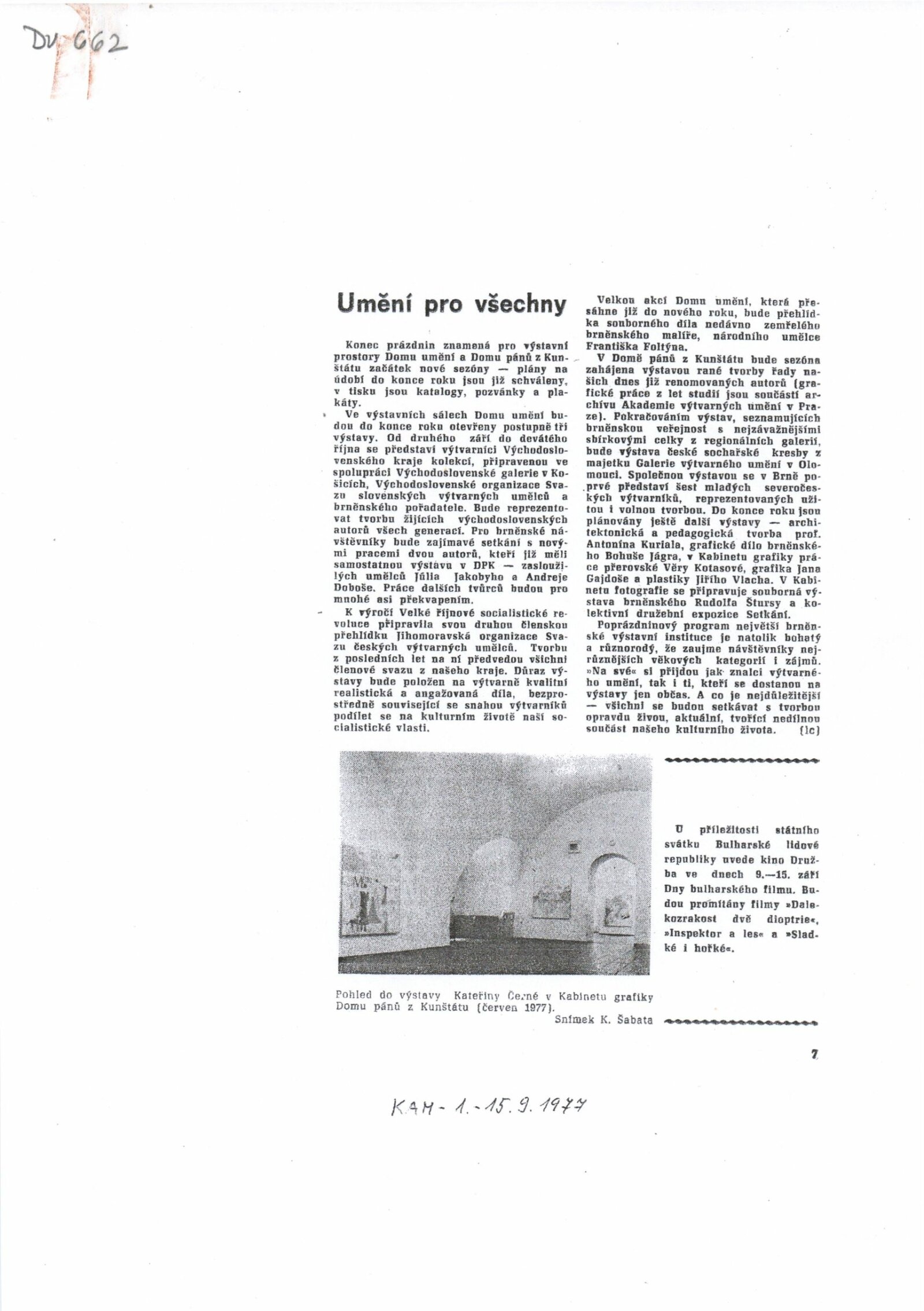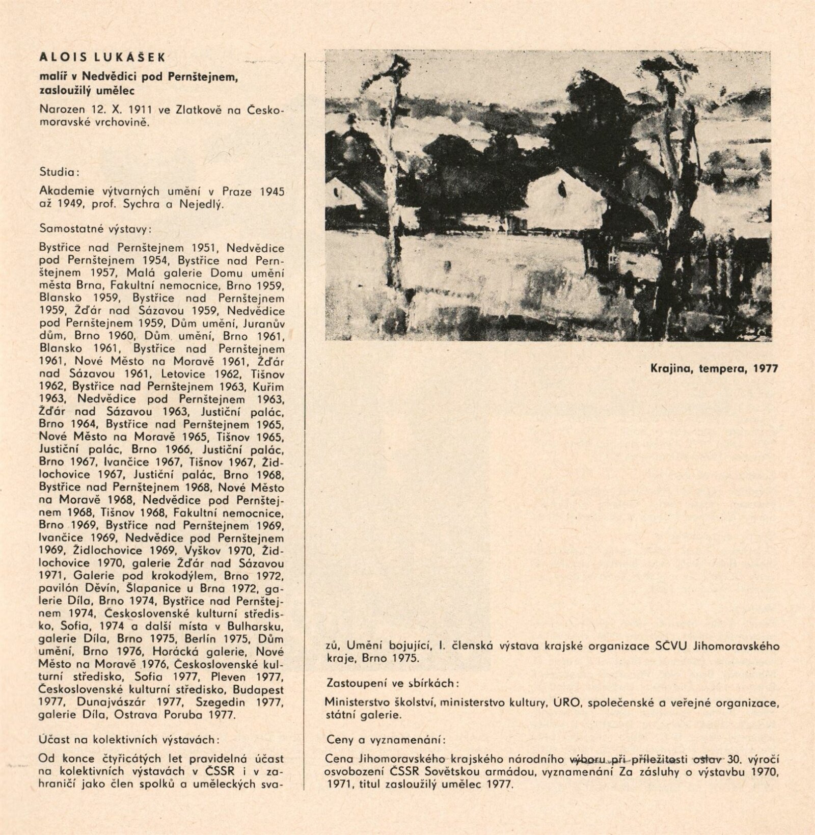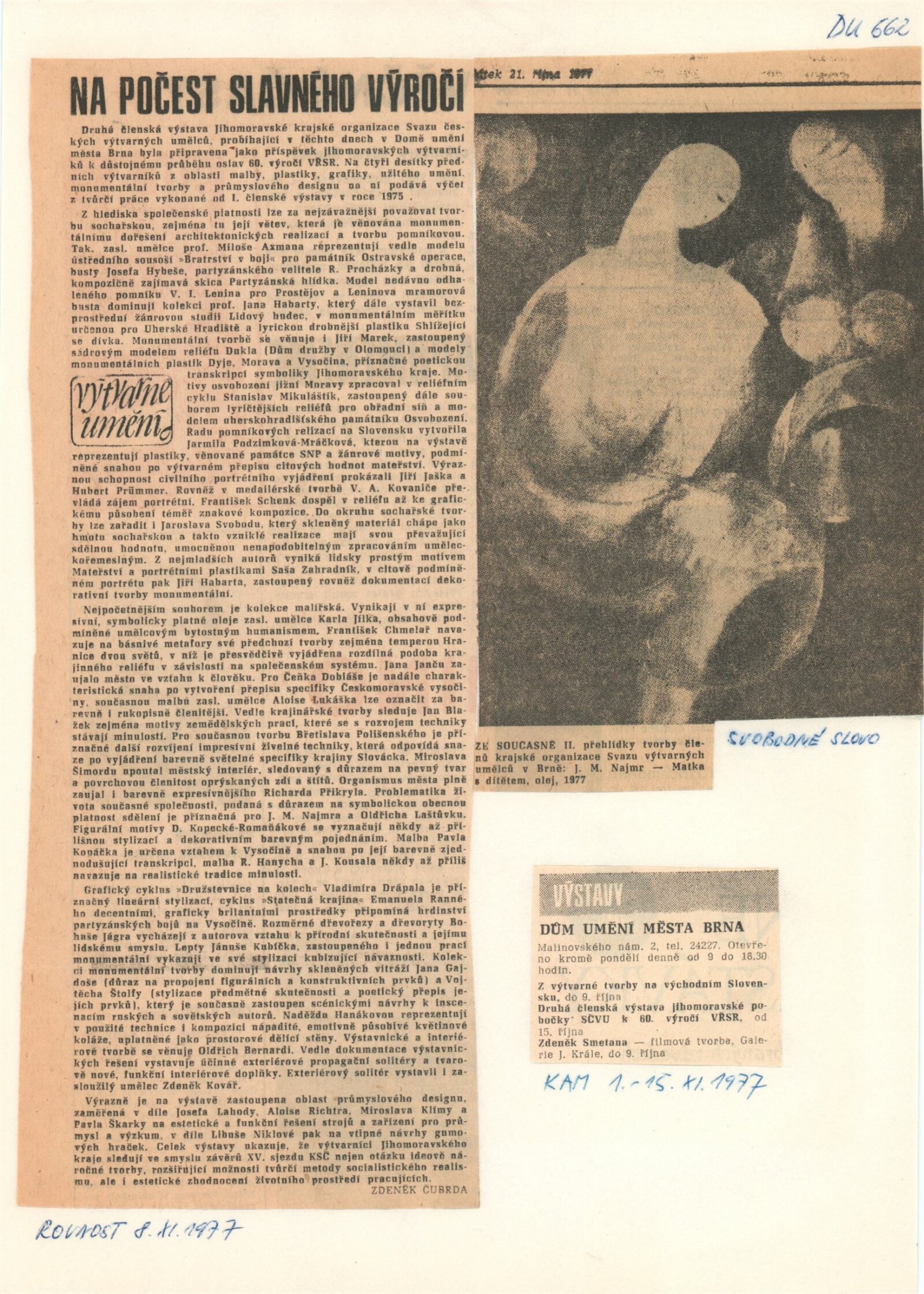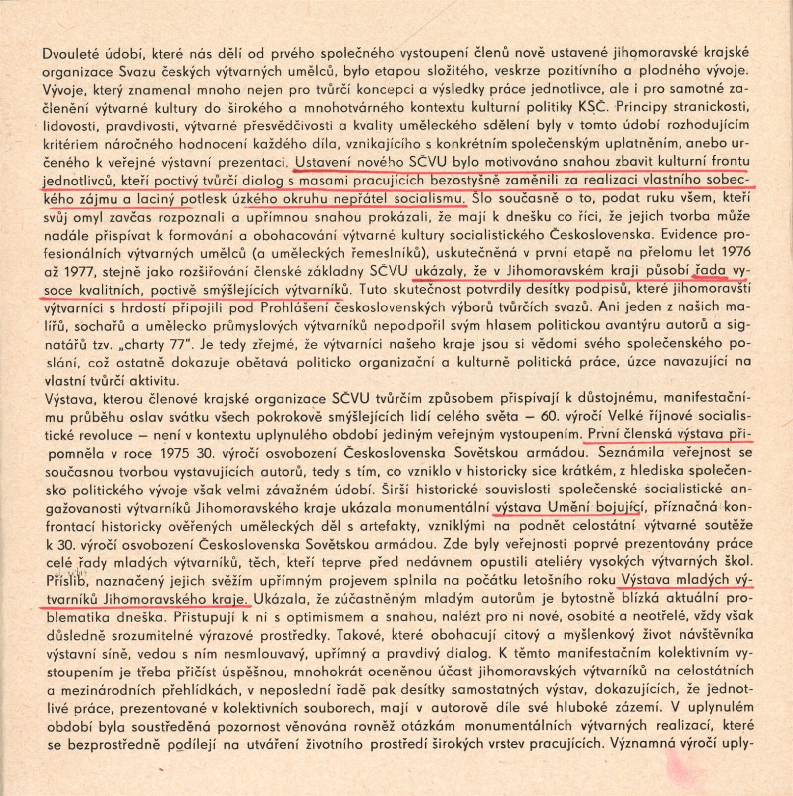 II. členská výstava krajské organizace Svazu českých výtvarných umělců Jihomoravského kraje: Dům umění města Brna, 14. 10. – 20. 11. 1977 / Text: Zdeněk Čubrda. – Brno: DUmB, 1977. – 44 s., obr., seznam prací 4 s., životní data vystavujících, DU 662
