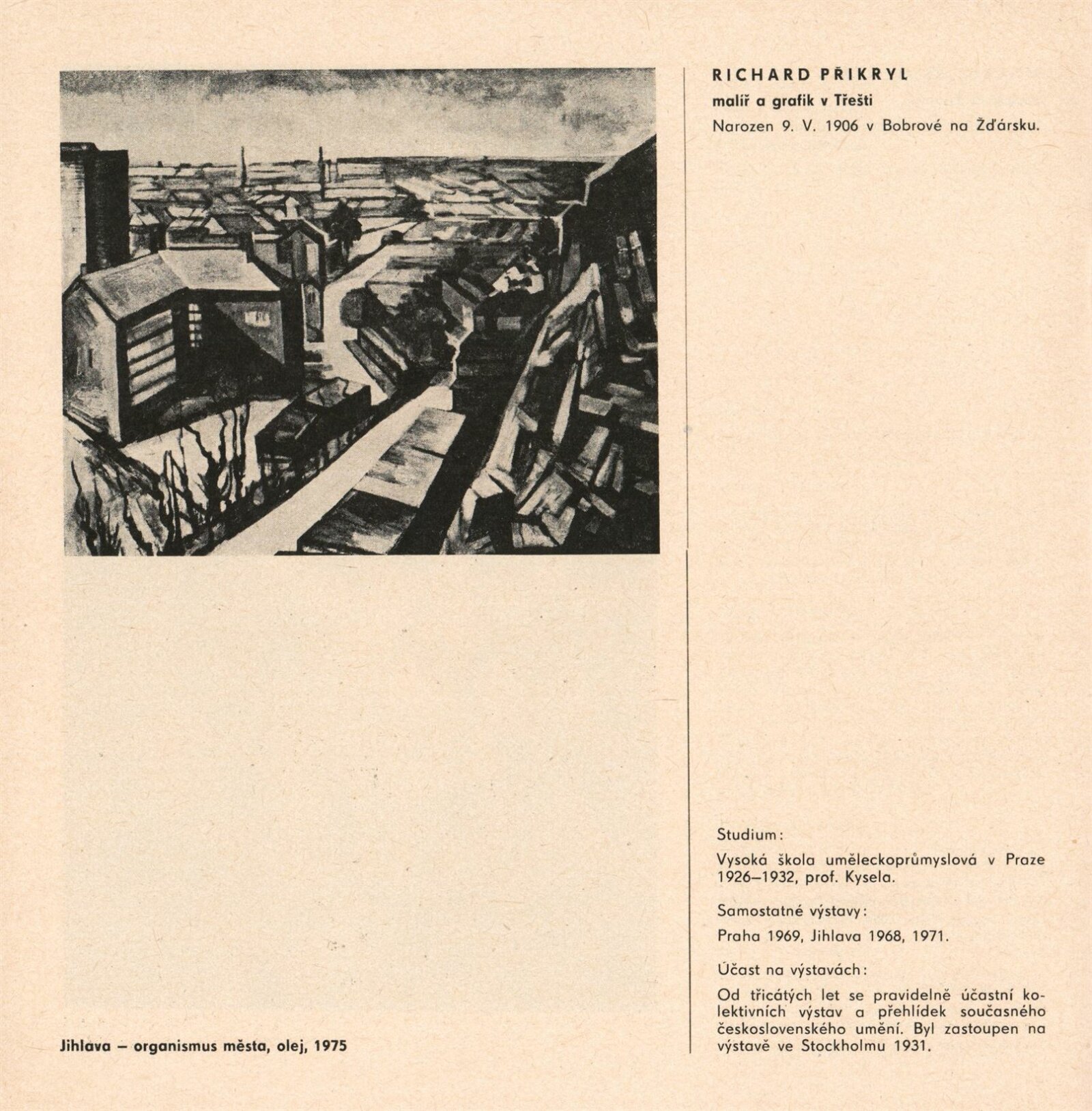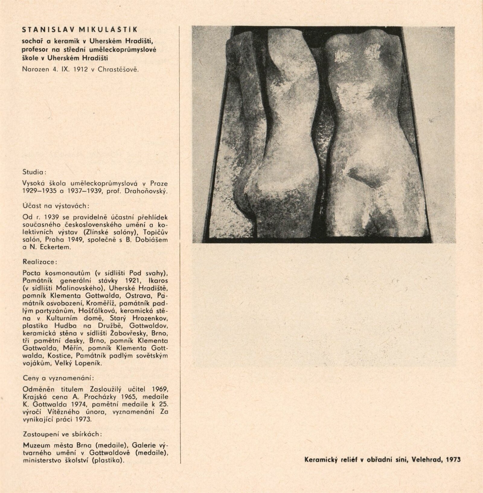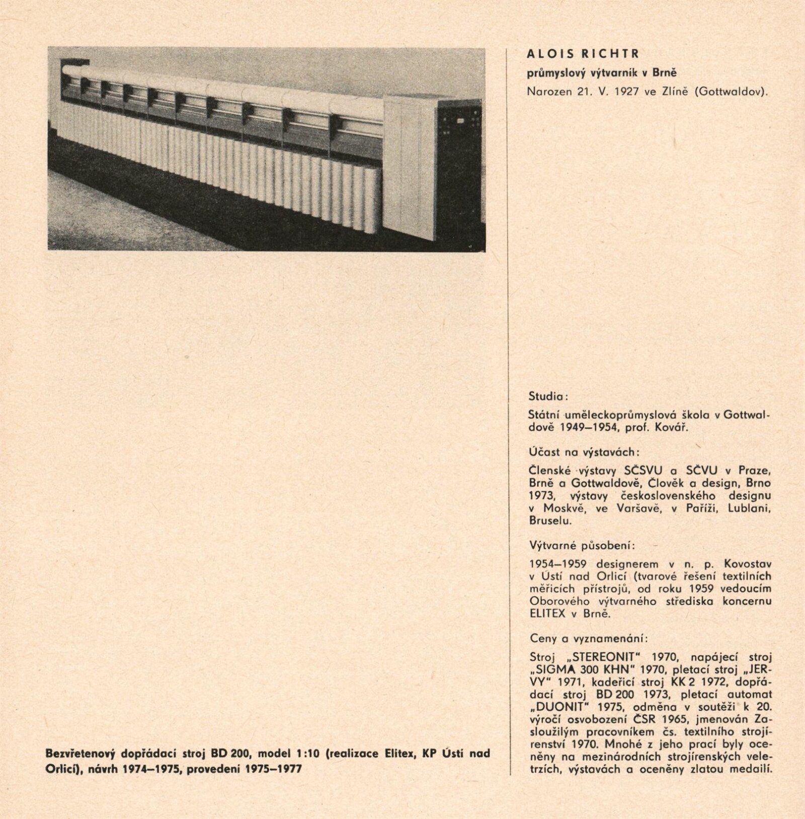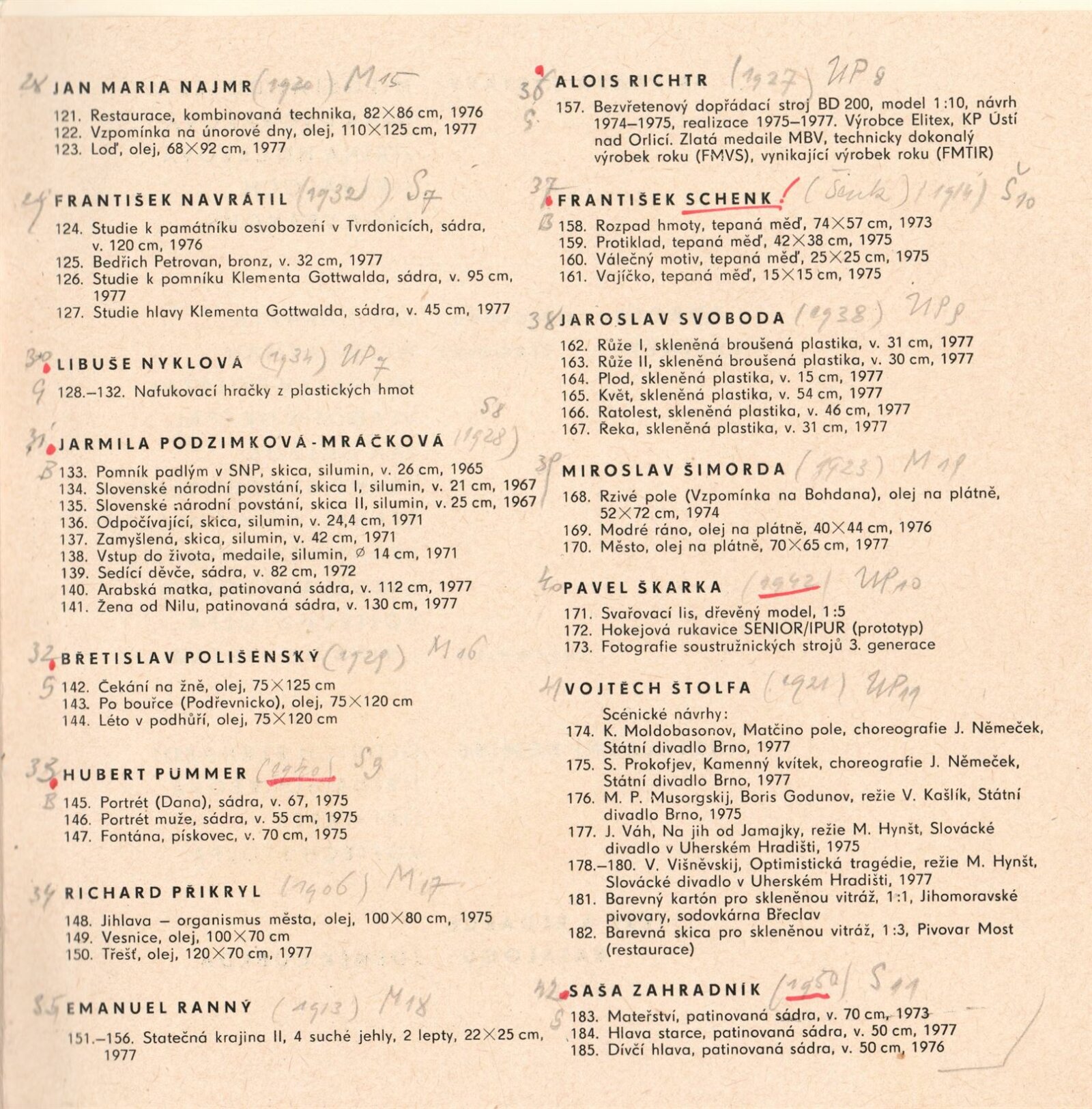 pozvánka, katalog, fotografie děl, seznamy děl, prezenční listina tiskové konference, žádost o povolení výstavy a tisku katalogu, provozní korespondence, recenze v tisku, katalog výstavy Jiřího Jašky v Slováckém muzeu v Uherském Hradišti s fotografiemi děl, katalog výstavy Václava Adolfa Kovaniče v Okresním vlastivědném muzeu Mikulov (1965), Design v teorii a praxi z roku 1973 obsahující designové práce Aloise Richtra a Josefa Lahody