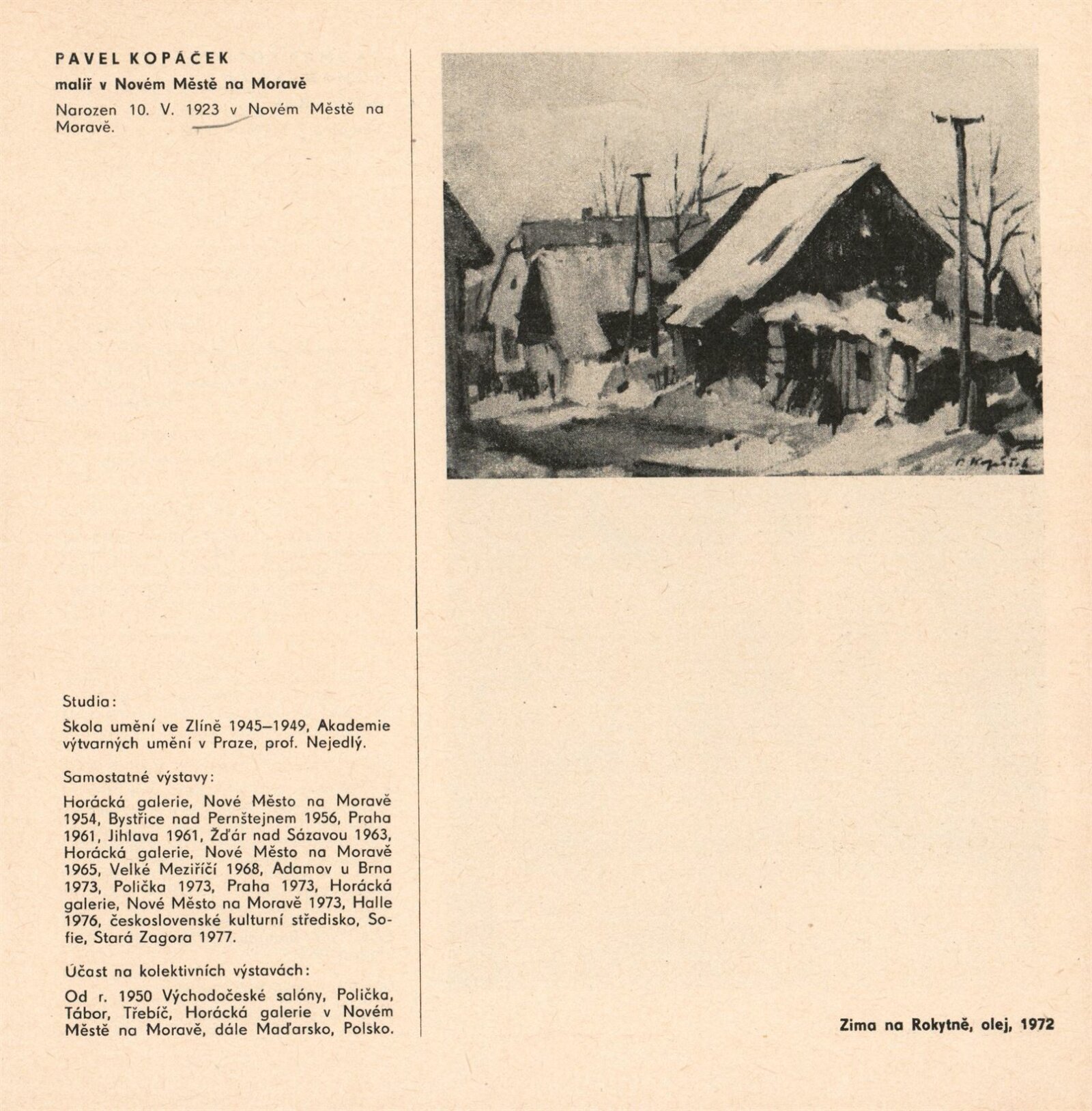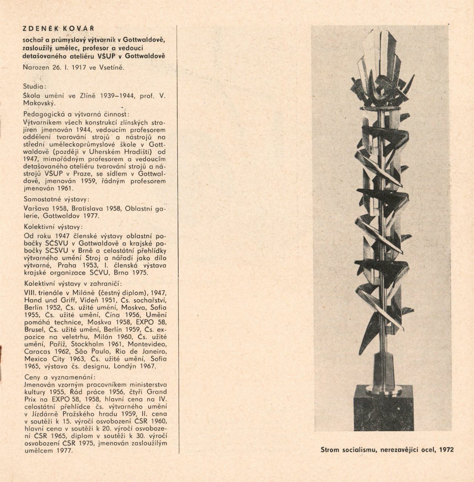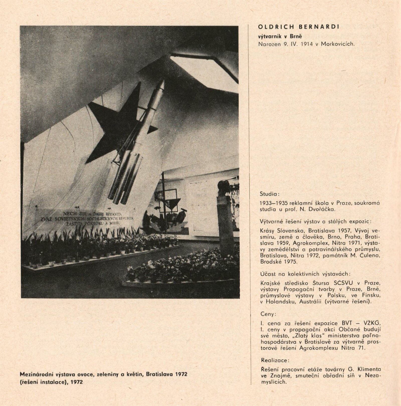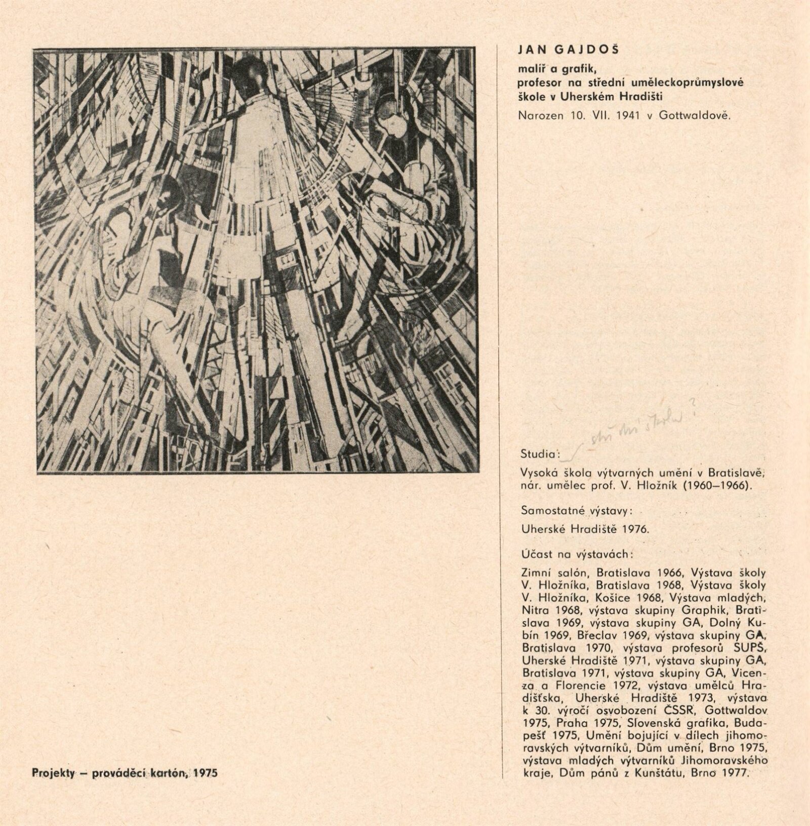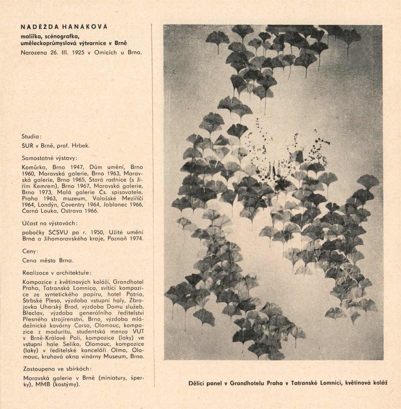 pozvánka, katalog, fotografie děl, seznamy děl, prezenční listina tiskové konference, žádost o povolení výstavy a tisku katalogu, provozní korespondence, recenze v tisku, katalog výstavy Jiřího Jašky v Slováckém muzeu v Uherském Hradišti s fotografiemi děl, katalog výstavy Václava Adolfa Kovaniče v Okresním vlastivědném muzeu Mikulov (1965), Design v teorii a praxi z roku 1973 obsahující designové práce Aloise Richtra a Josefa Lahody