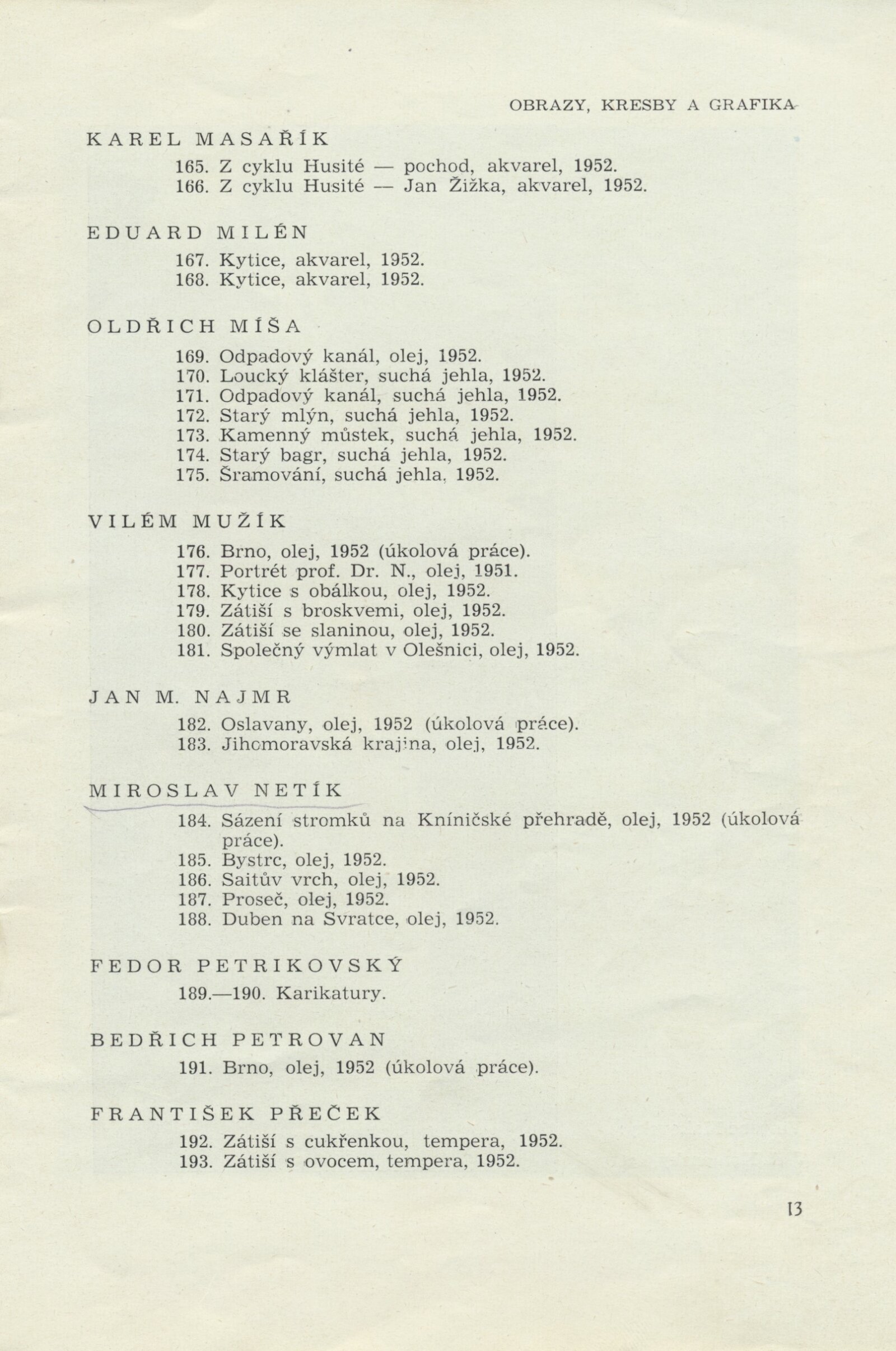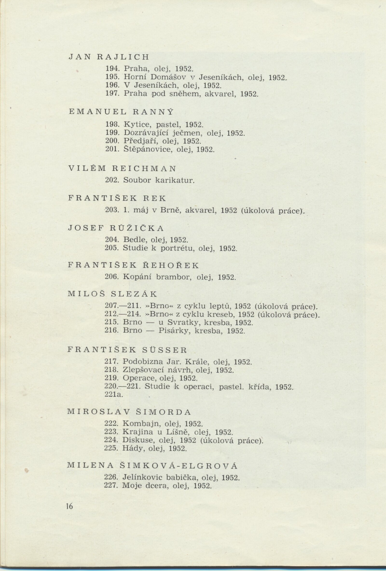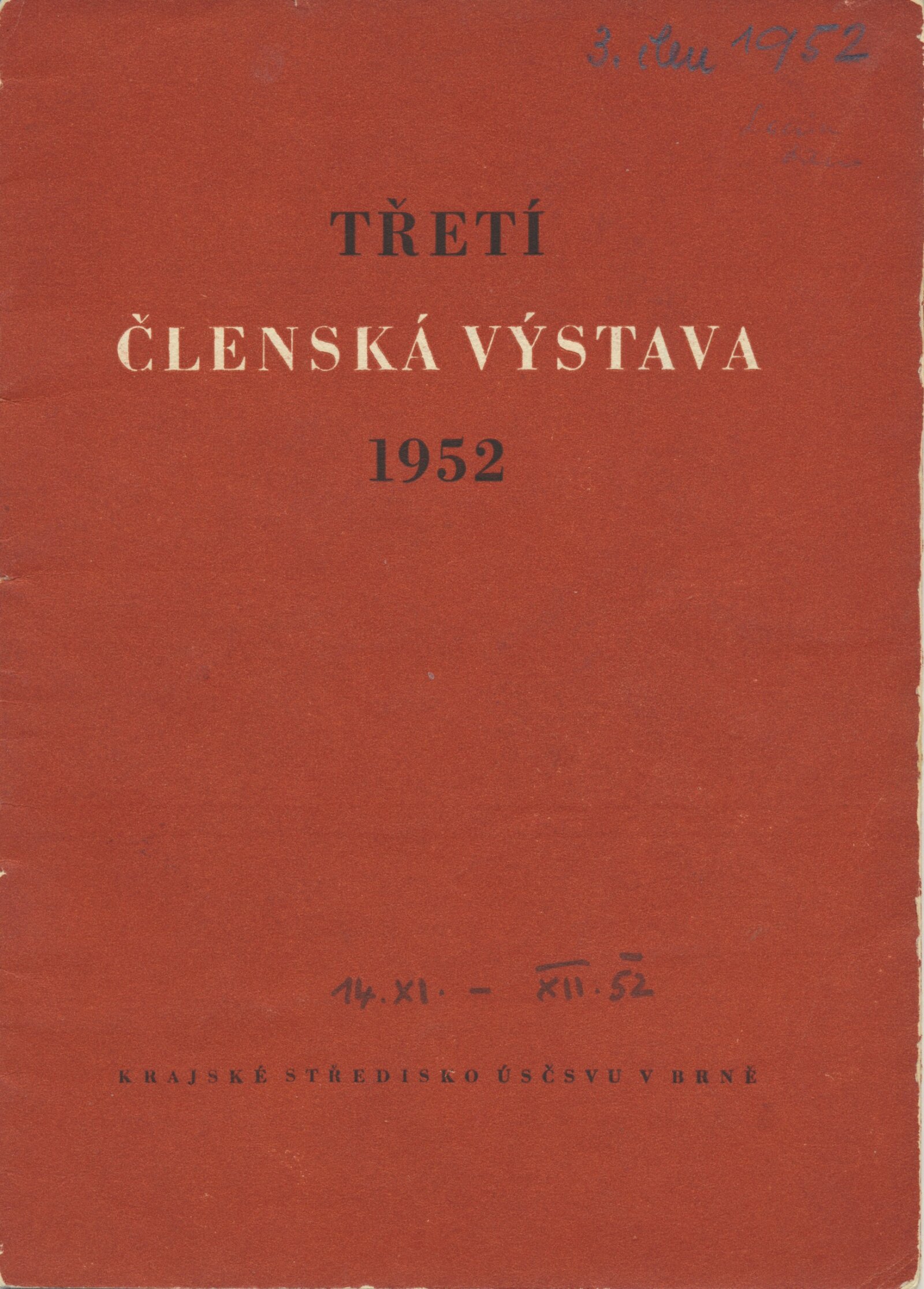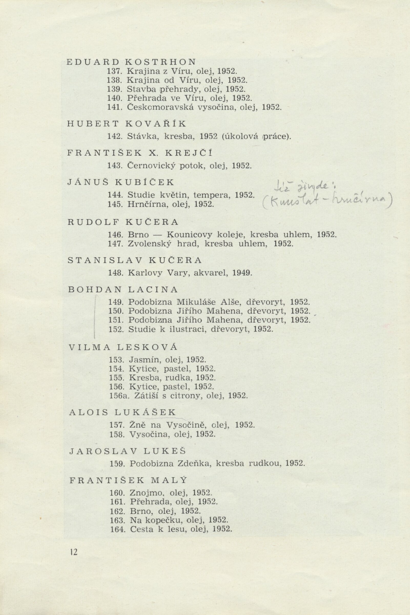 III. členská výstava krajského střediska ÚSČSVU v Brně: Dům umění města Brna, 14. 11. 1952 – 1. 1. 1953 / Text: František Kubišta. – Brno: ÚSČSVU, 1952. – 23 s., obr., DU 178. – MZK; MG; MMB